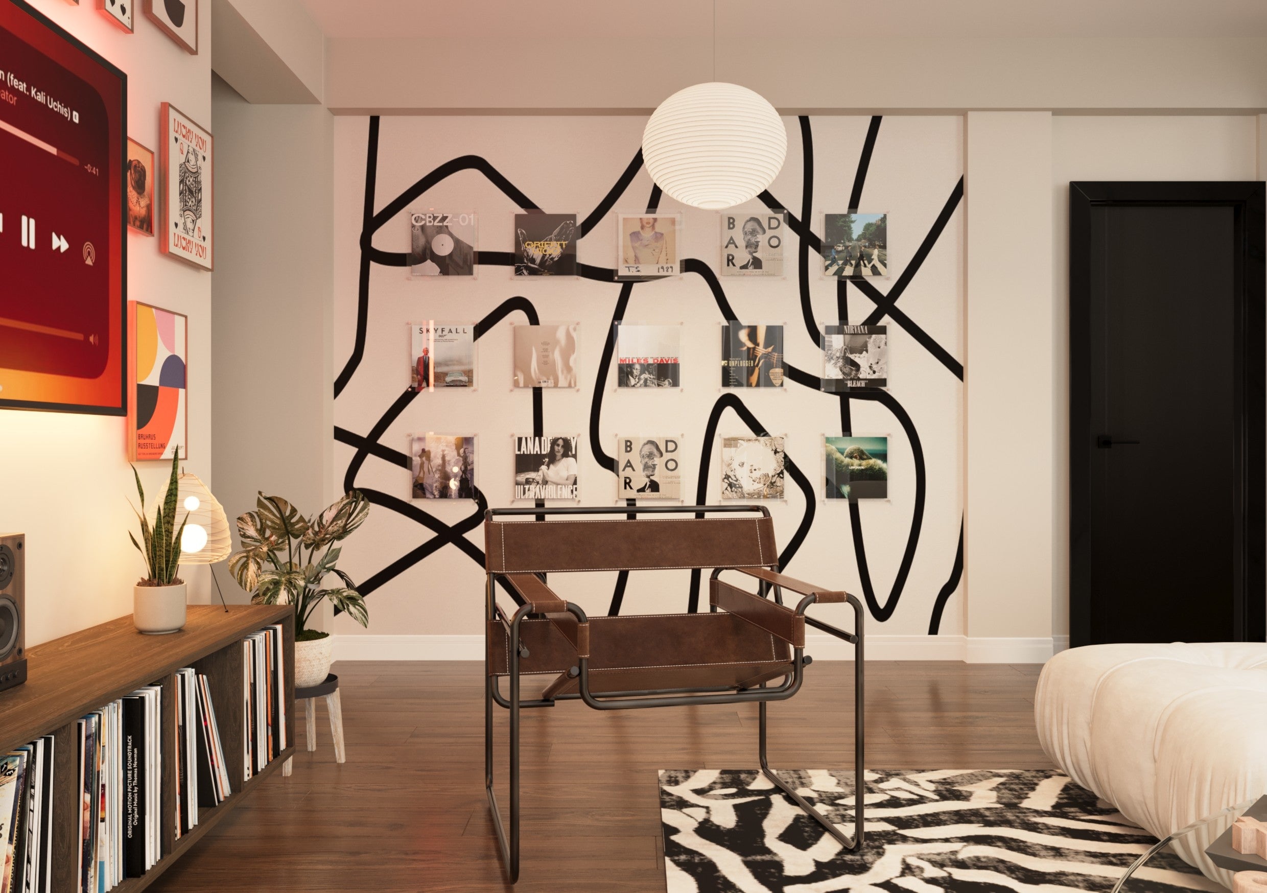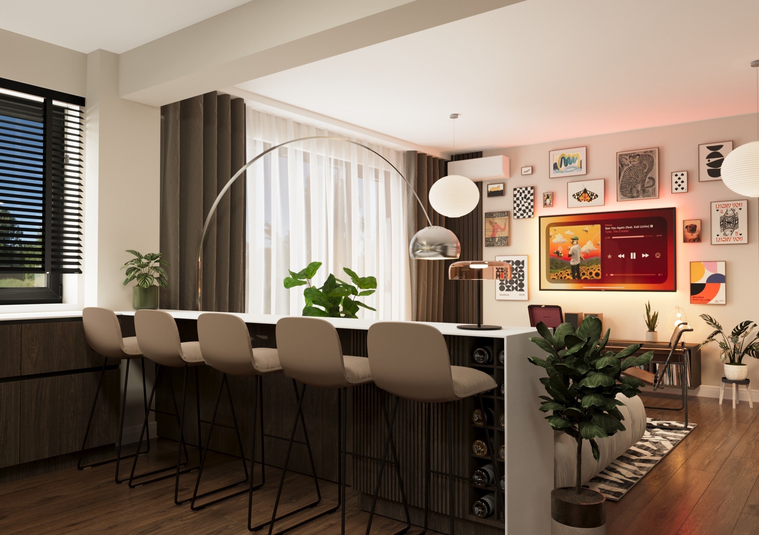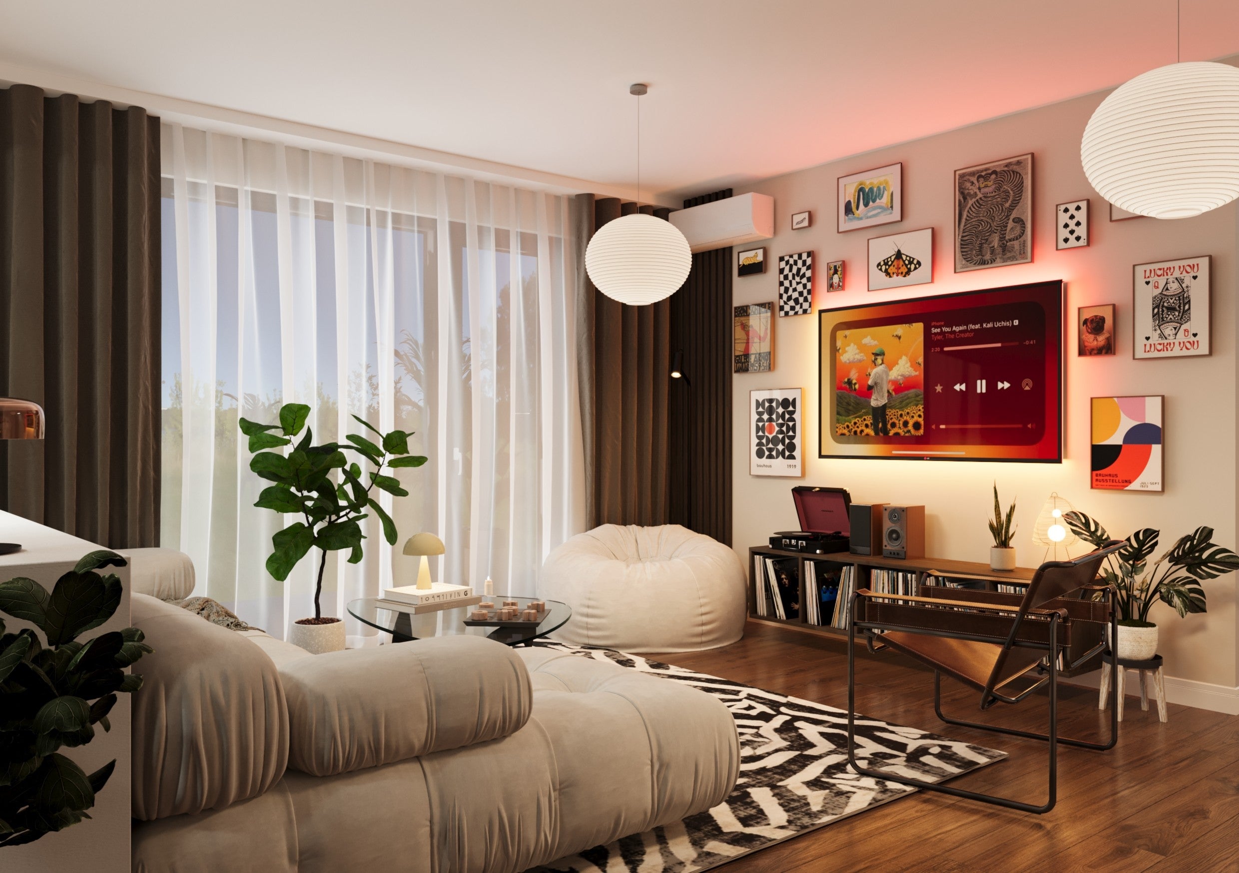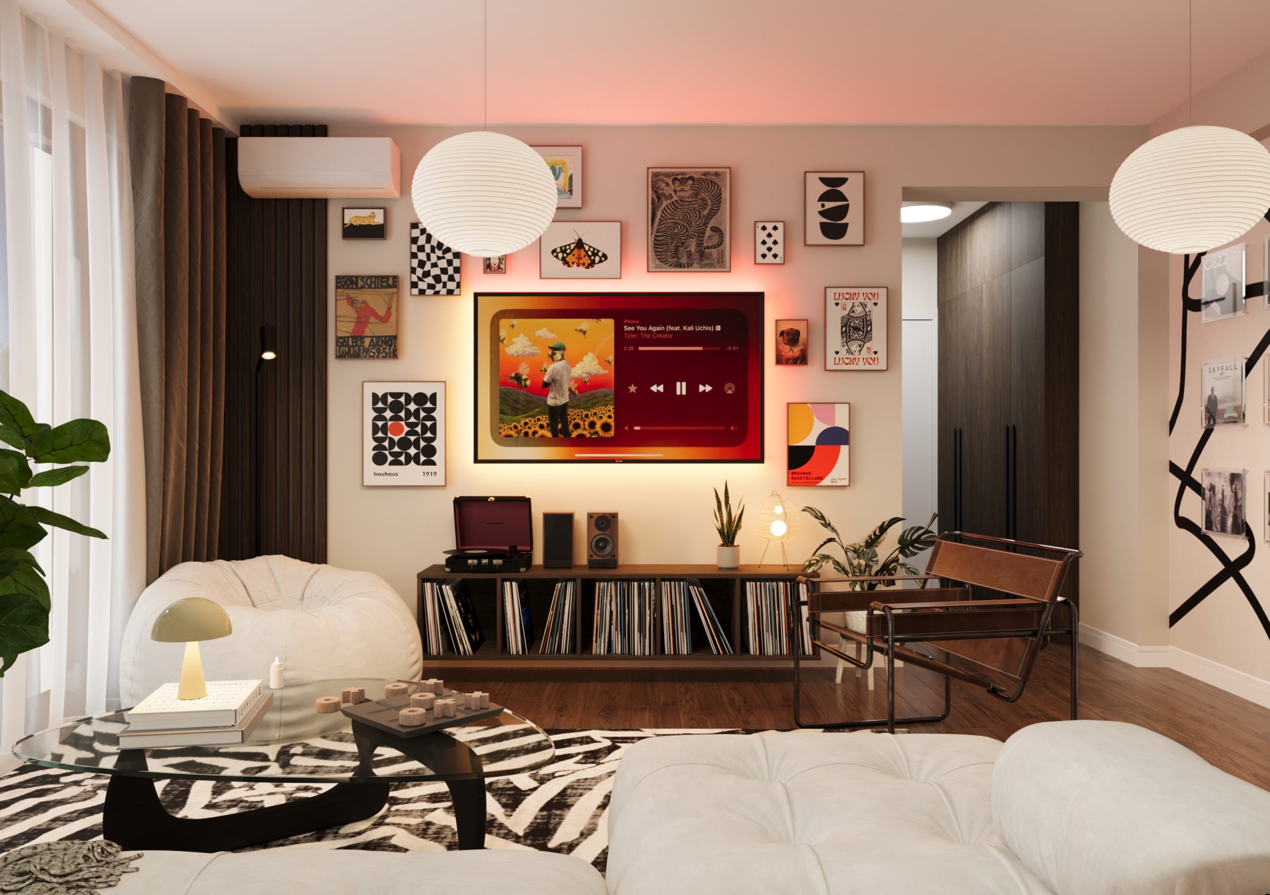 „Put on your favorite vinyl and let the design set the mood.” Acest proiect combină tonuri naturale cu finisaje calde de lemn, creând un ambient relaxant și primitor. Accentele de verde aduc prospețime și vitalitate spațiului, iar atmosfera retro completează experiența vizuală și senzorială, transformând fiecare colț într-un loc unde stilul și confortul se întâlnesc armonios.