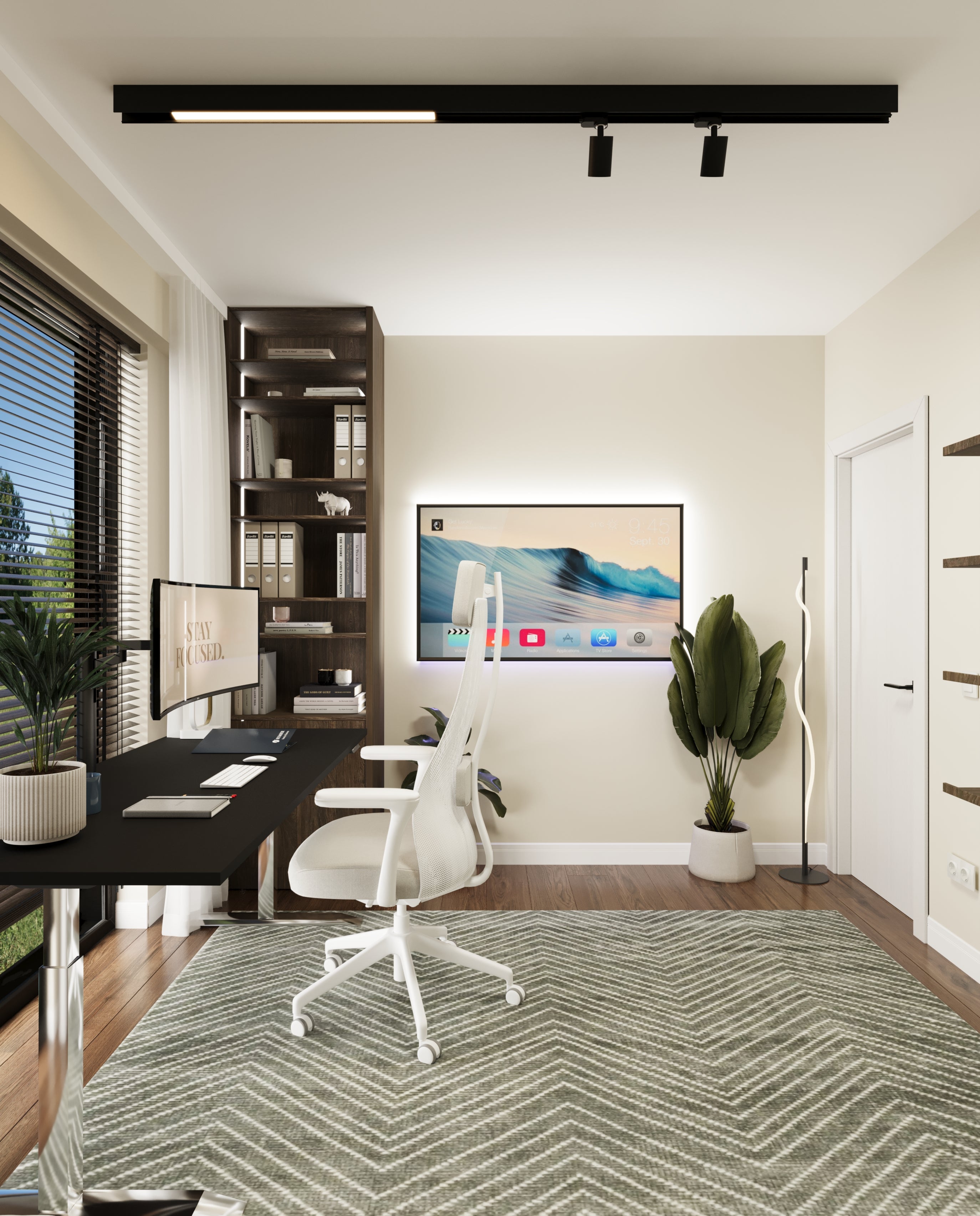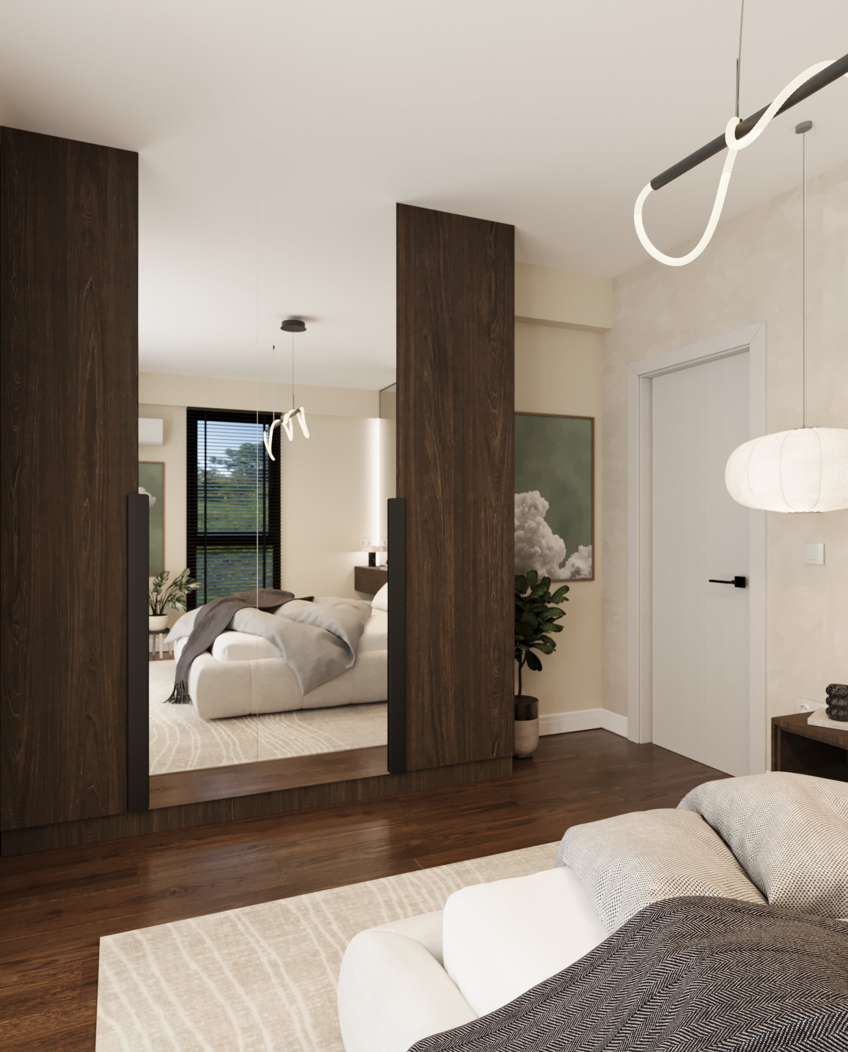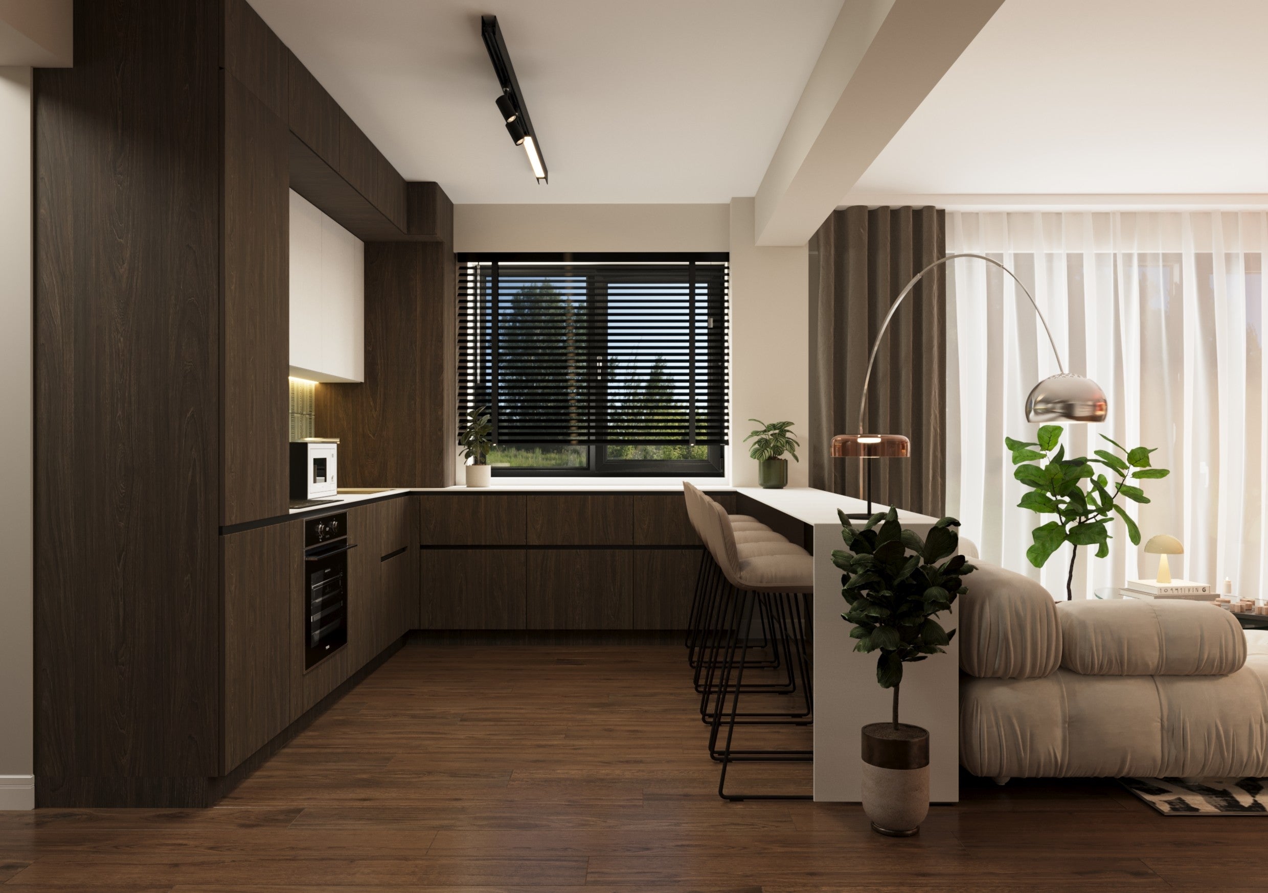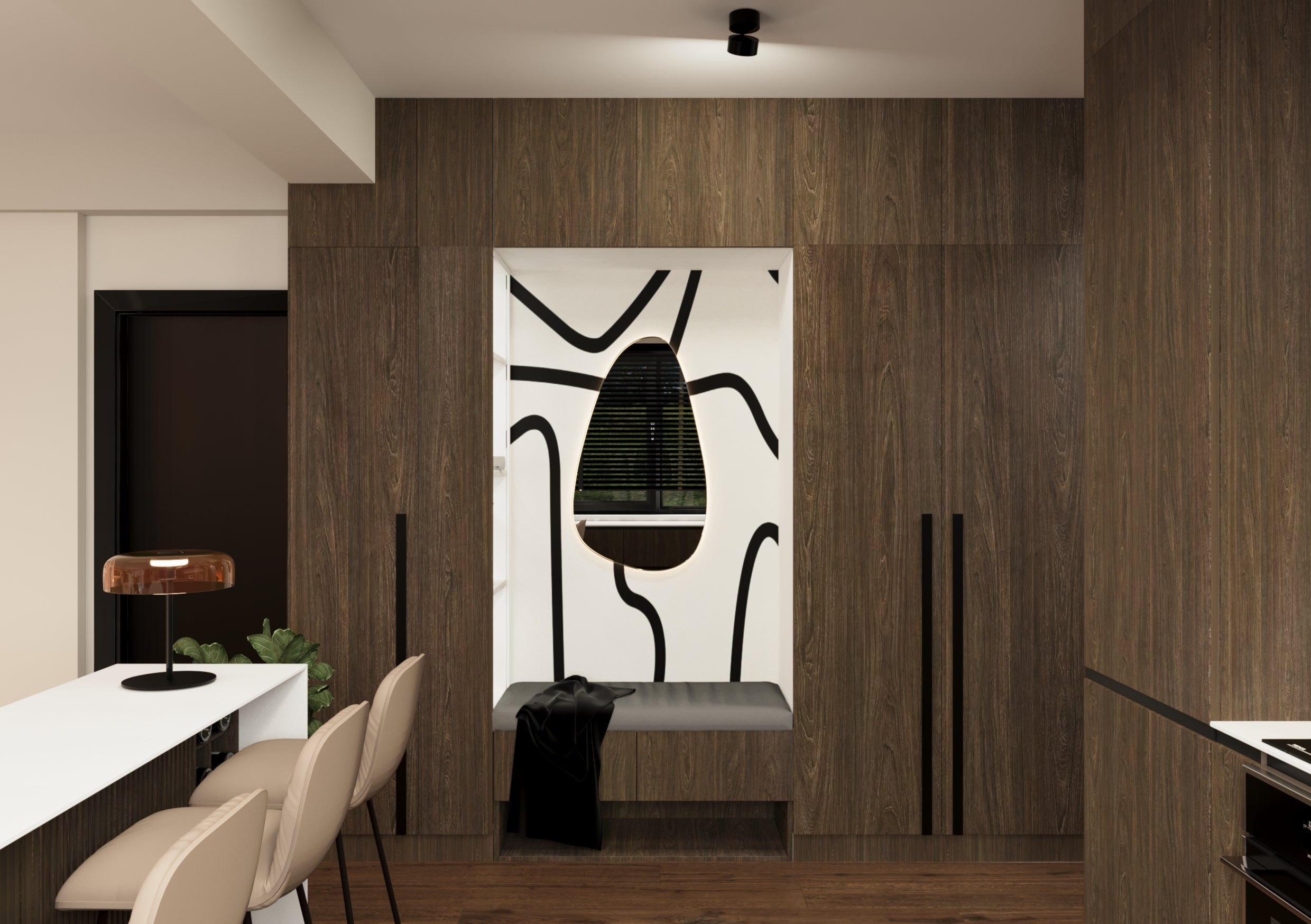 „Put on your favorite vinyl and let the design set the mood.” Acest proiect combină tonuri naturale cu finisaje calde de lemn, creând un ambient relaxant și primitor. Accentele de verde aduc prospețime și vitalitate spațiului, iar atmosfera retro completează experiența vizuală și senzorială, transformând fiecare colț într-un loc unde stilul și confortul se întâlnesc armonios.