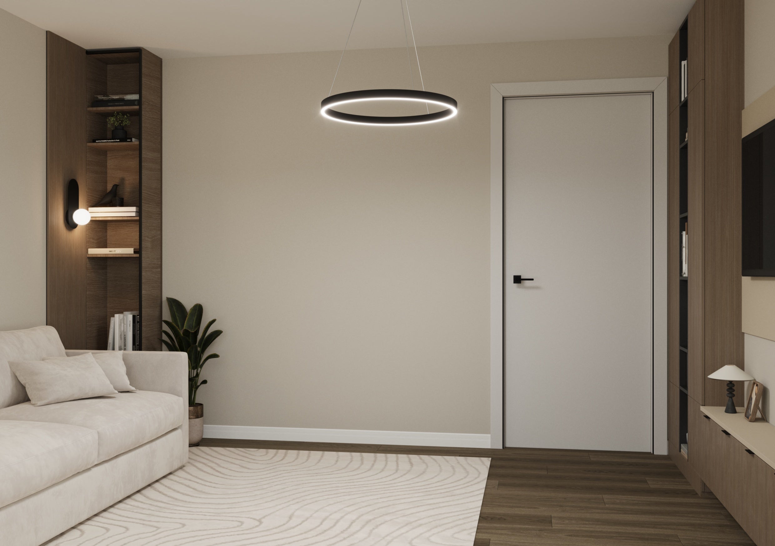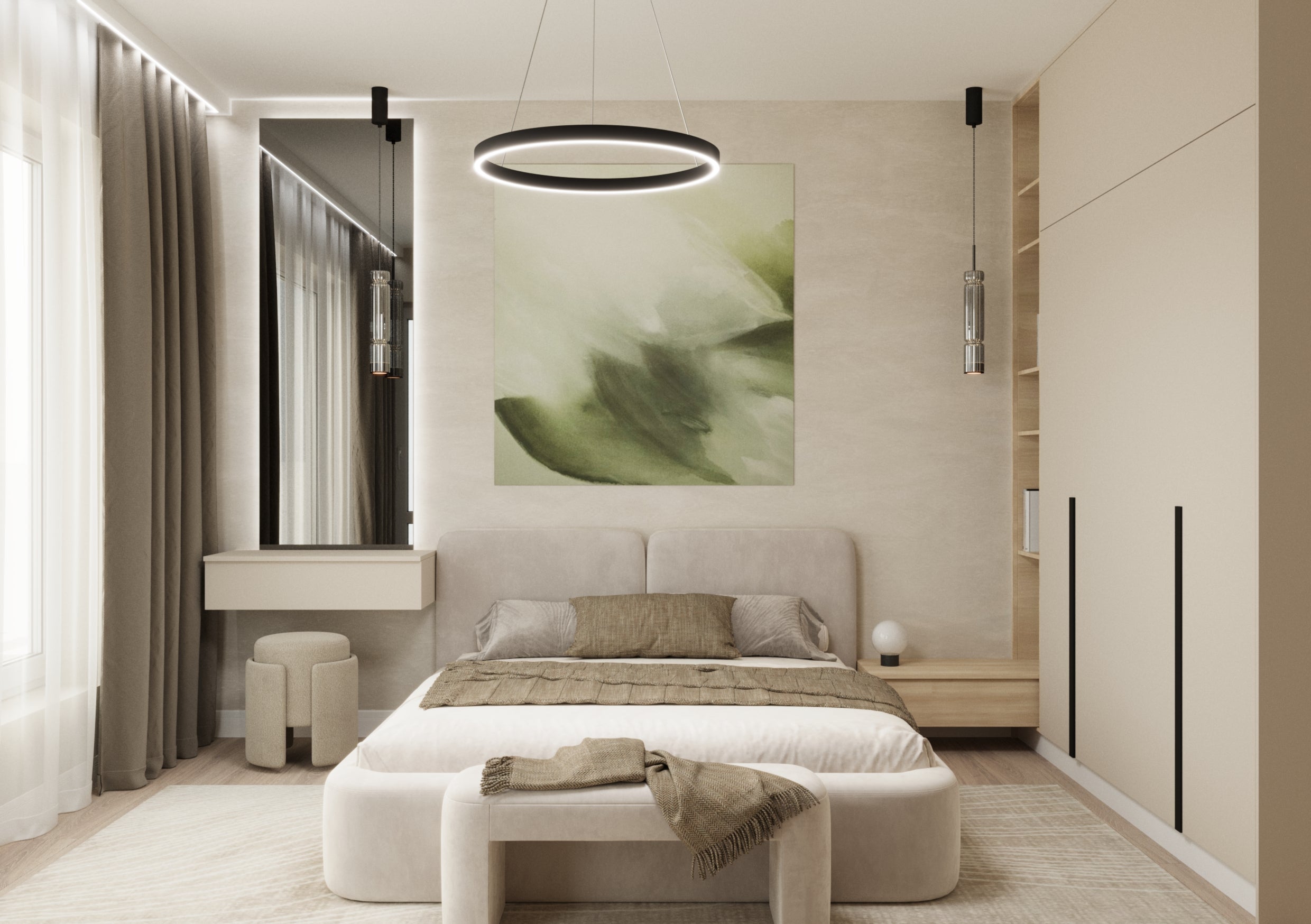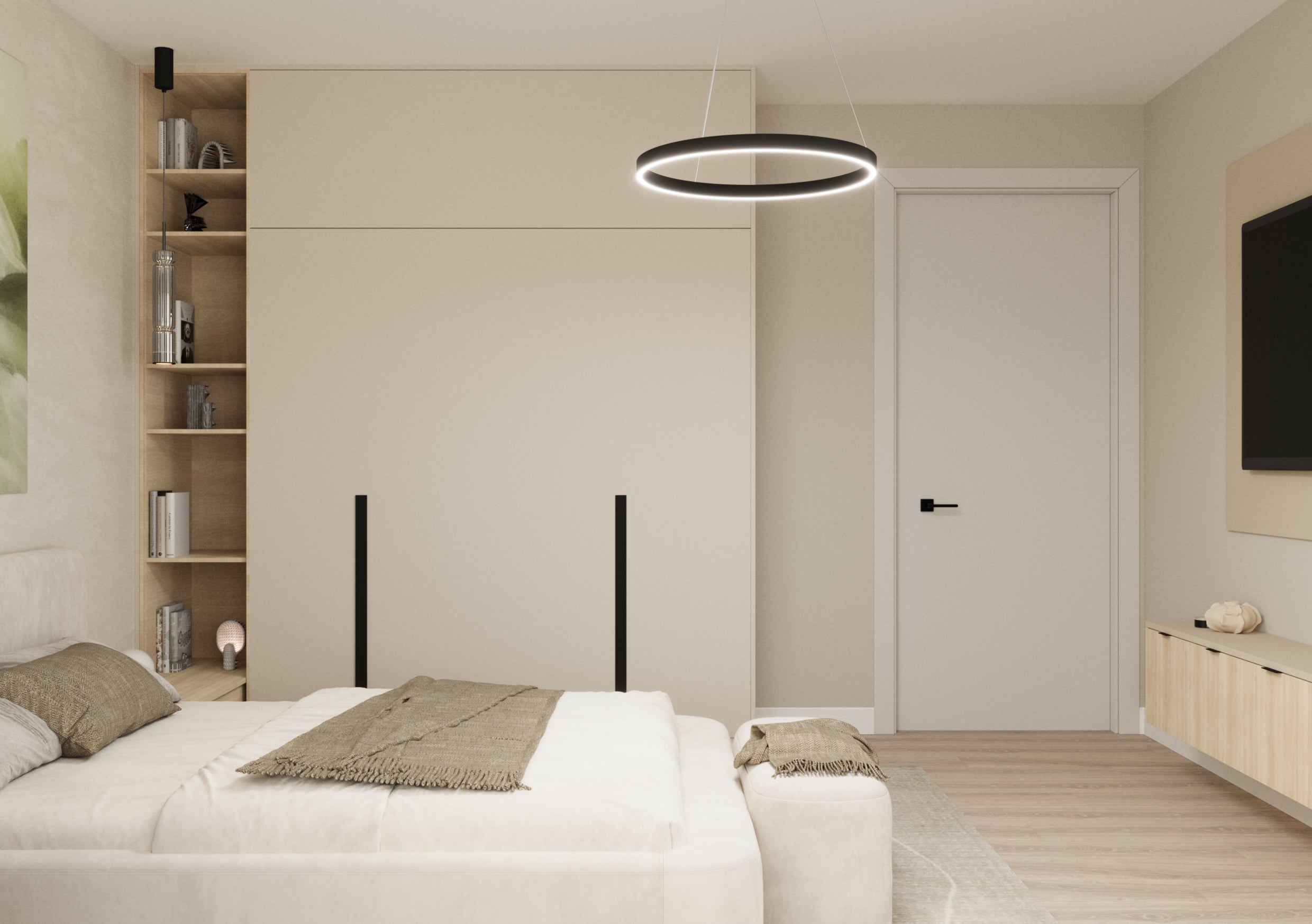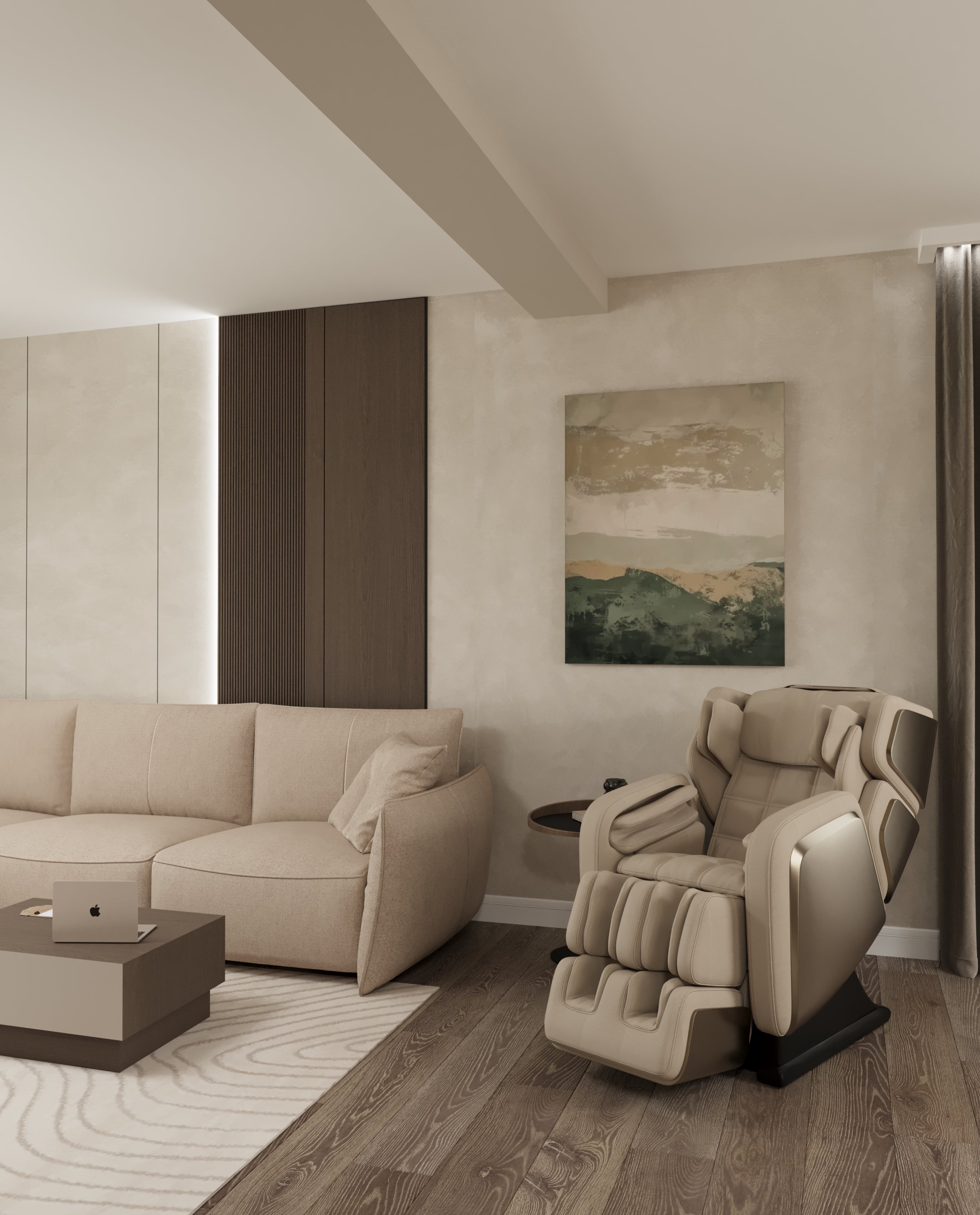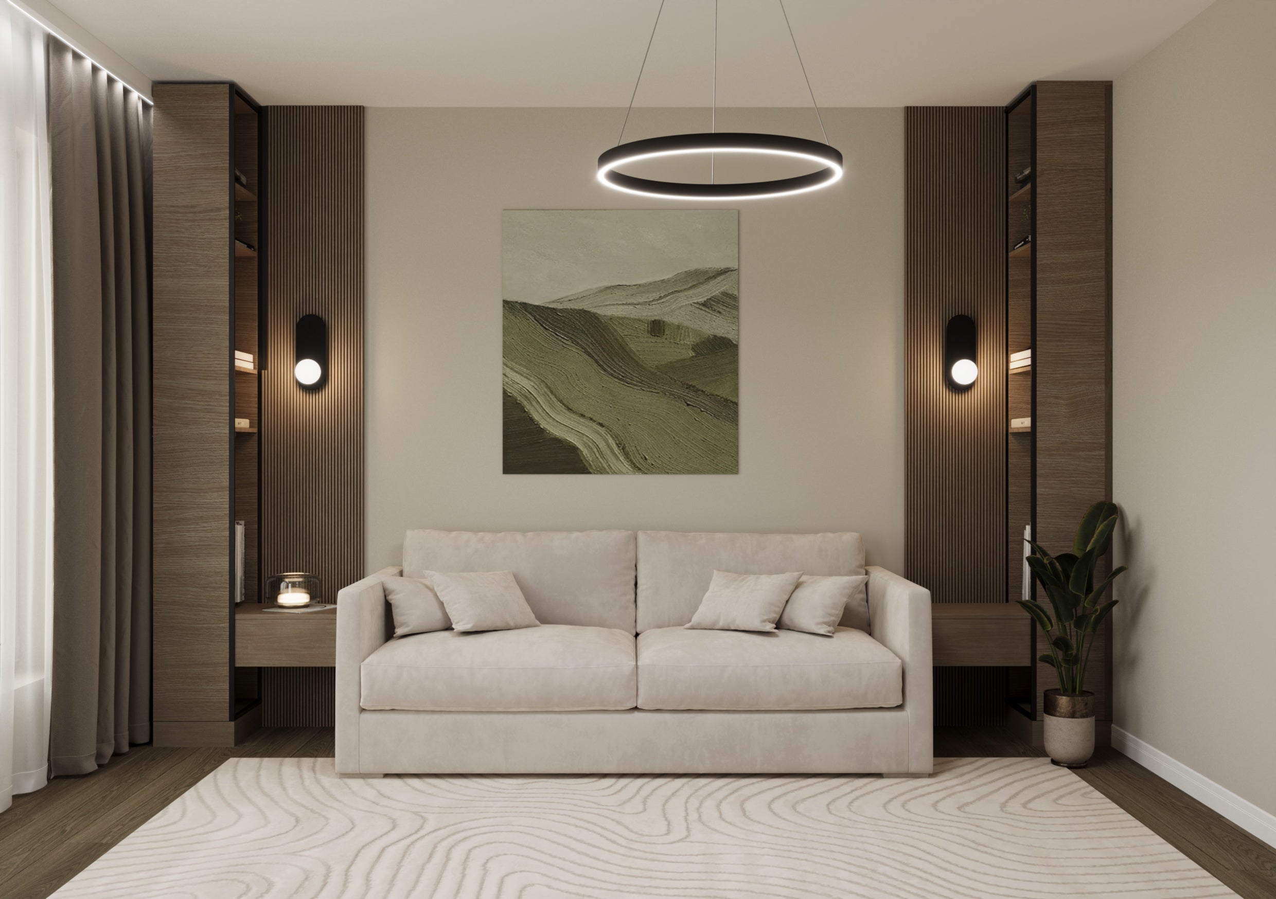Un design contemporan în tonuri și finisaje naturale, unde riflajele din lemn adaugă textură și profunzime. Accentele de verde aduc prospețime și echilibru, completând armonios atmosfera caldă, organică și relaxantă a spațiului.