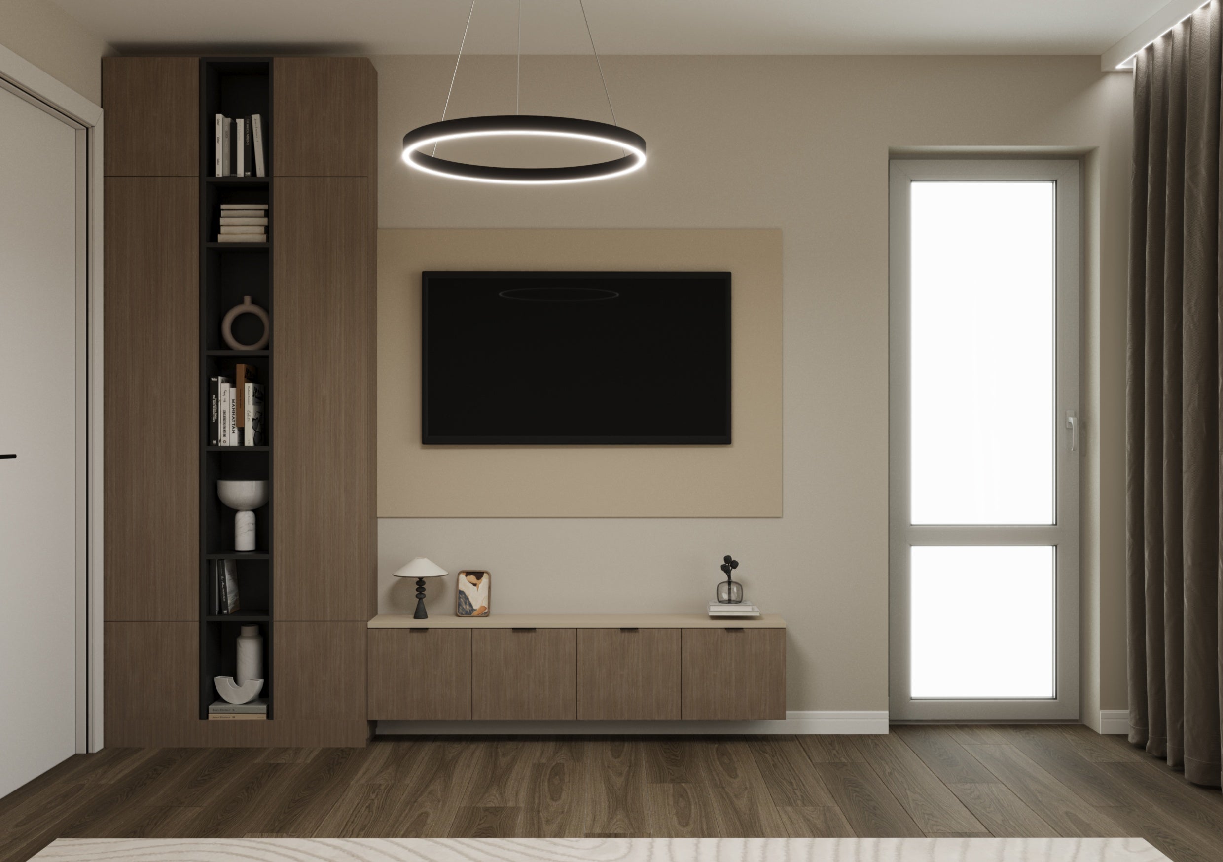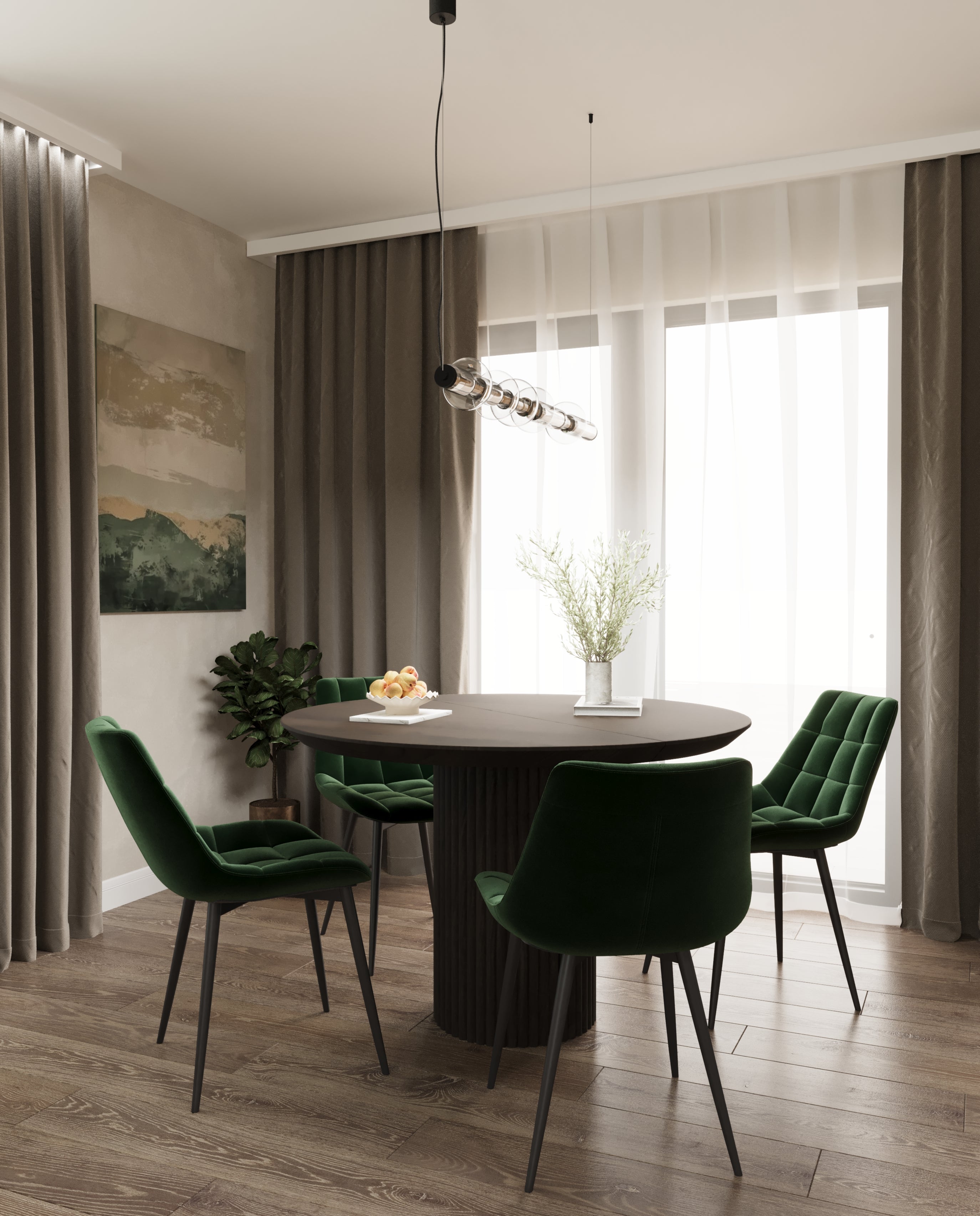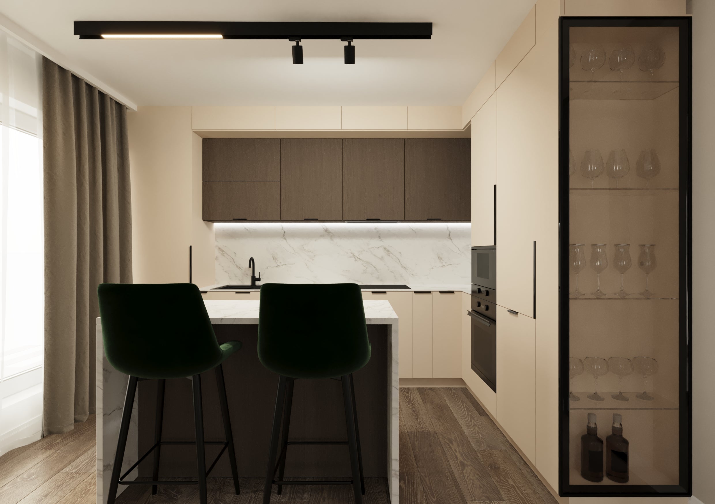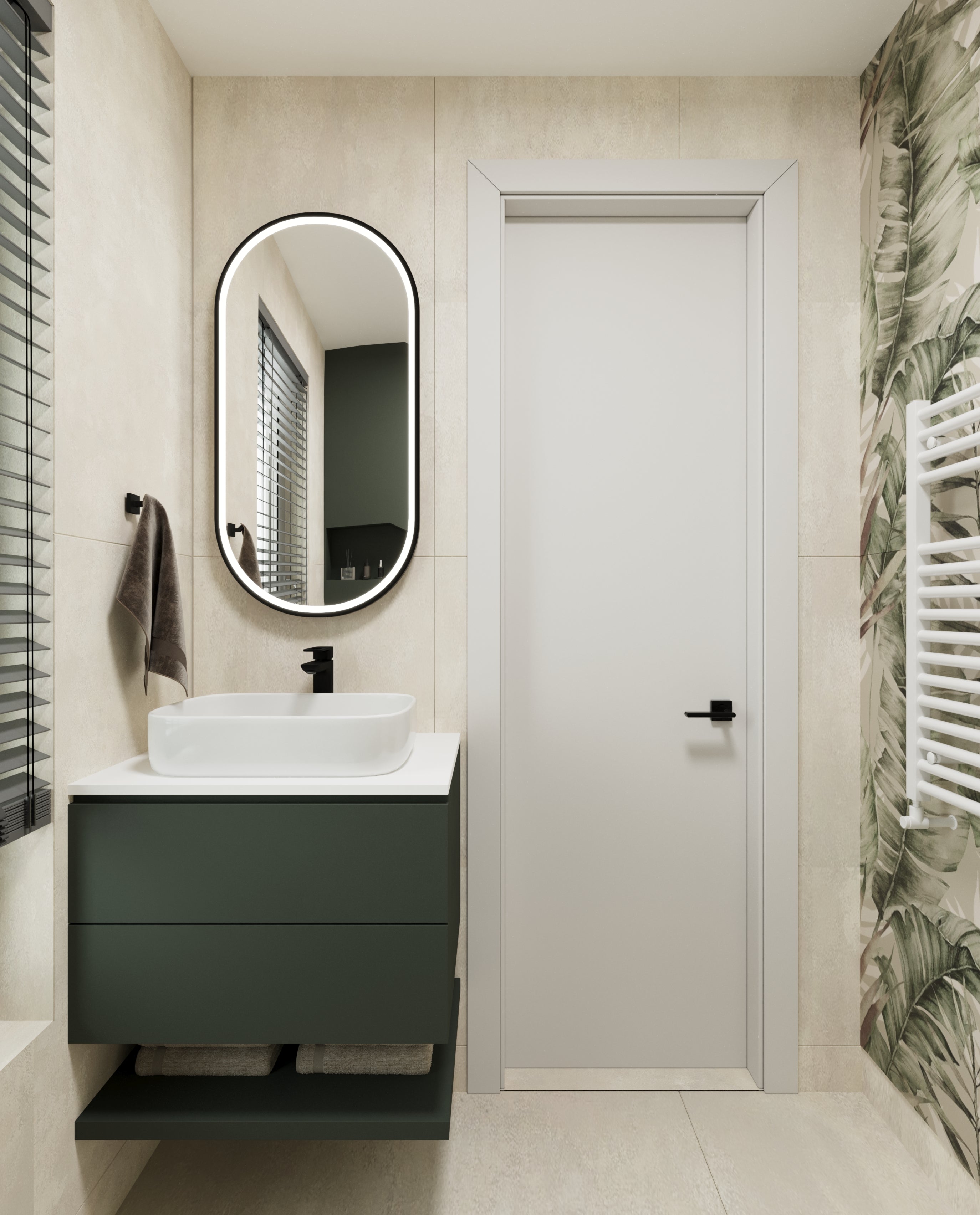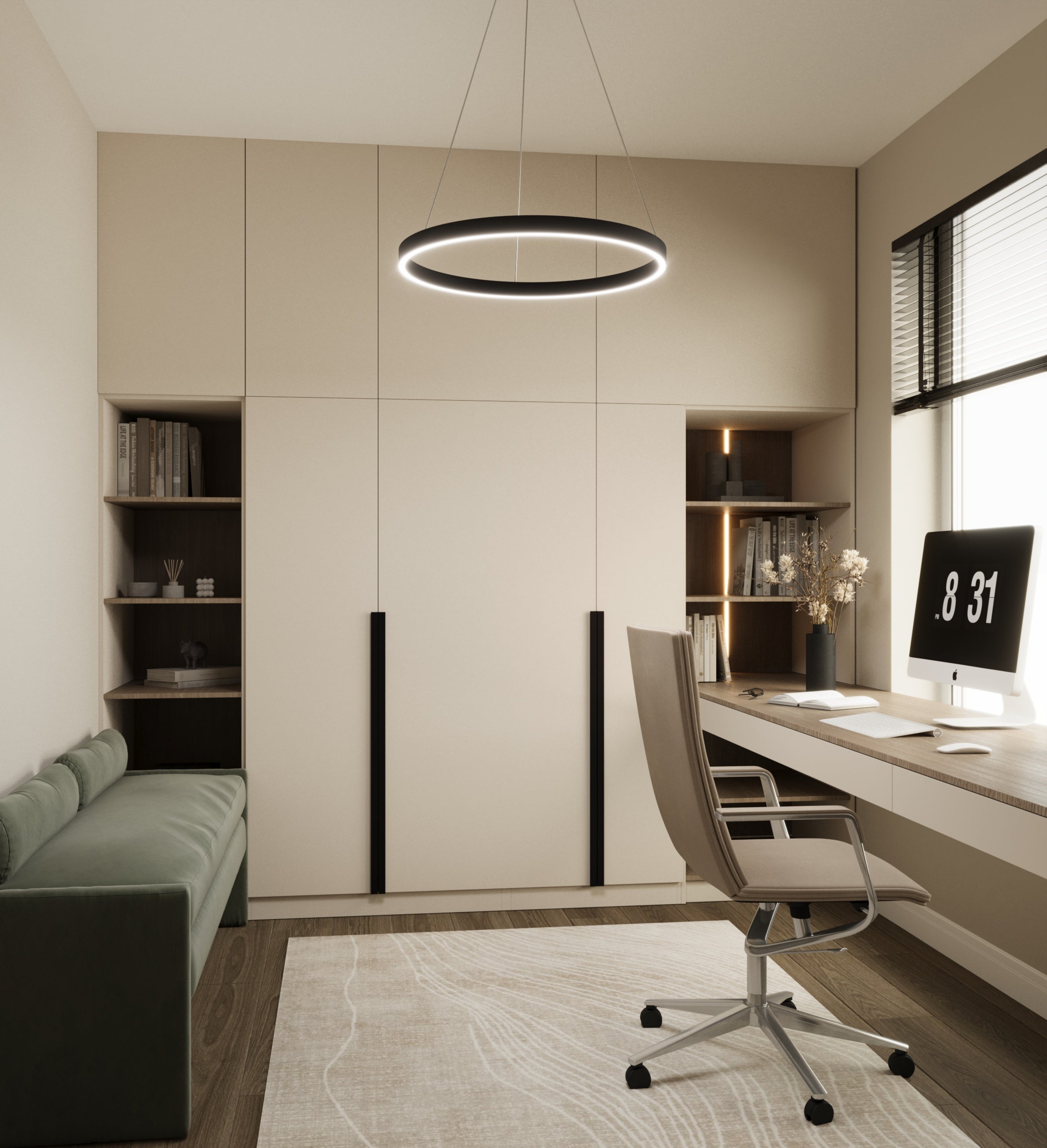 Un design contemporan în tonuri și finisaje naturale, unde riflajele din lemn adaugă textură și profunzime. Accentele de verde aduc prospețime și echilibru, completând armonios atmosfera caldă, organică și relaxantă a spațiului.