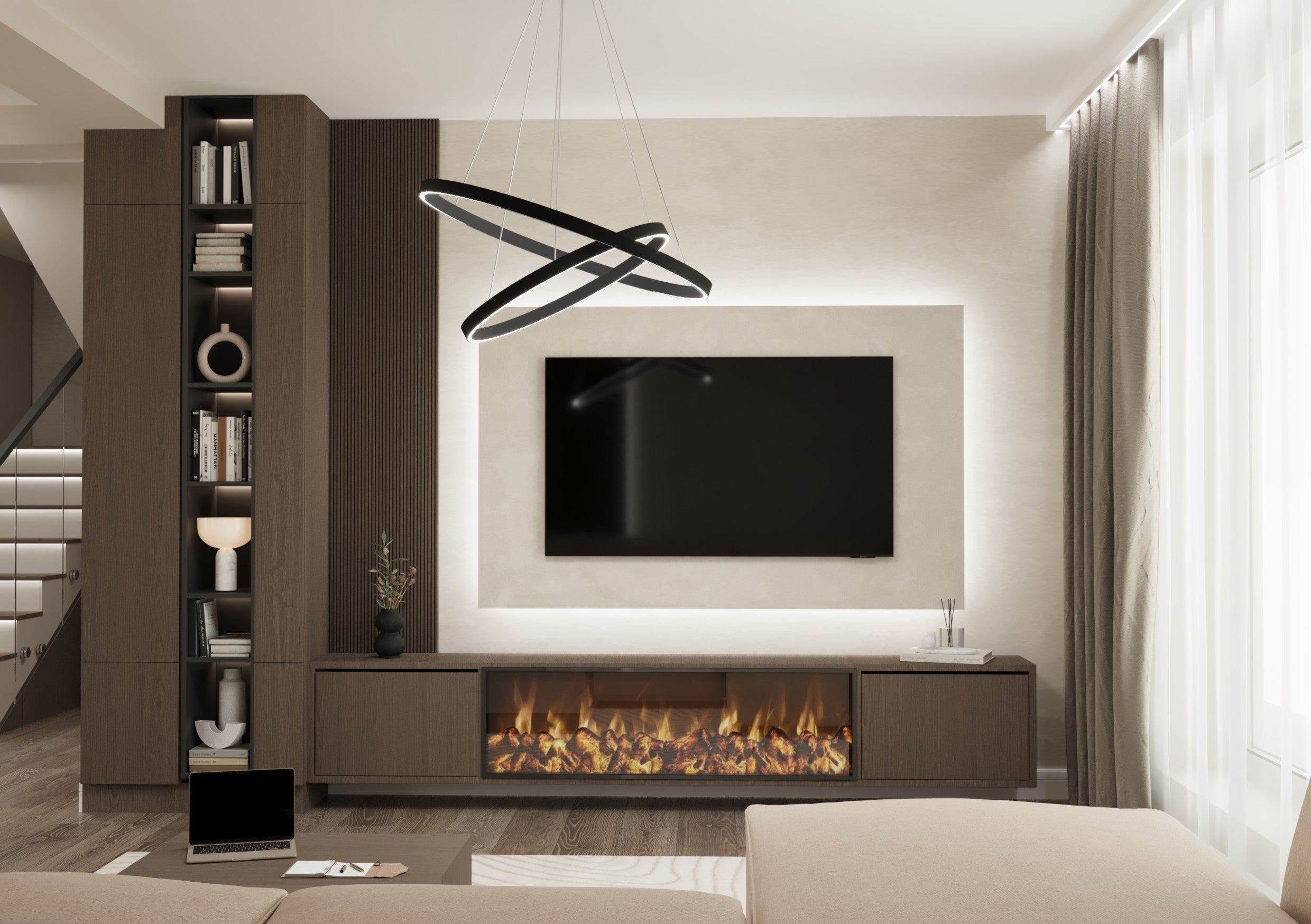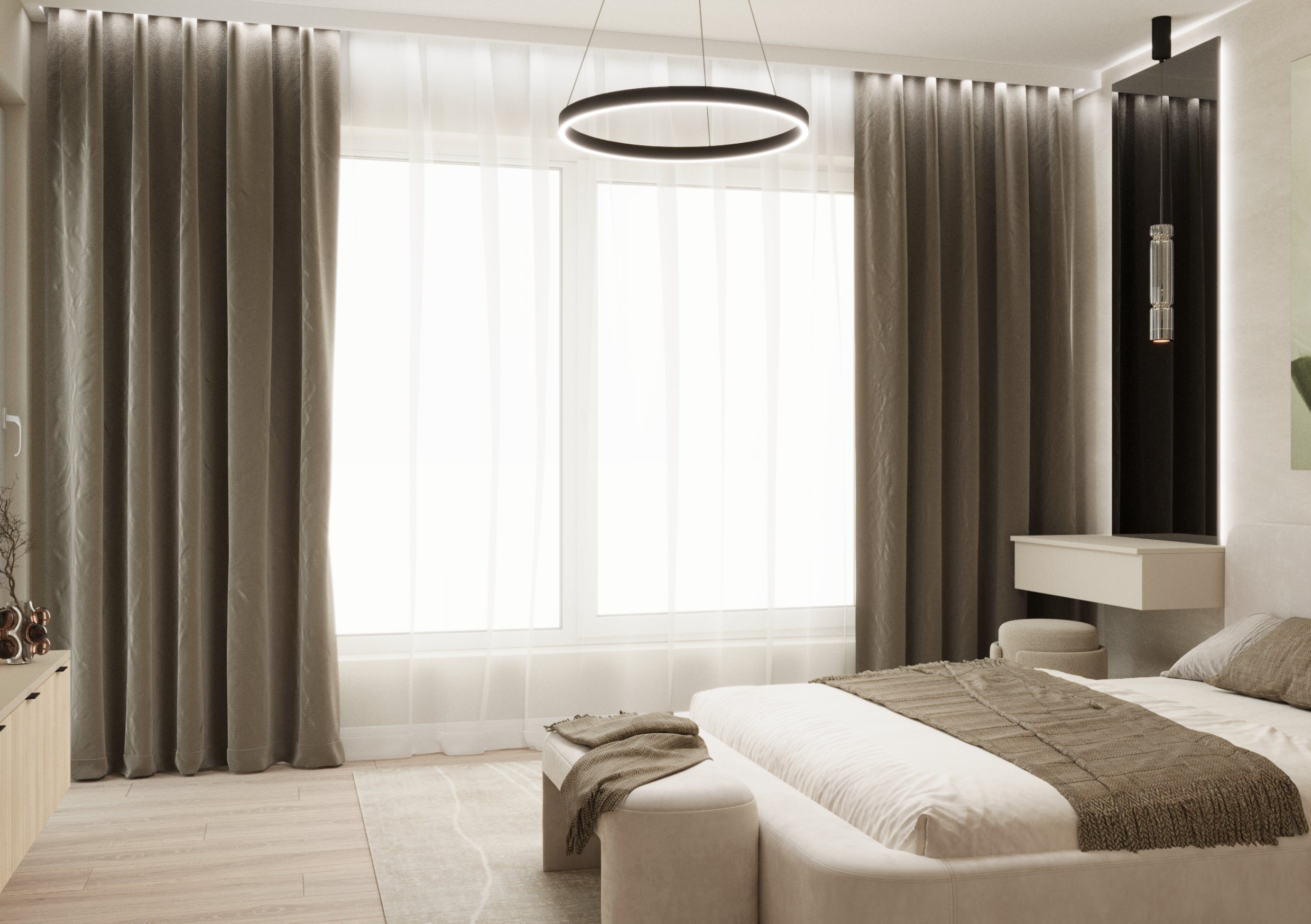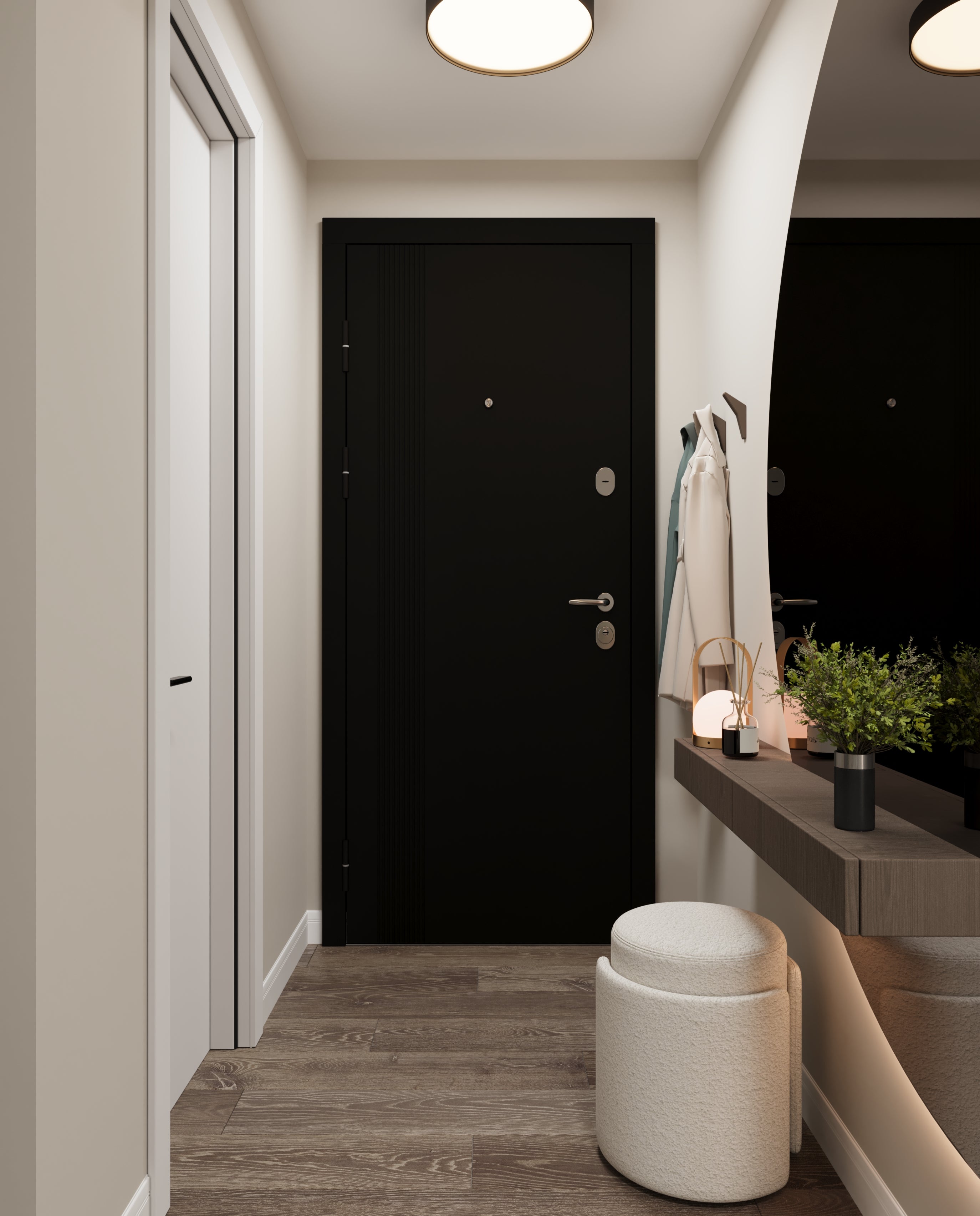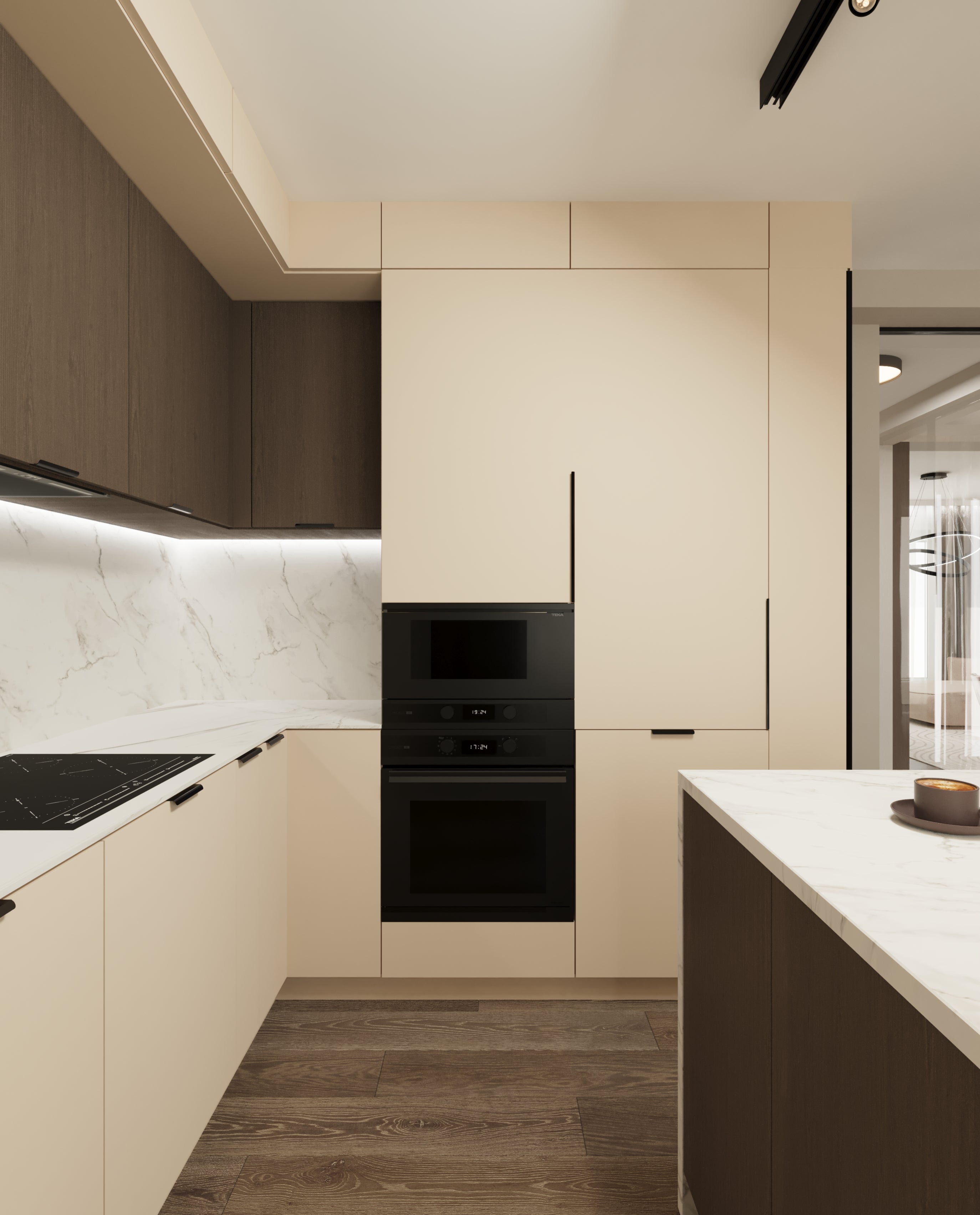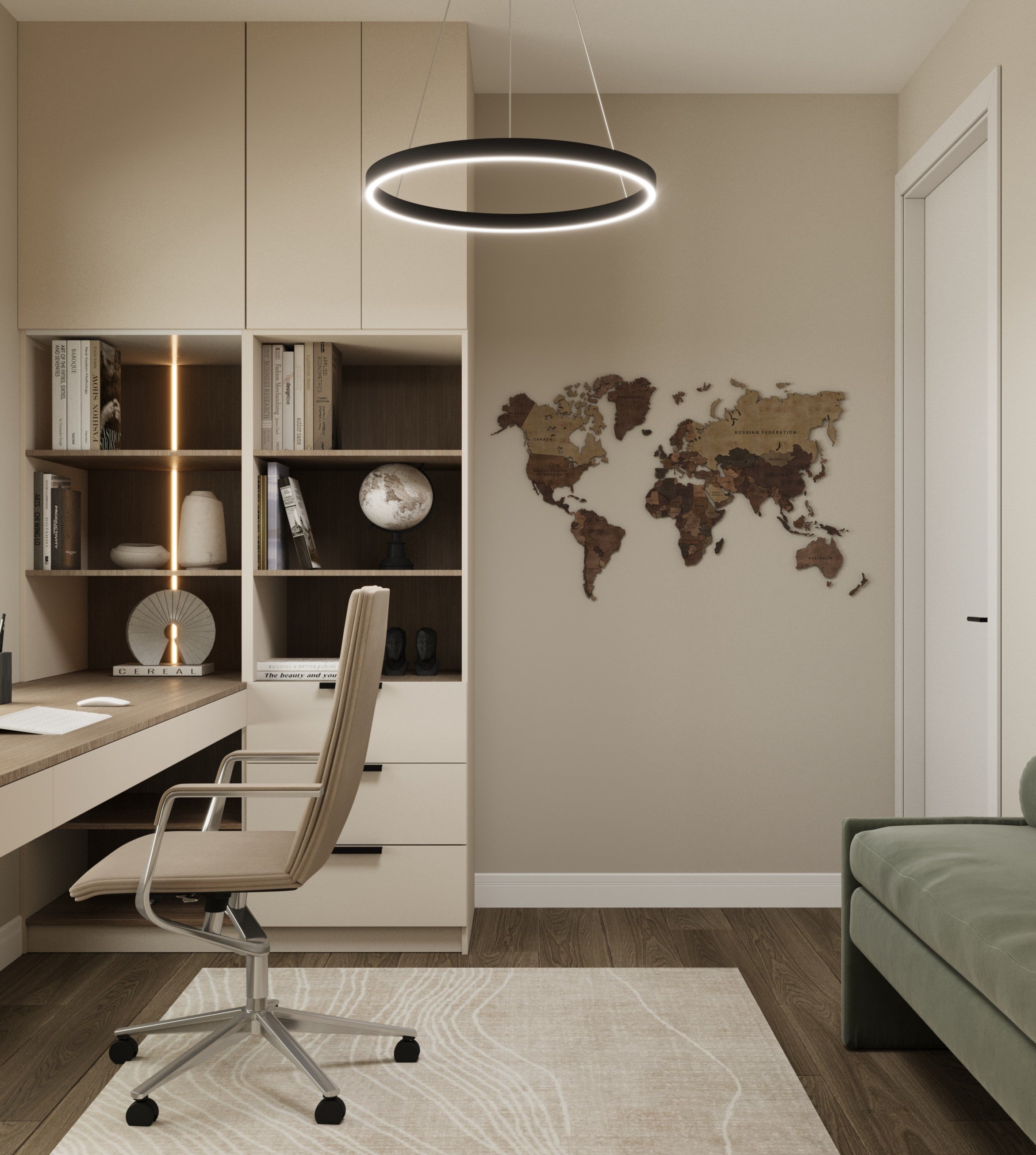 Un design contemporan în tonuri și finisaje naturale, unde riflajele din lemn adaugă textură și profunzime. Accentele de verde aduc prospețime și echilibru, completând armonios atmosfera caldă, organică și relaxantă a spațiului.