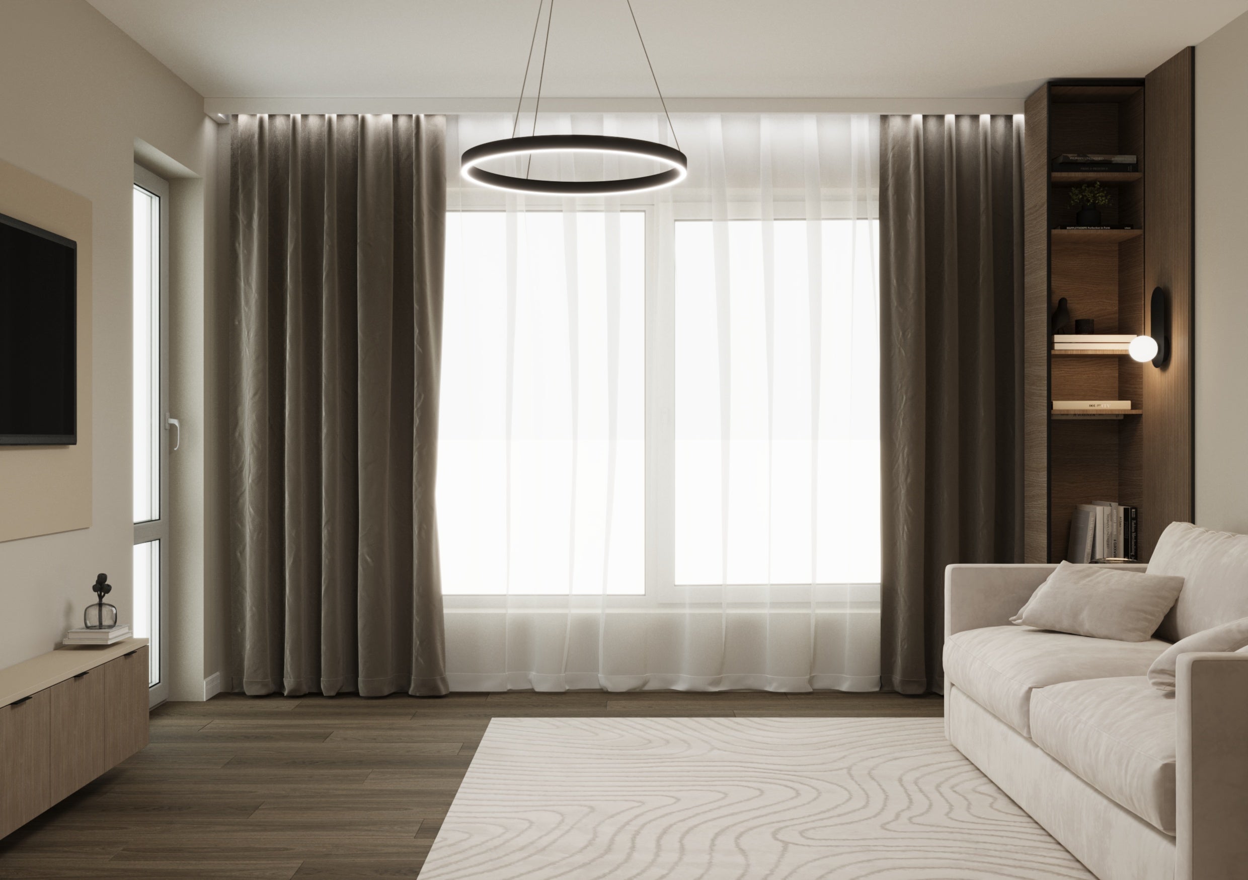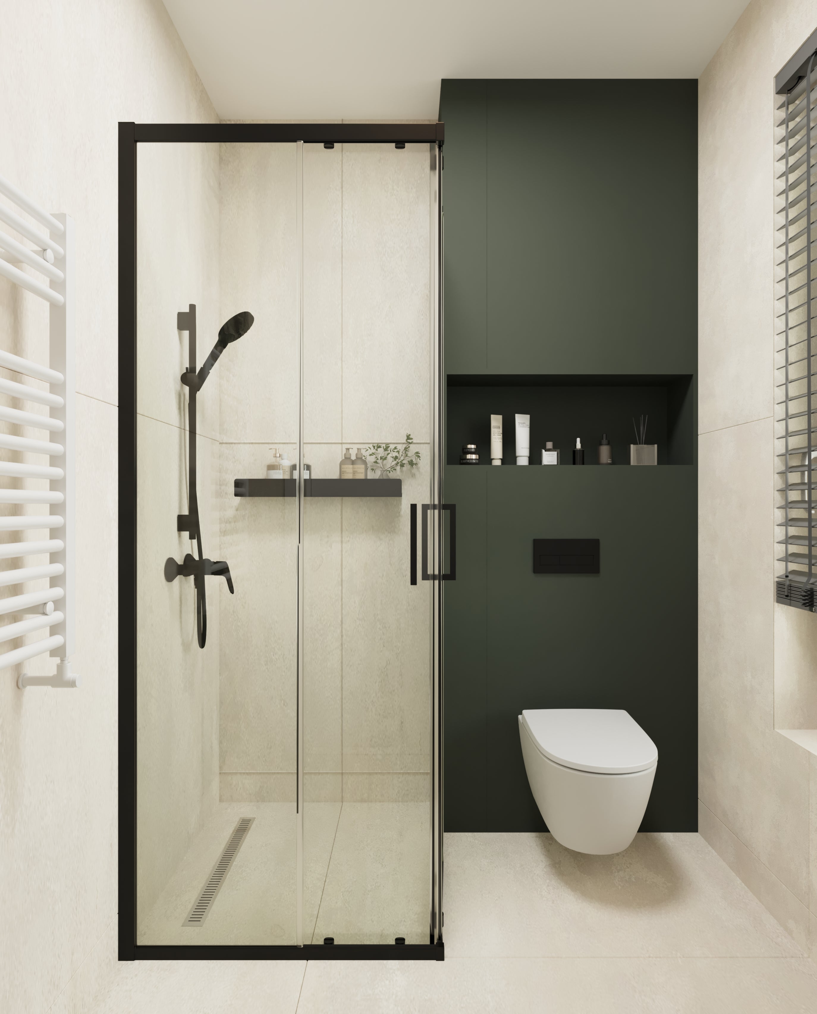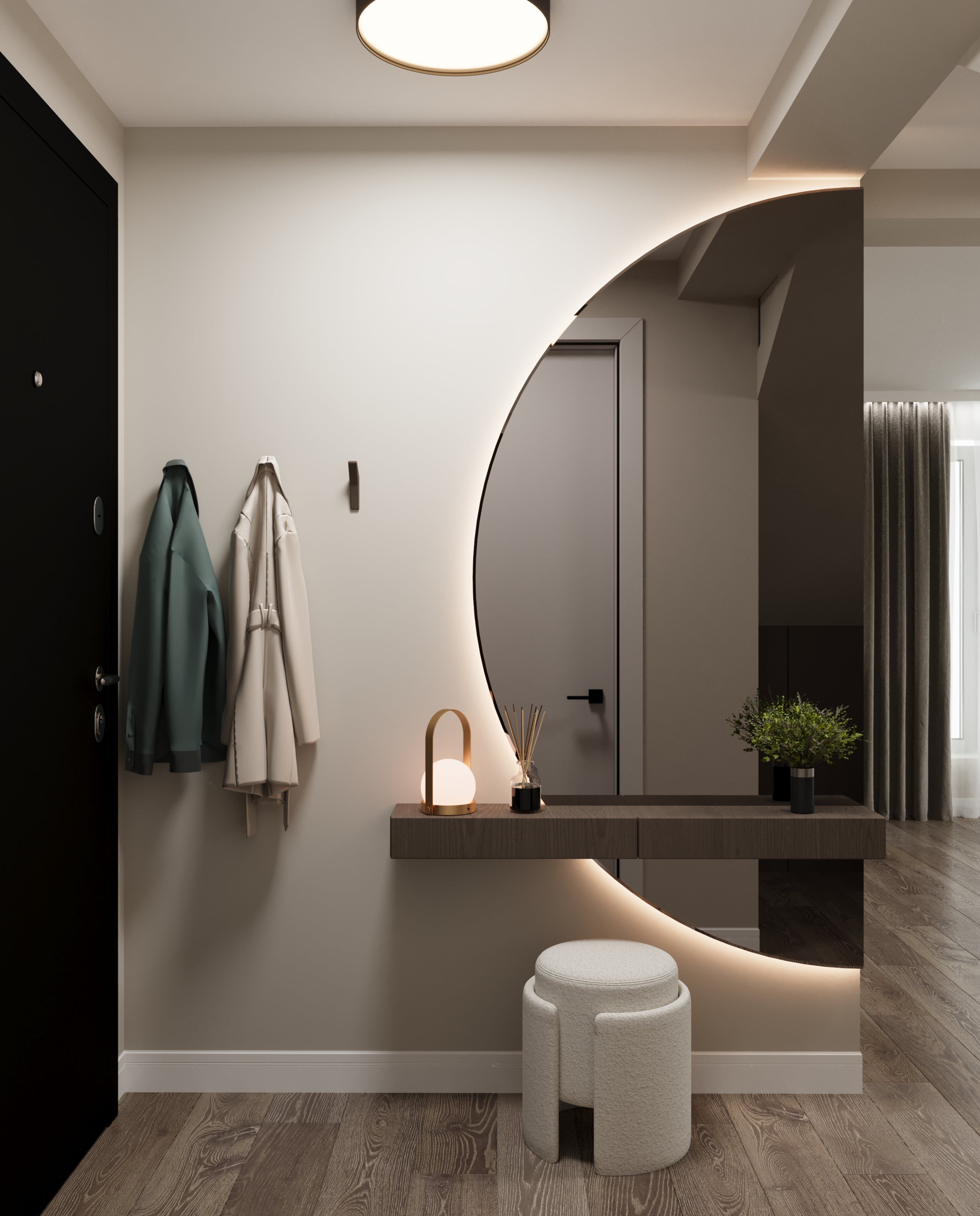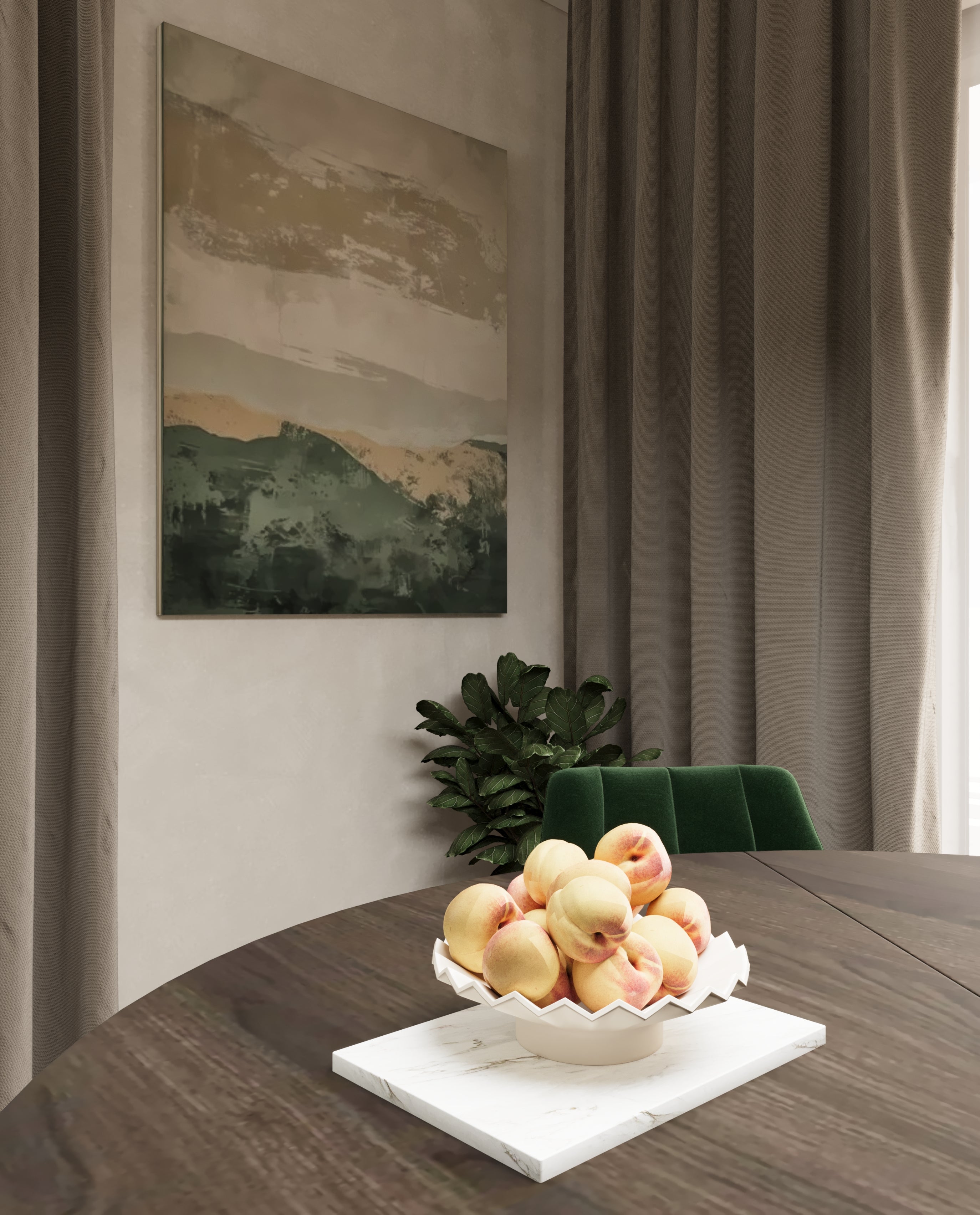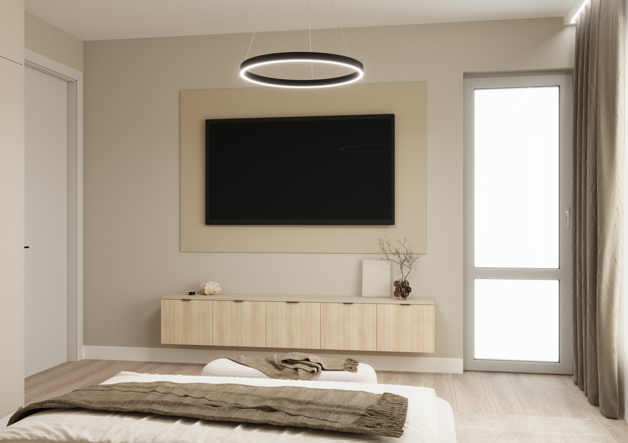 Un design contemporan în tonuri și finisaje naturale, unde riflajele din lemn adaugă textură și profunzime. Accentele de verde aduc prospețime și echilibru, completând armonios atmosfera caldă, organică și relaxantă a spațiului.