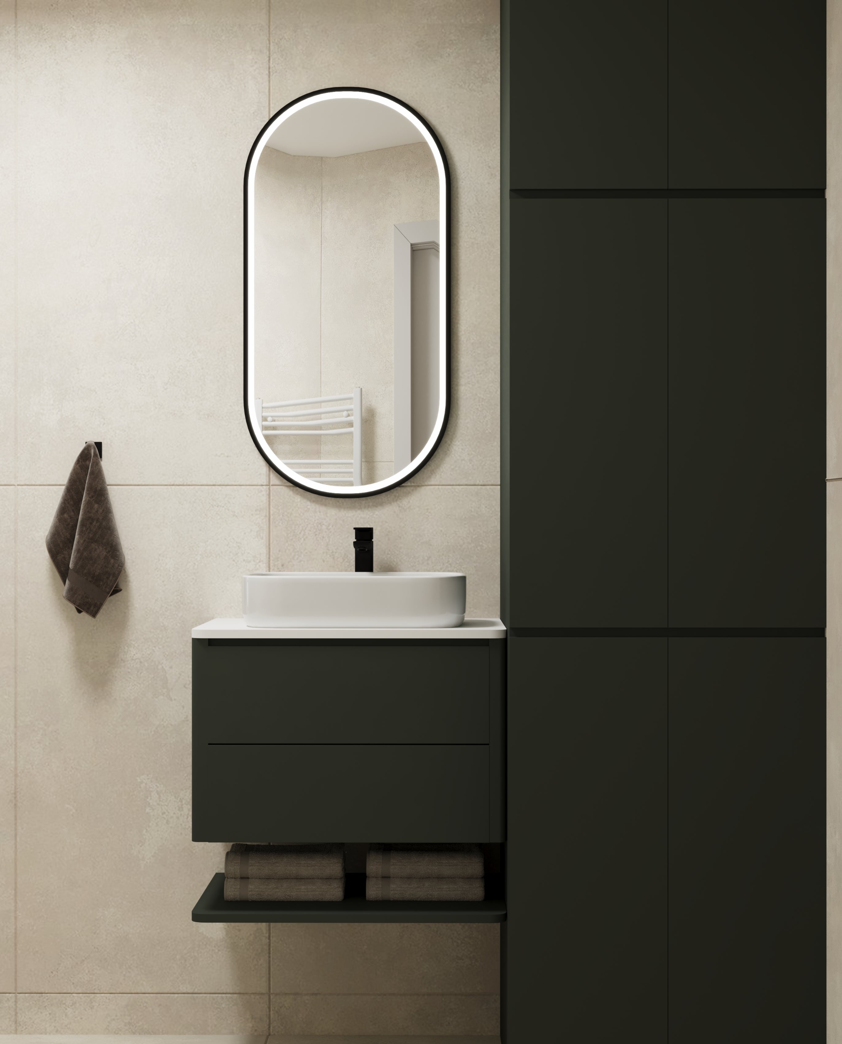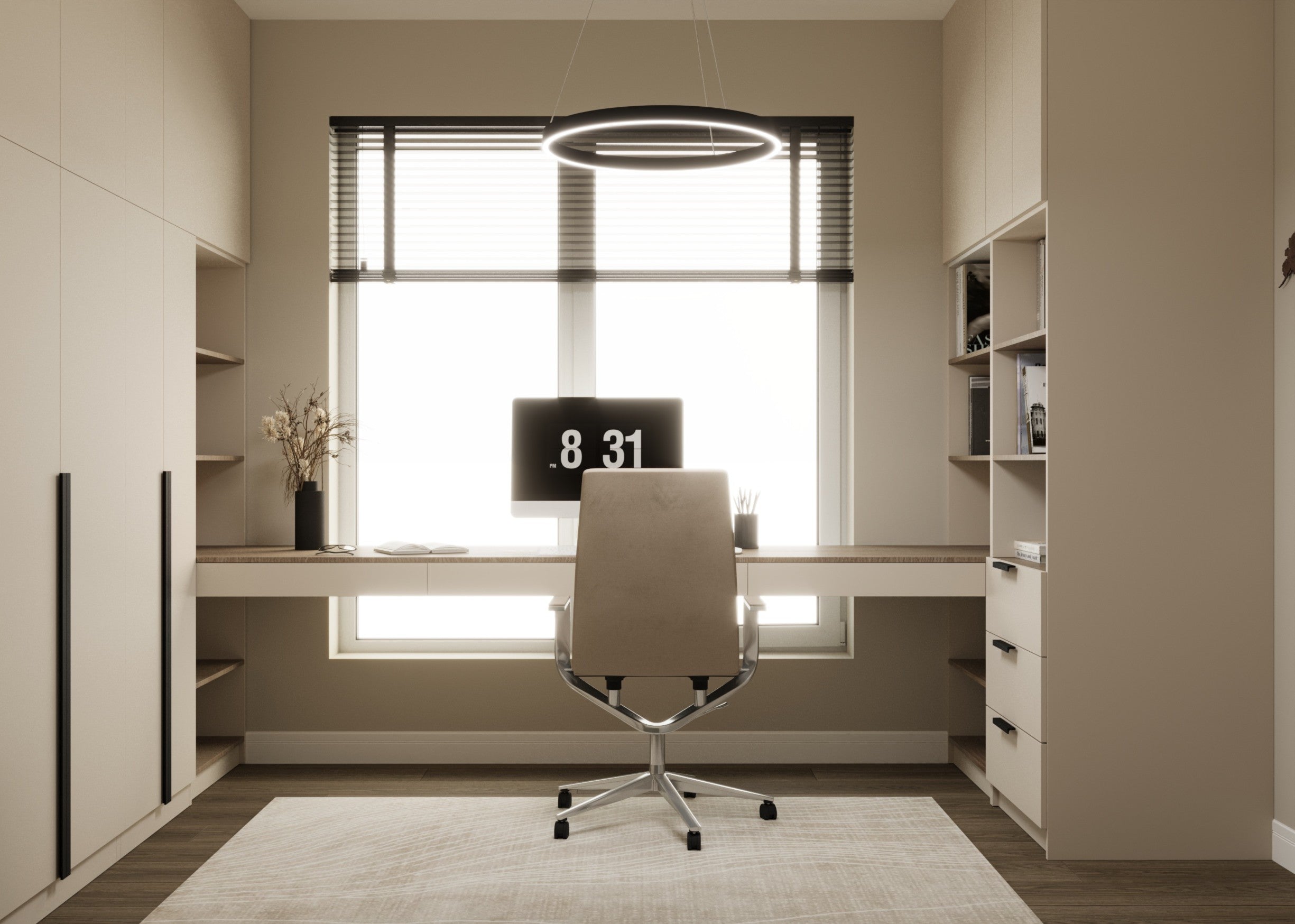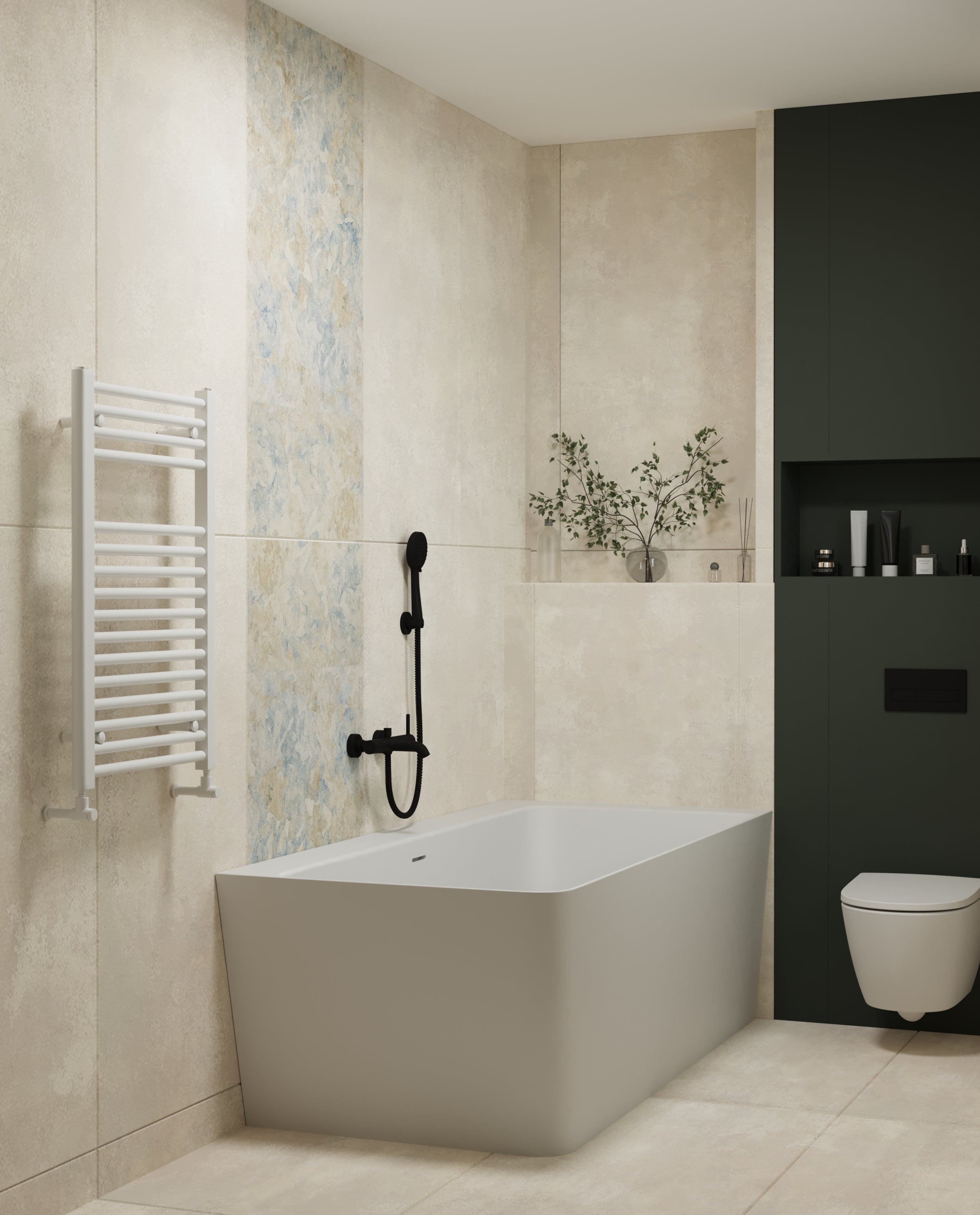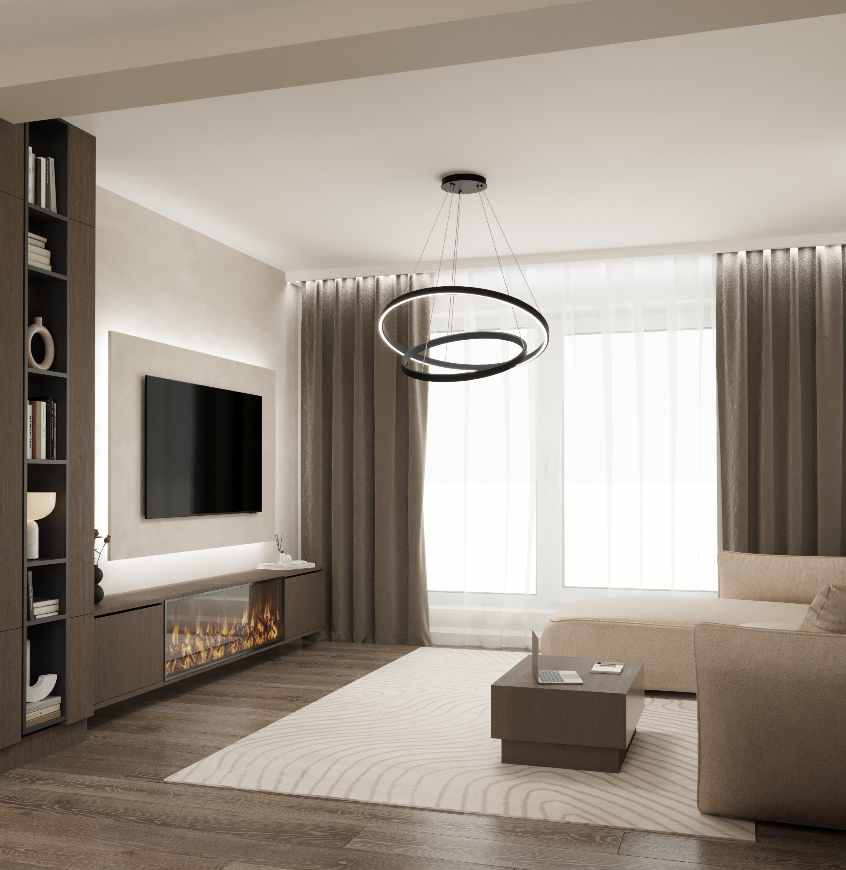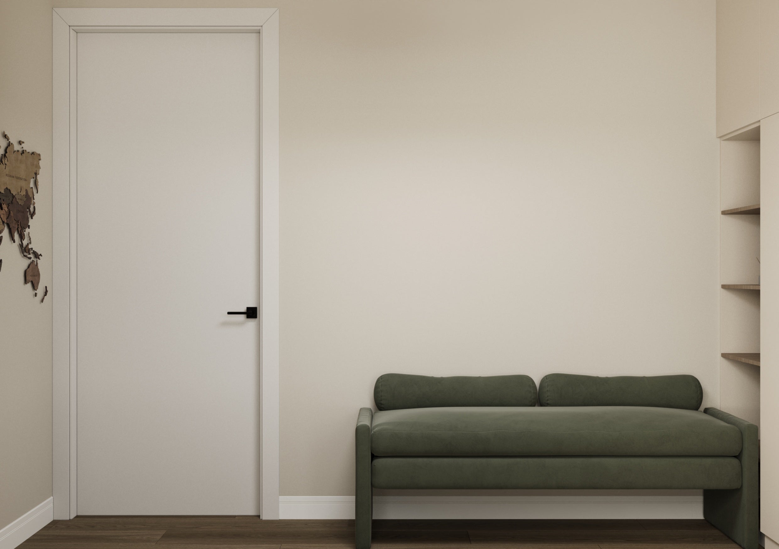 Un design contemporan în tonuri și finisaje naturale, unde riflajele din lemn adaugă textură și profunzime. Accentele de verde aduc prospețime și echilibru, completând armonios atmosfera caldă, organică și relaxantă a spațiului.