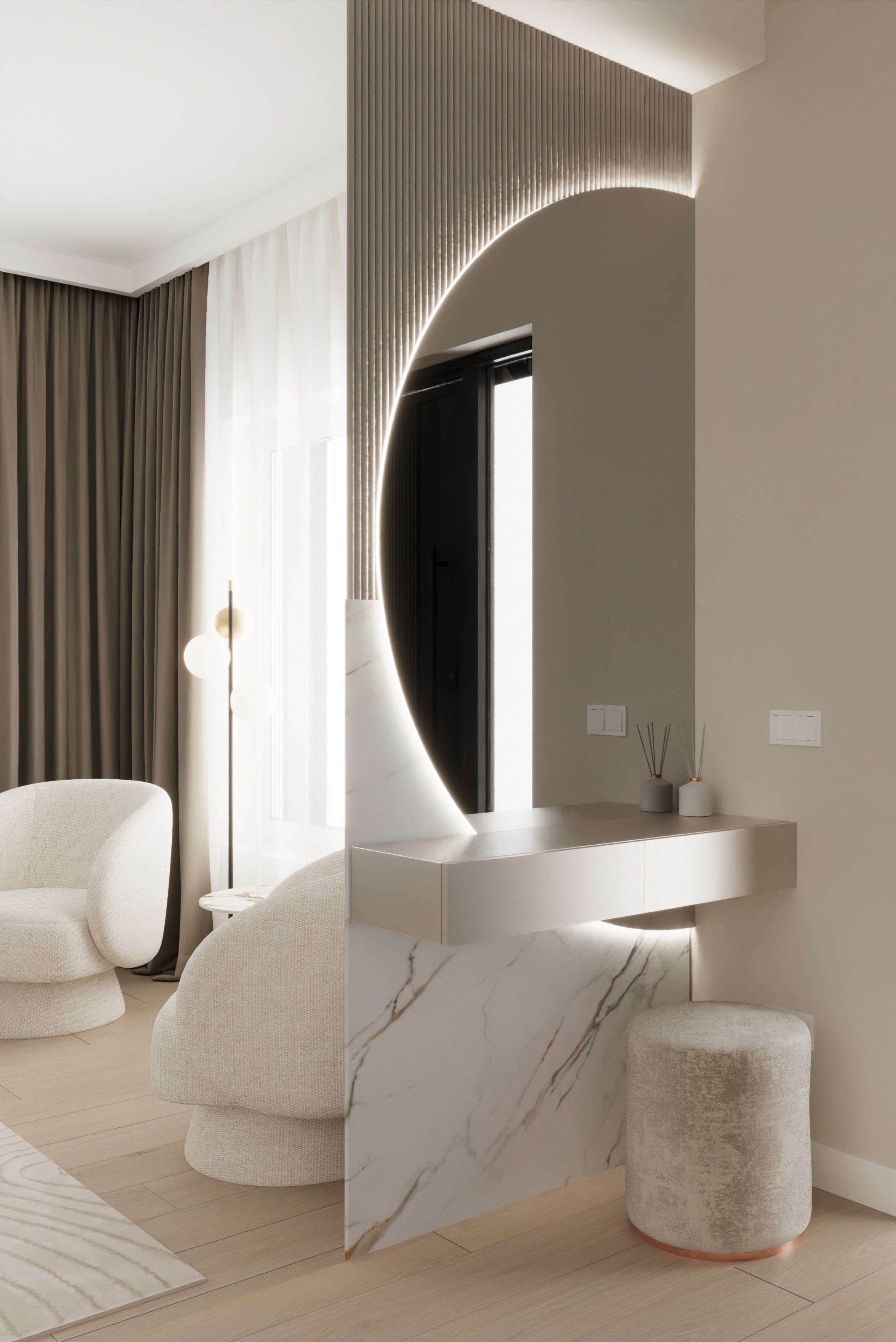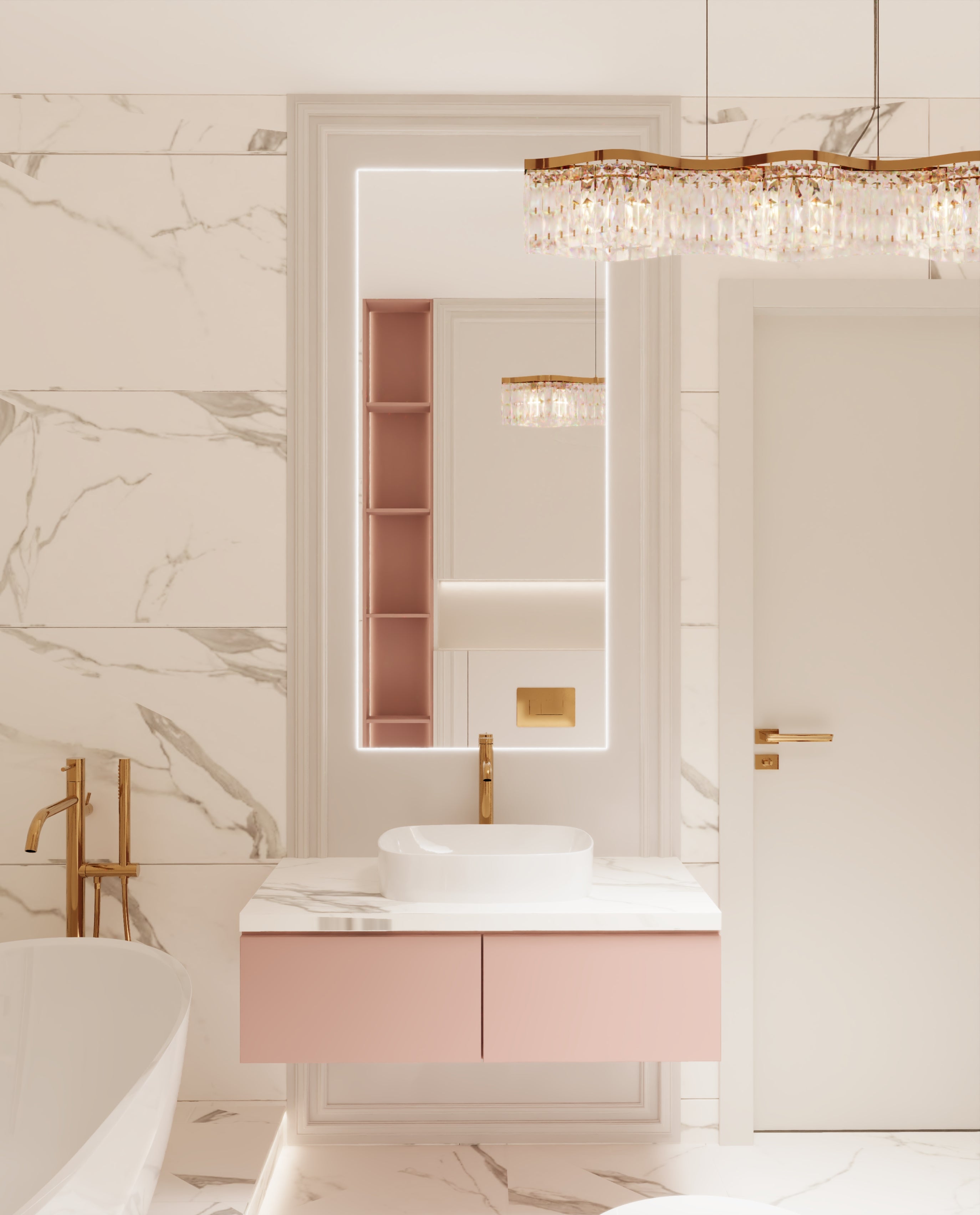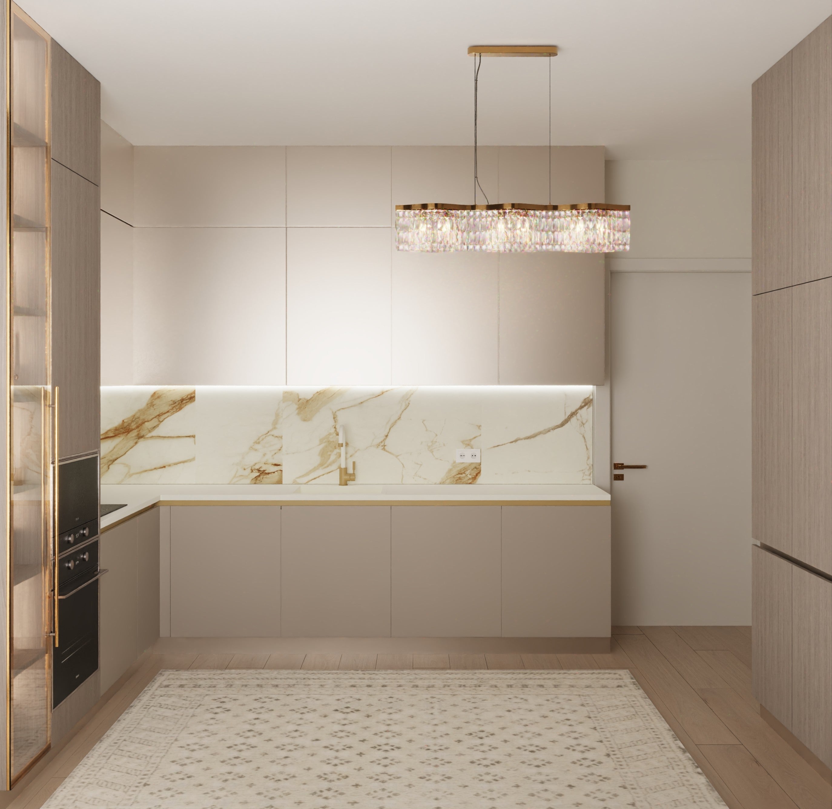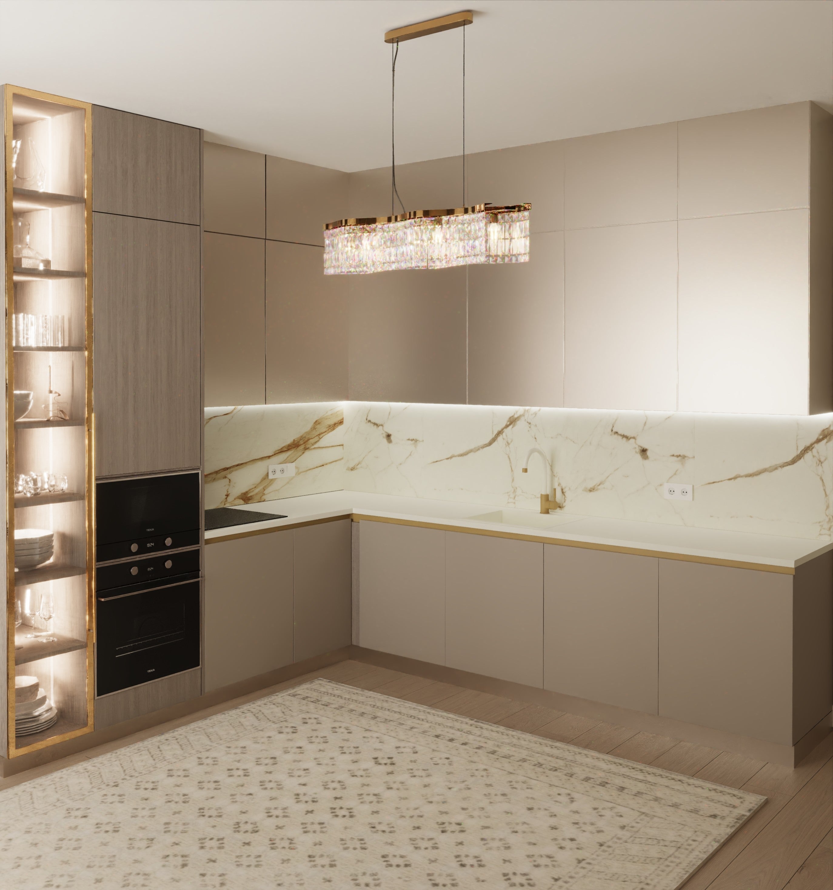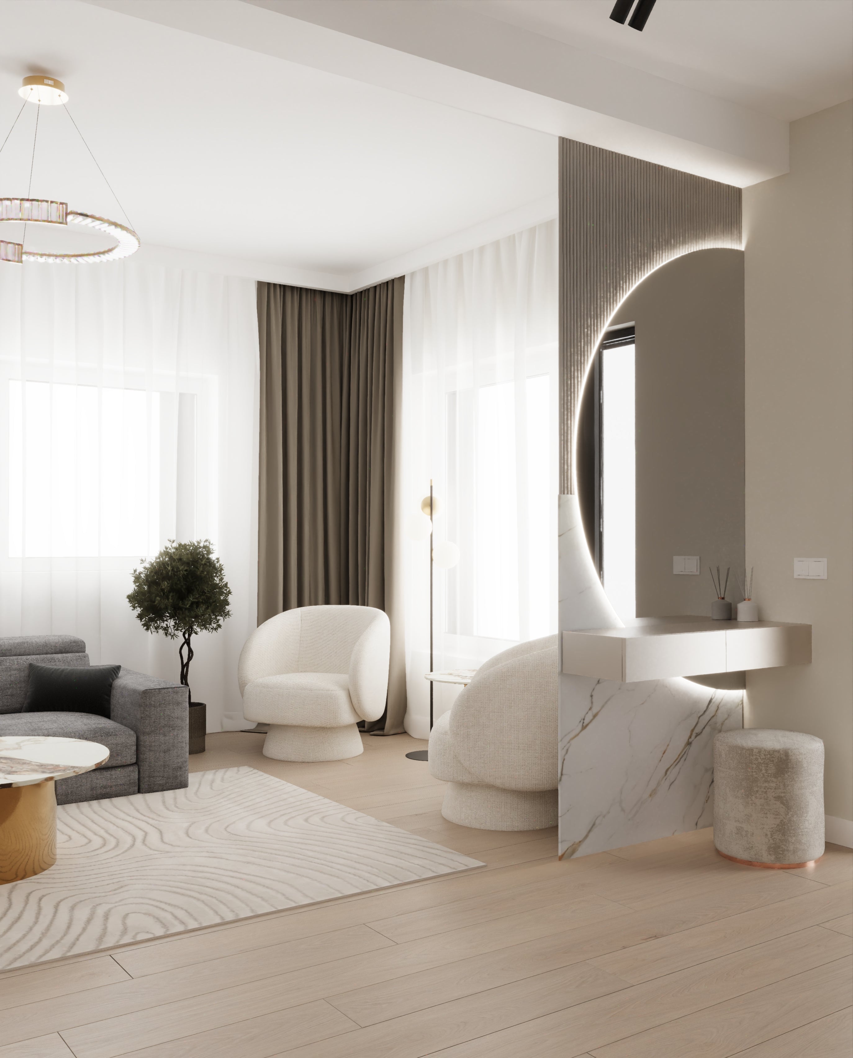 Un design elegant în tonuri calde de bej, cu suprafețe ce imită marmura și mobilier cu forme rotunjite care aduce finețe și confort. Accentele aurii și baghetările decorative completează compoziția, oferind un aer sofisticat, luminos și atemporal.