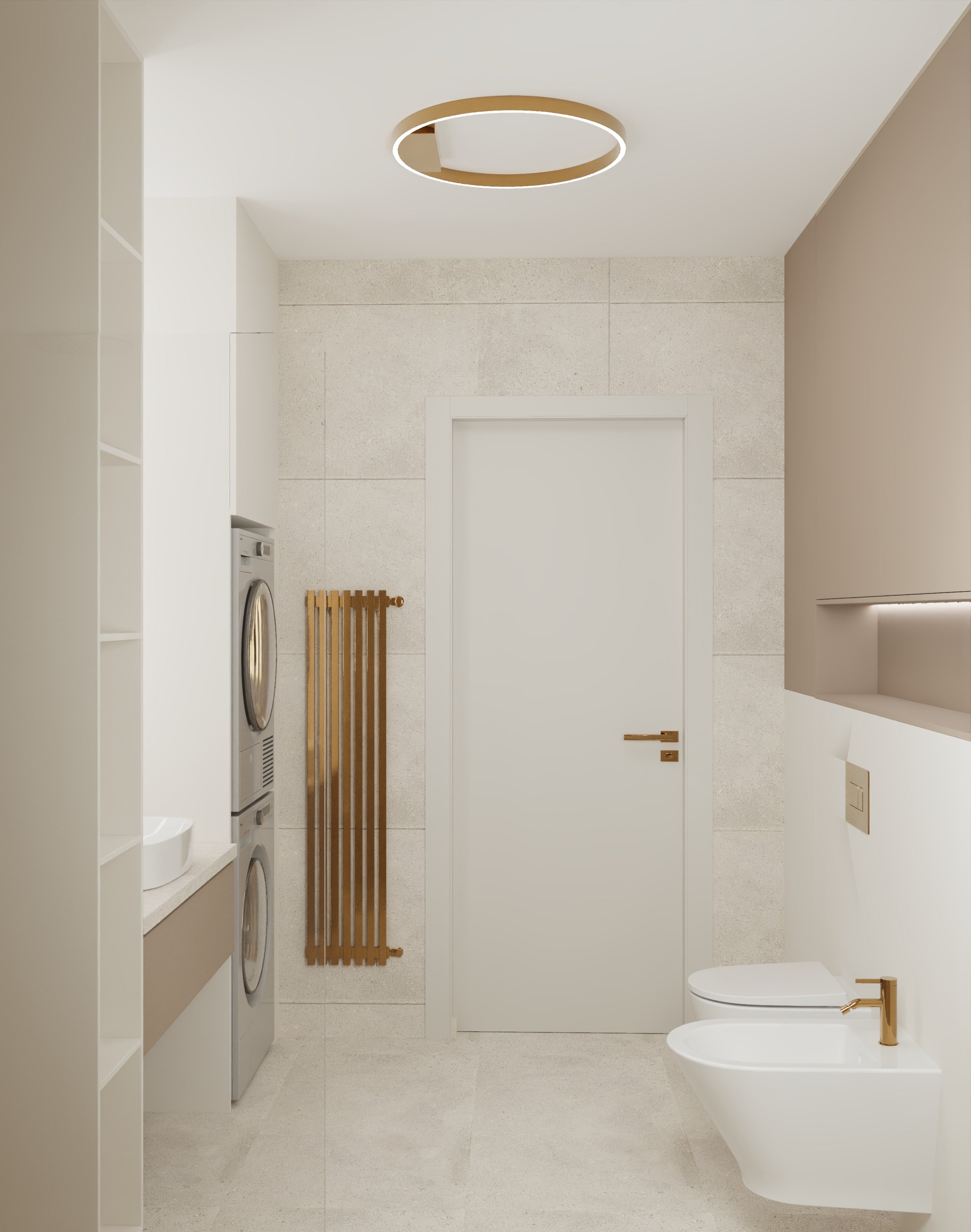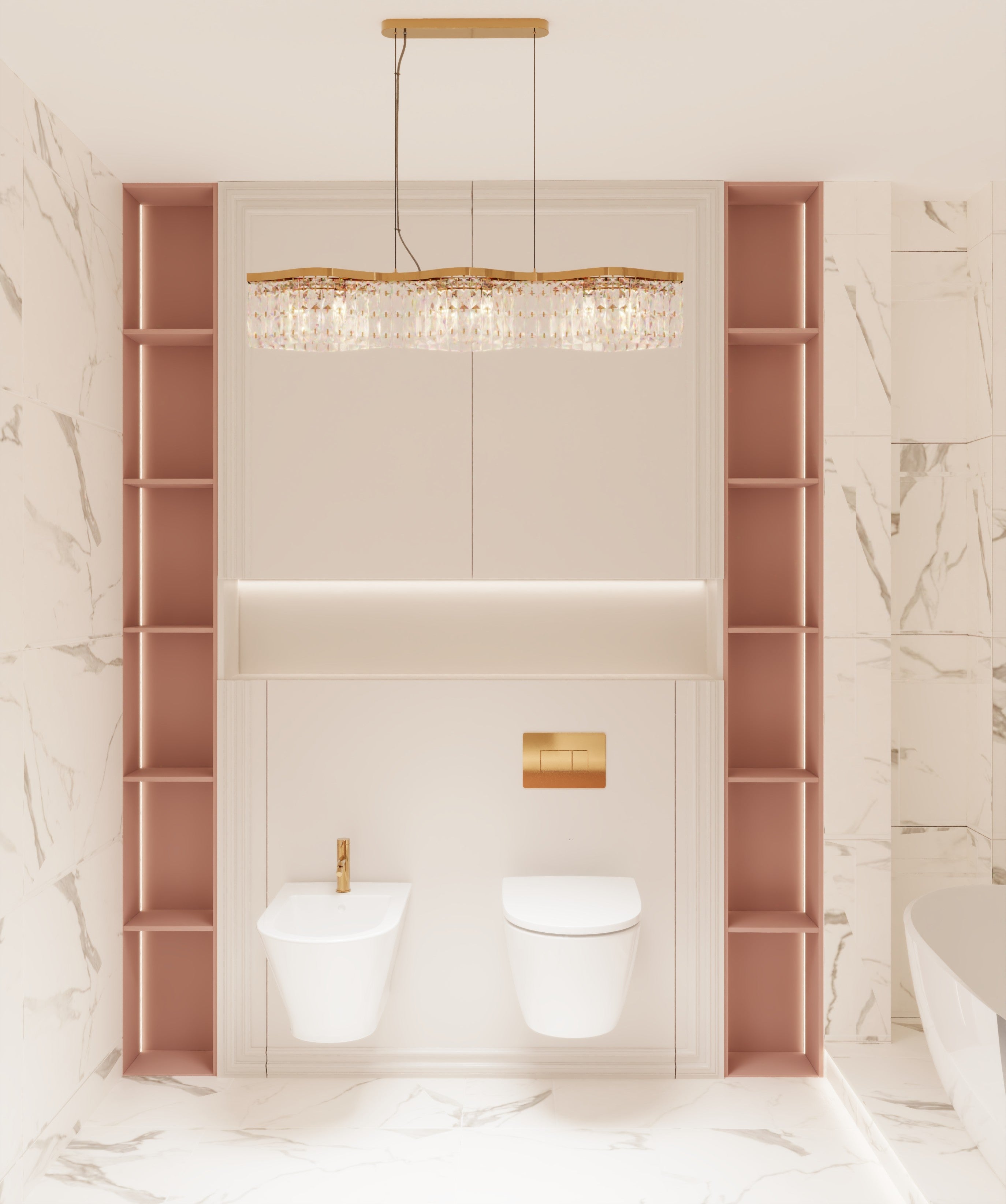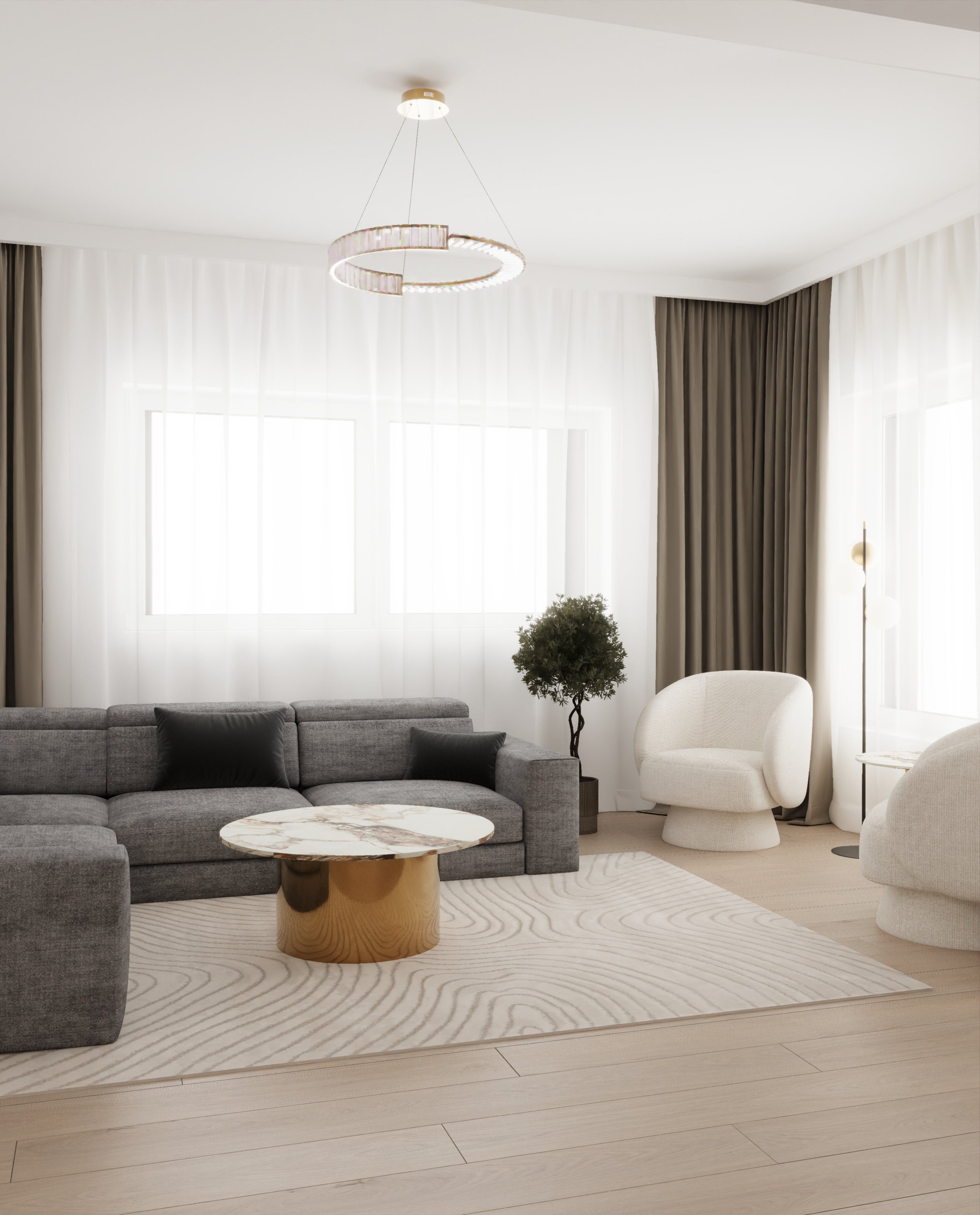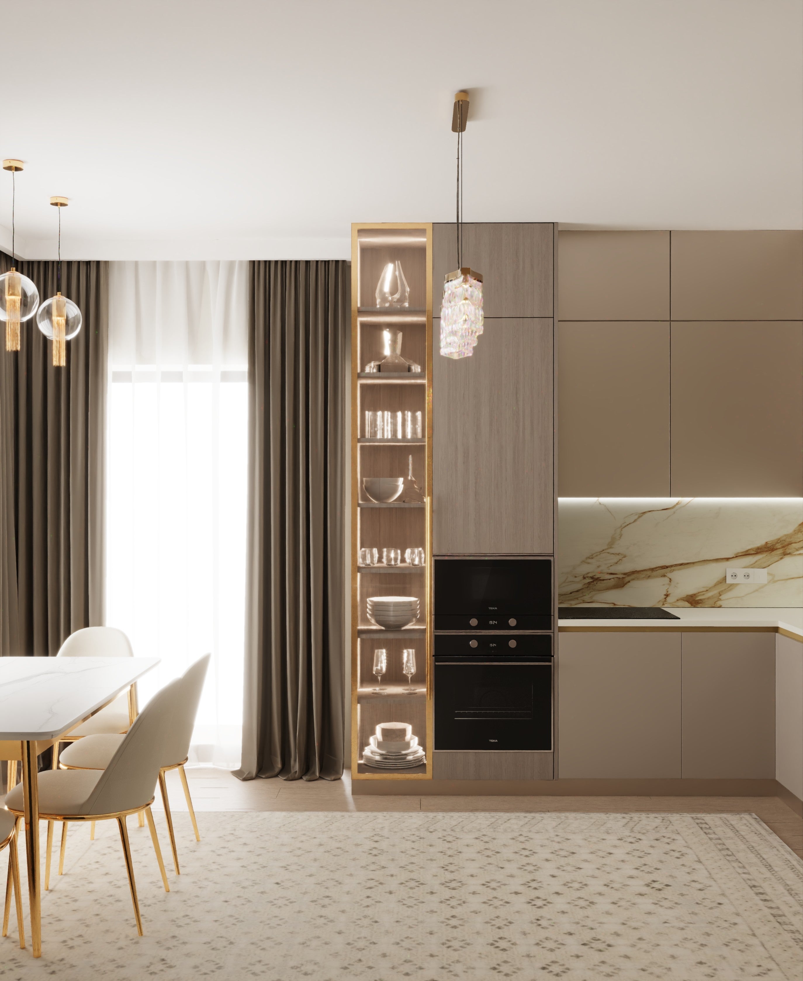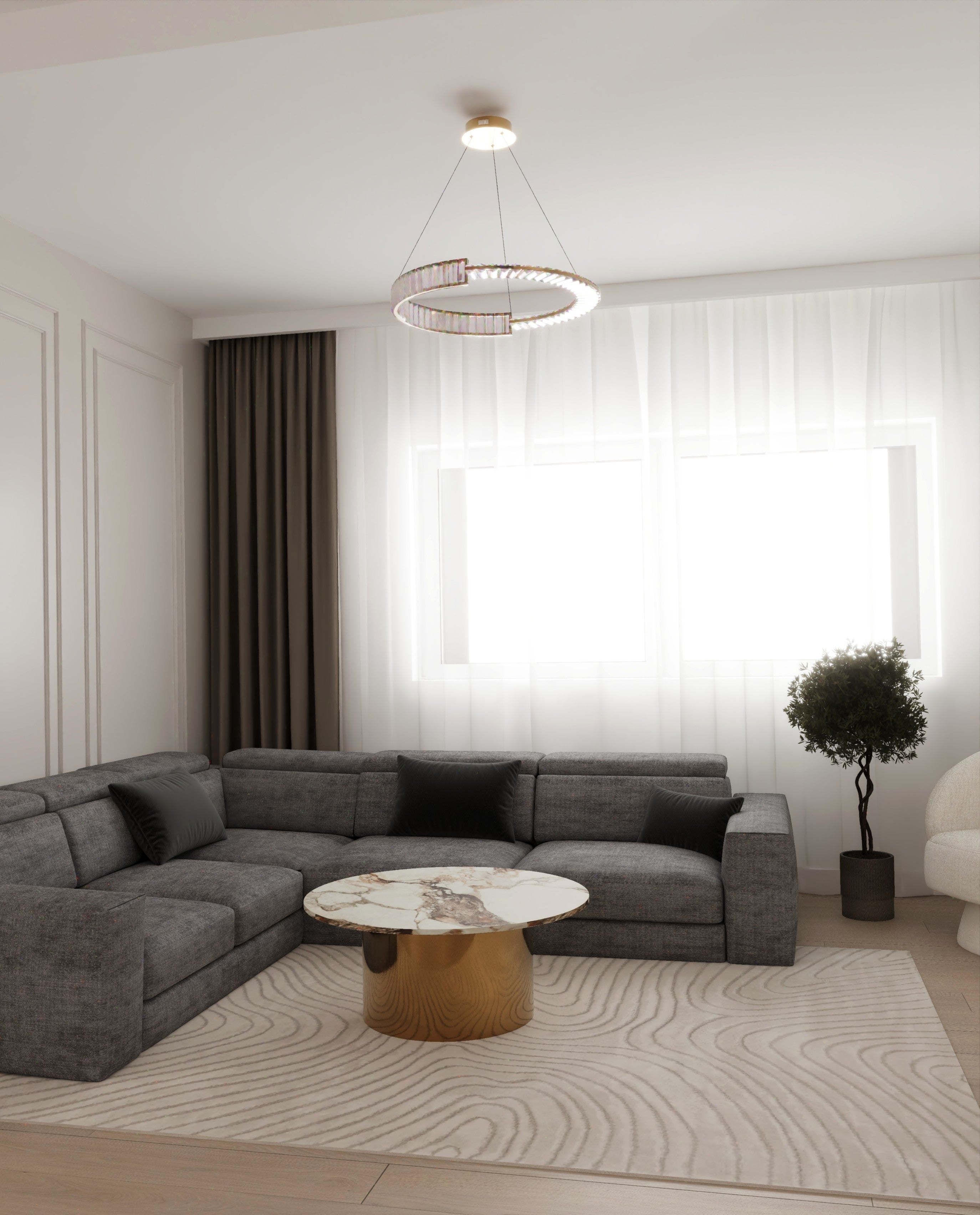 Un design elegant în tonuri calde de bej, cu suprafețe ce imită marmura și mobilier cu forme rotunjite care aduce finețe și confort. Accentele aurii și baghetările decorative completează compoziția, oferind un aer sofisticat, luminos și atemporal.