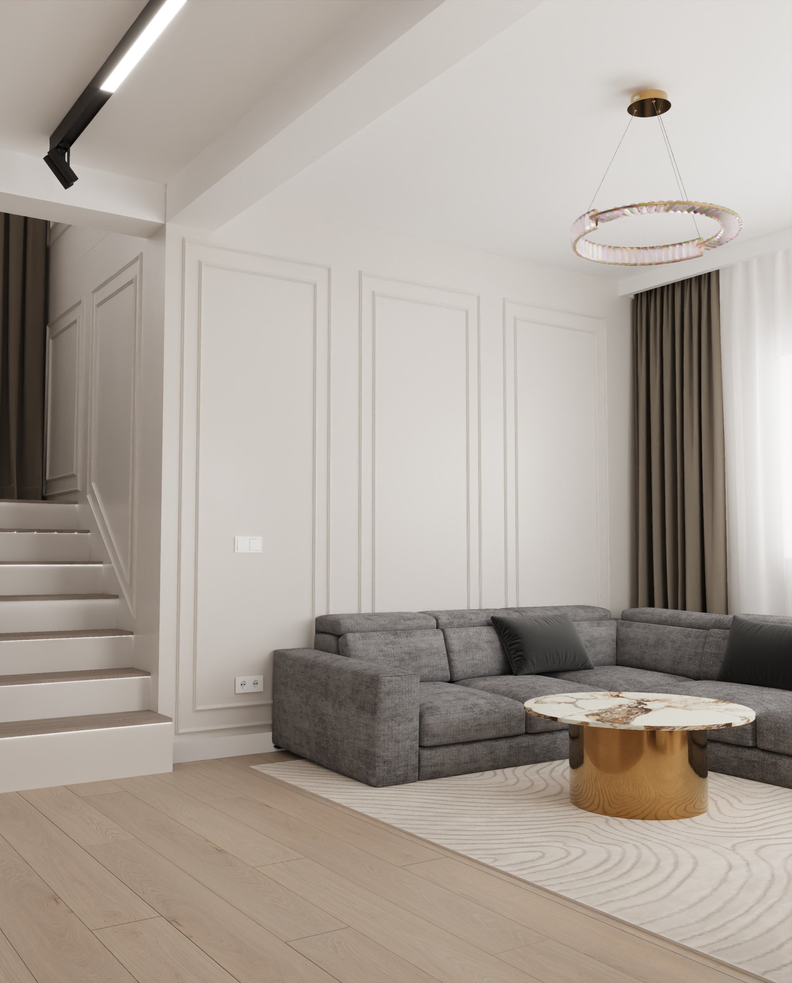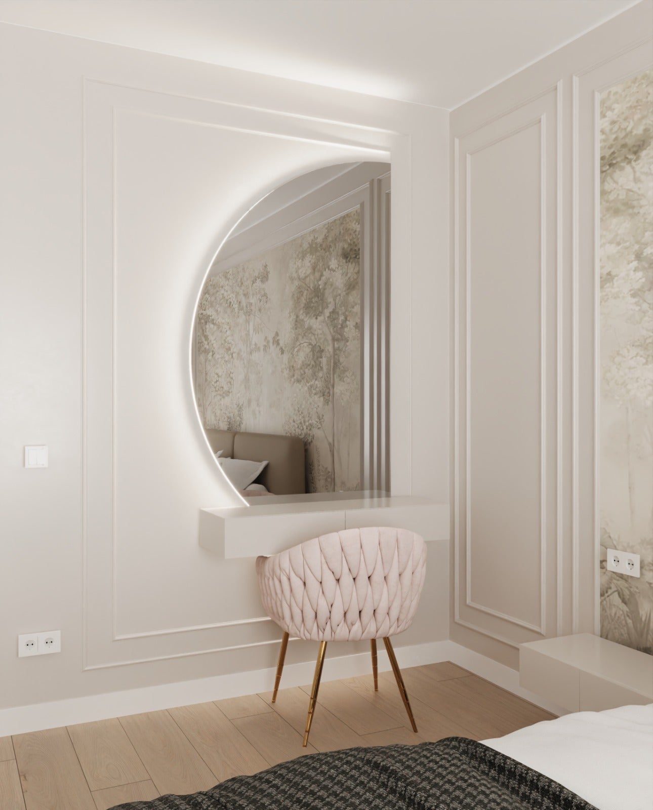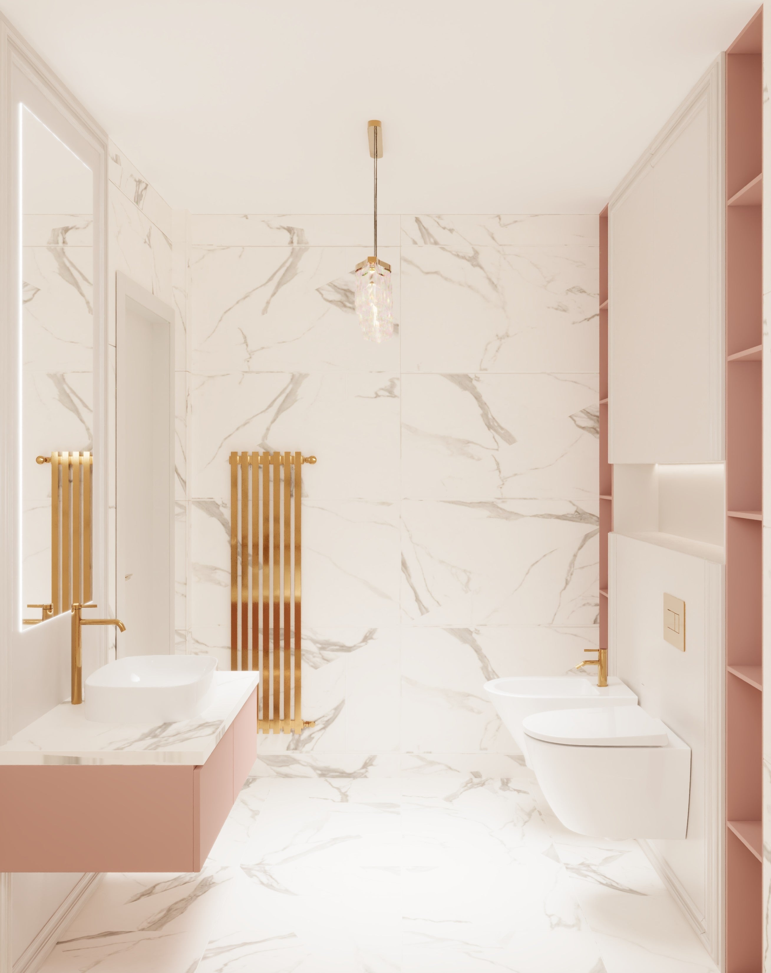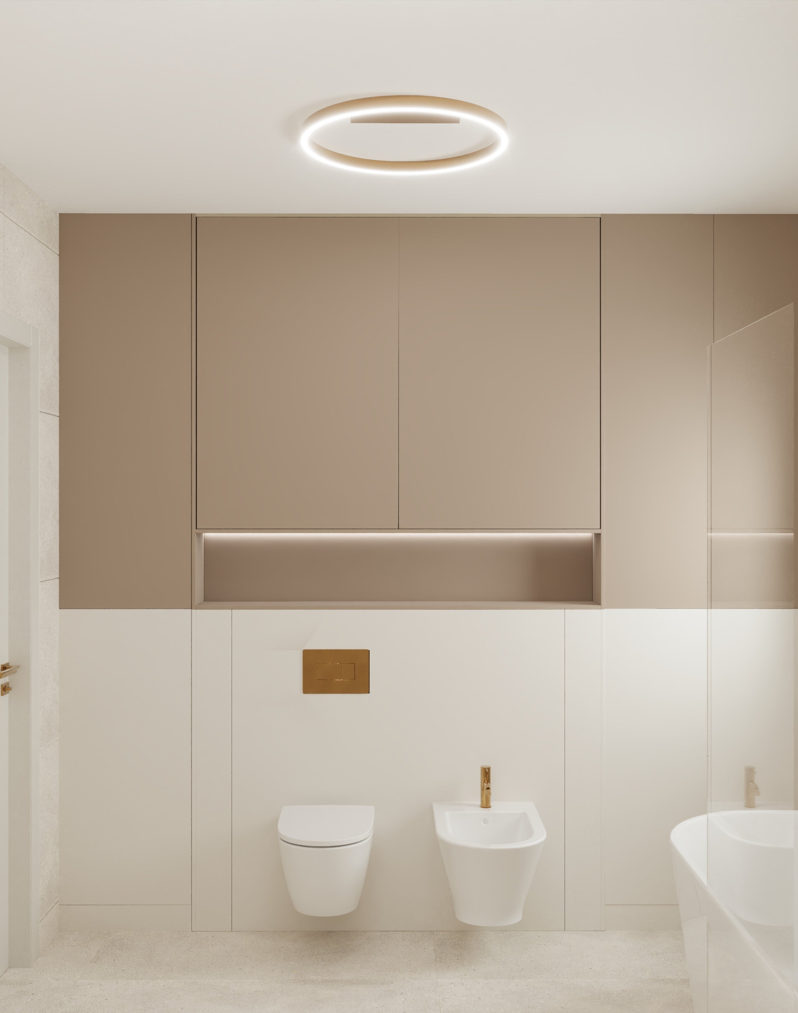 Un design elegant în tonuri calde de bej, cu suprafețe ce imită marmura și mobilier cu forme rotunjite care aduce finețe și confort. Accentele aurii și baghetările decorative completează compoziția, oferind un aer sofisticat, luminos și atemporal.