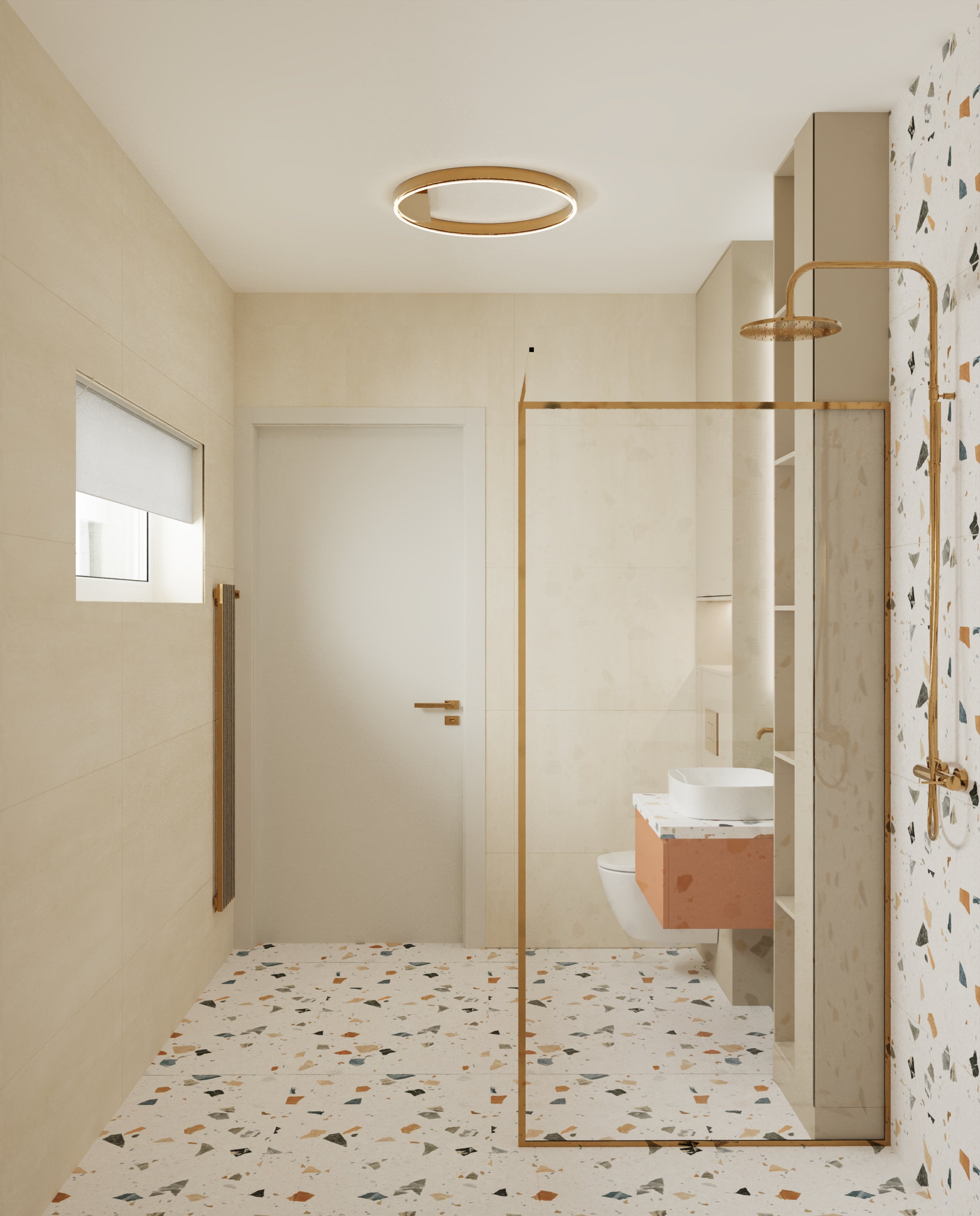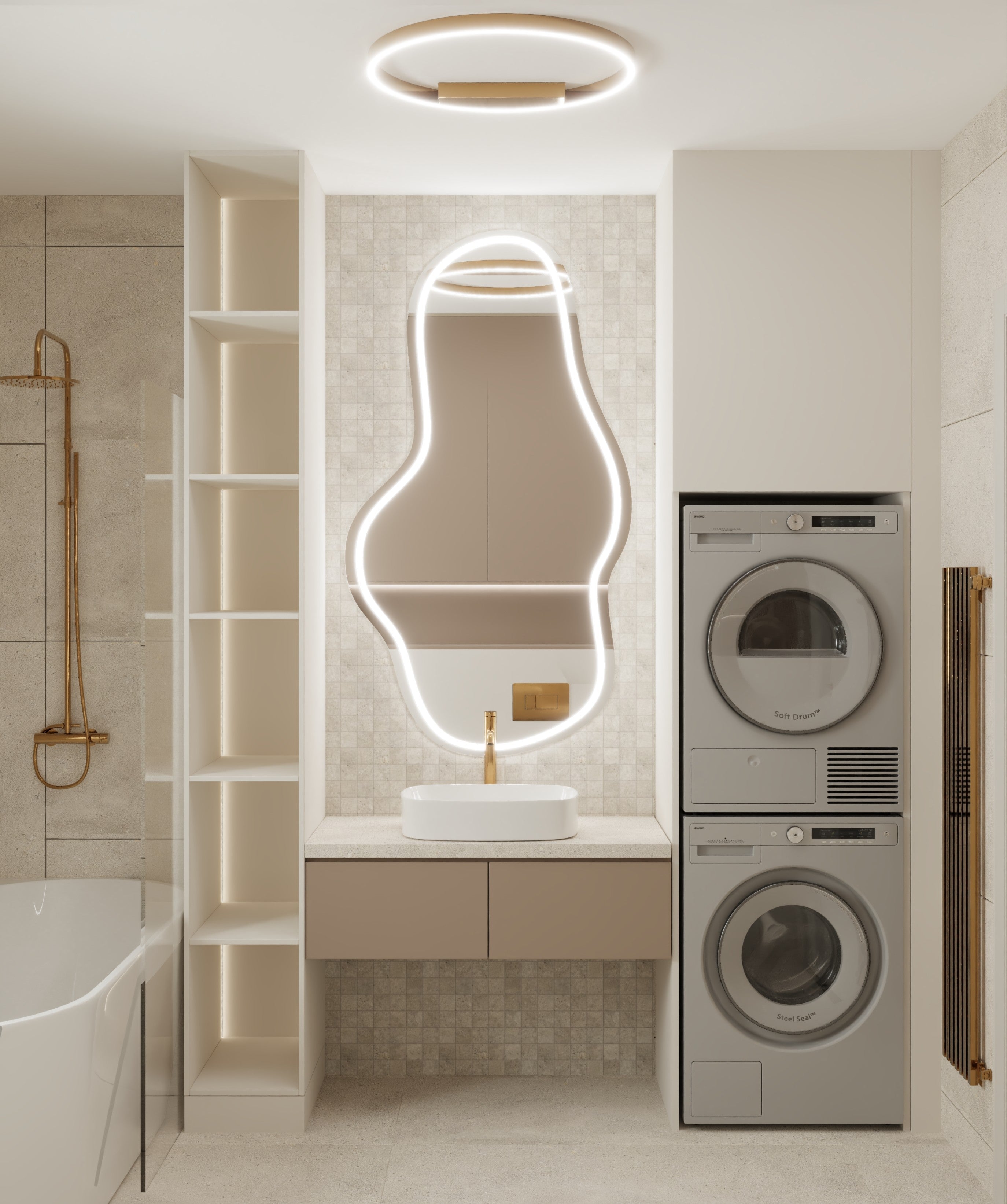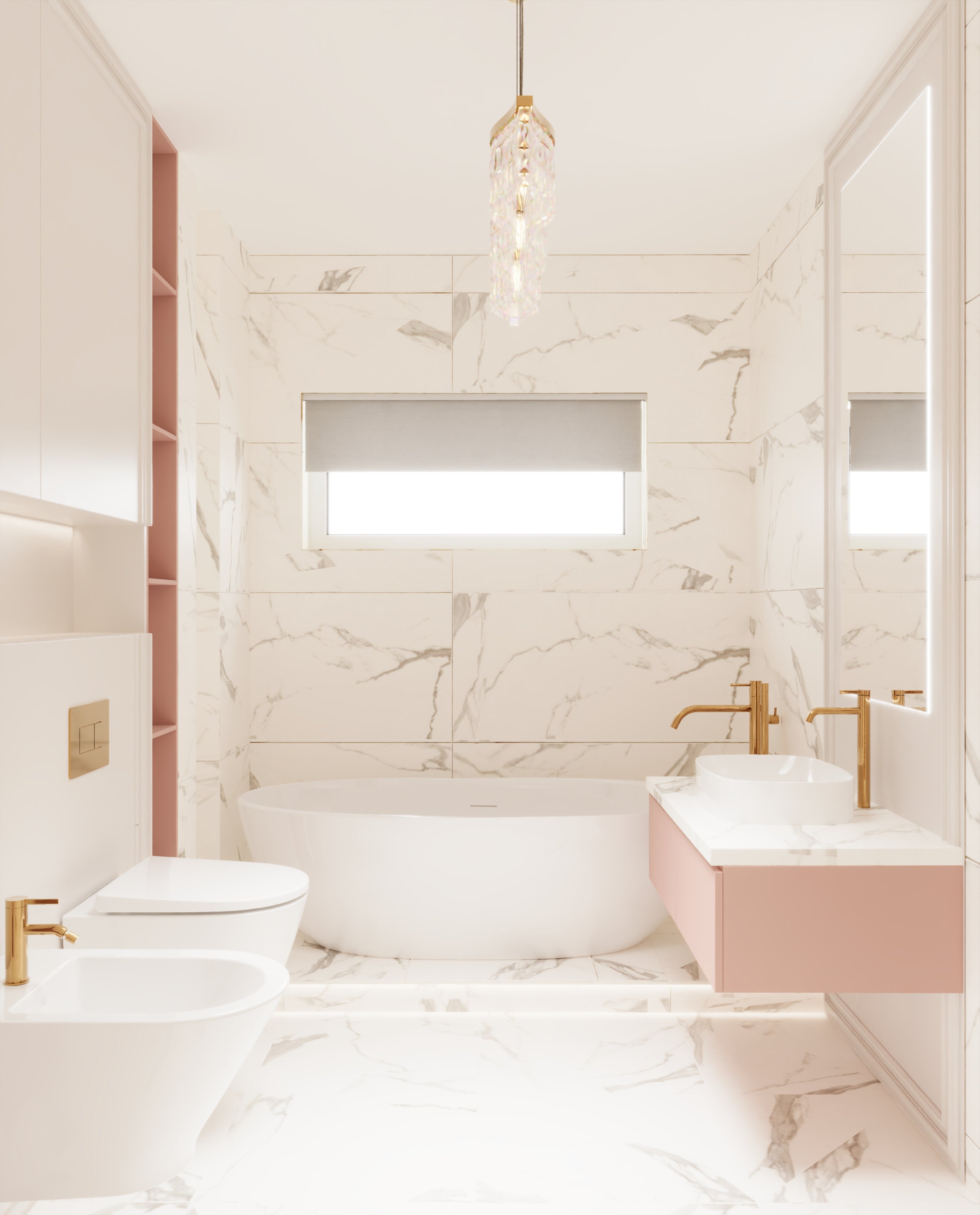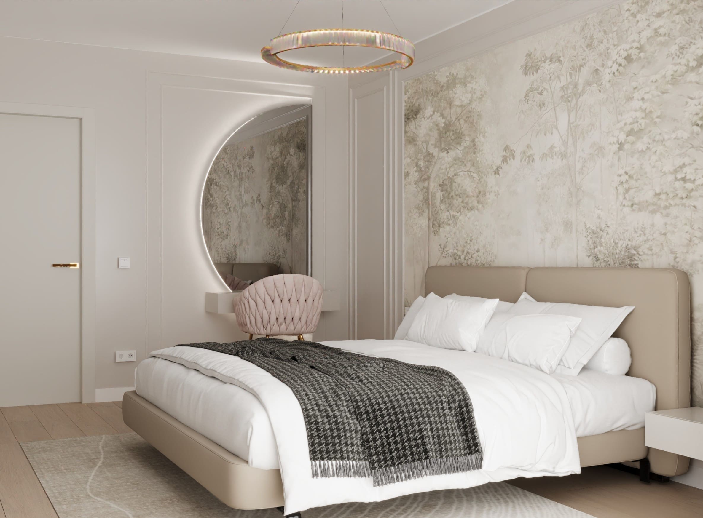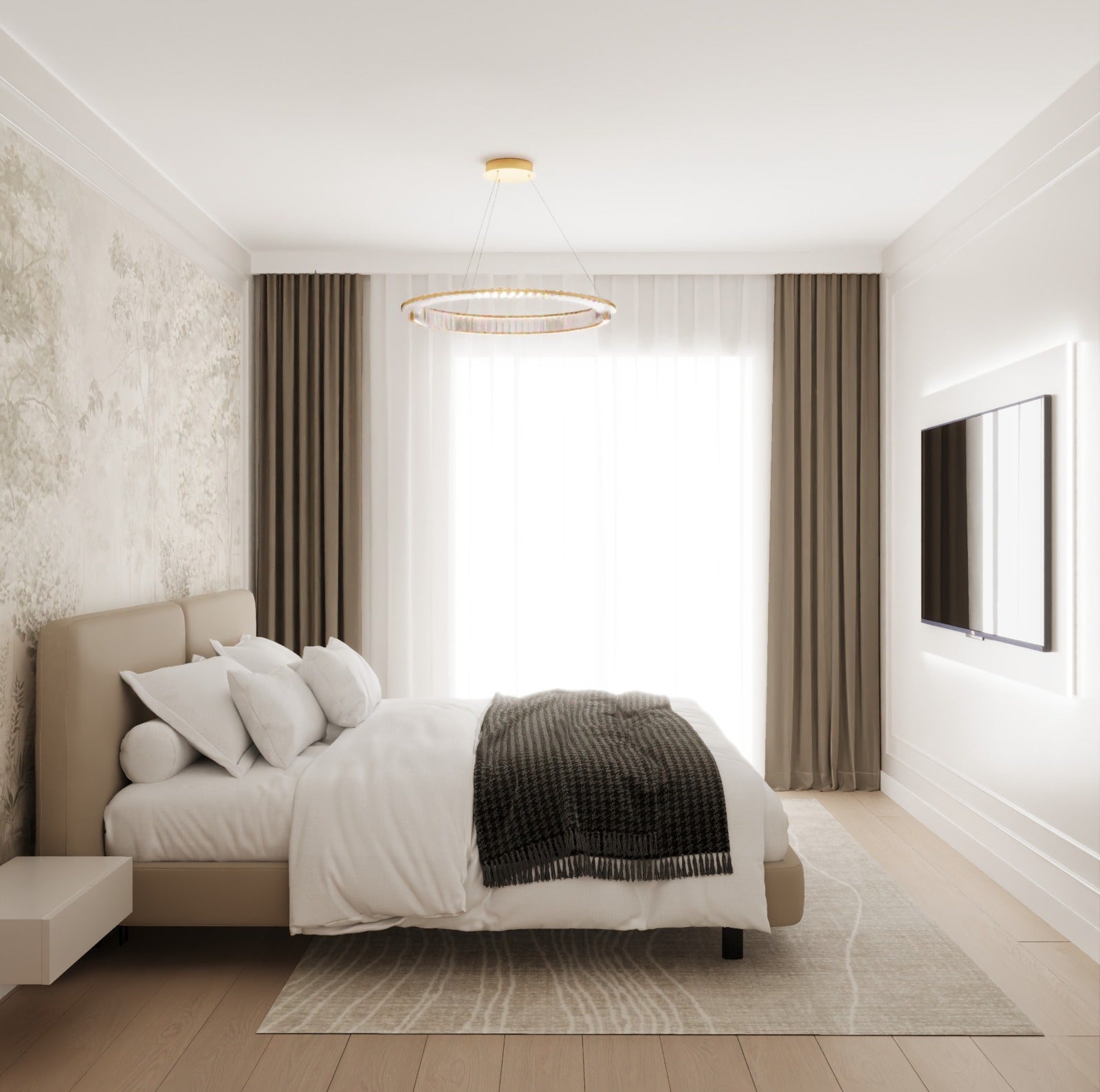 Un design elegant în tonuri calde de bej, cu suprafețe ce imită marmura și mobilier cu forme rotunjite care aduce finețe și confort. Accentele aurii și baghetările decorative completează compoziția, oferind un aer sofisticat, luminos și atemporal.