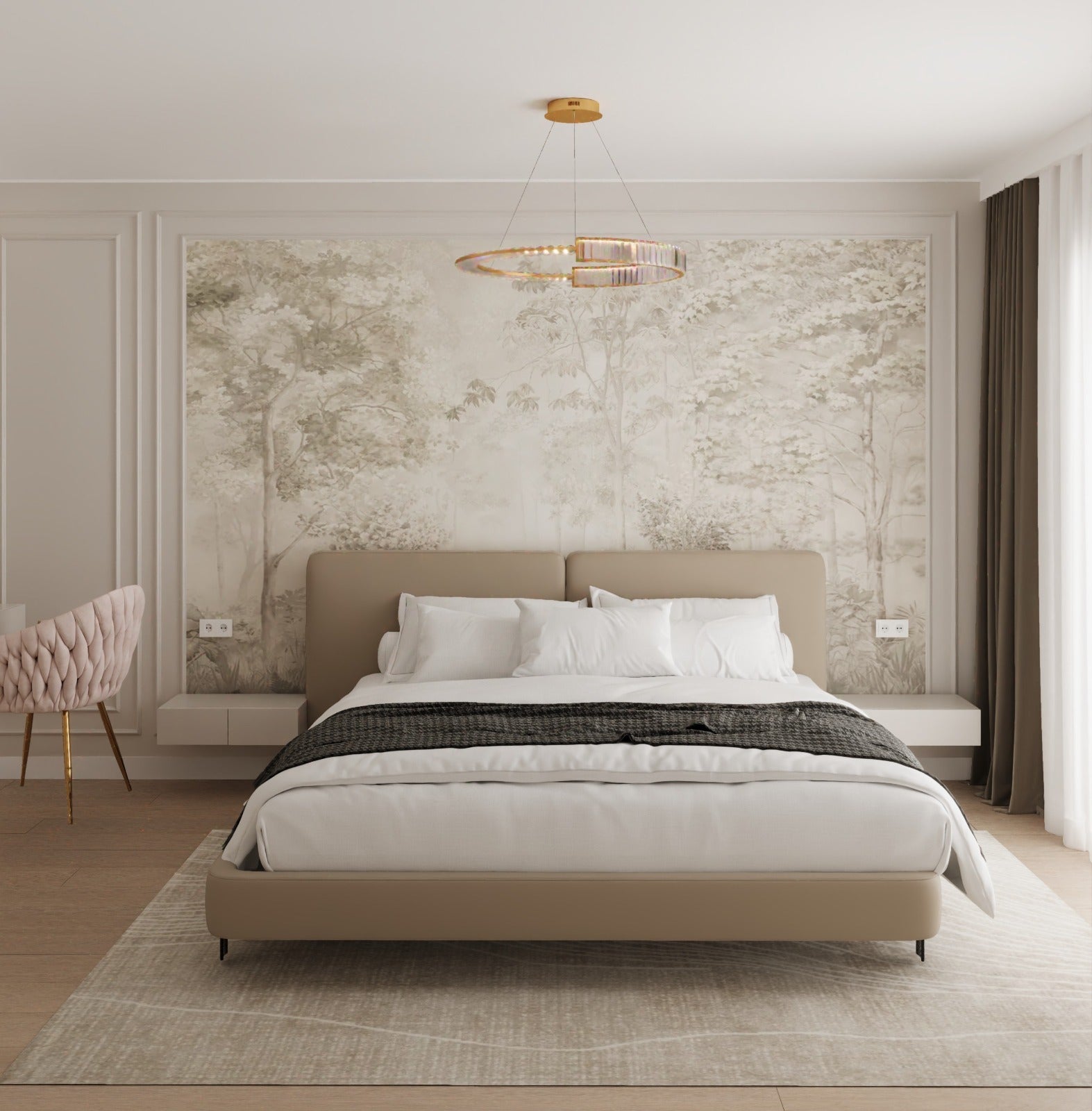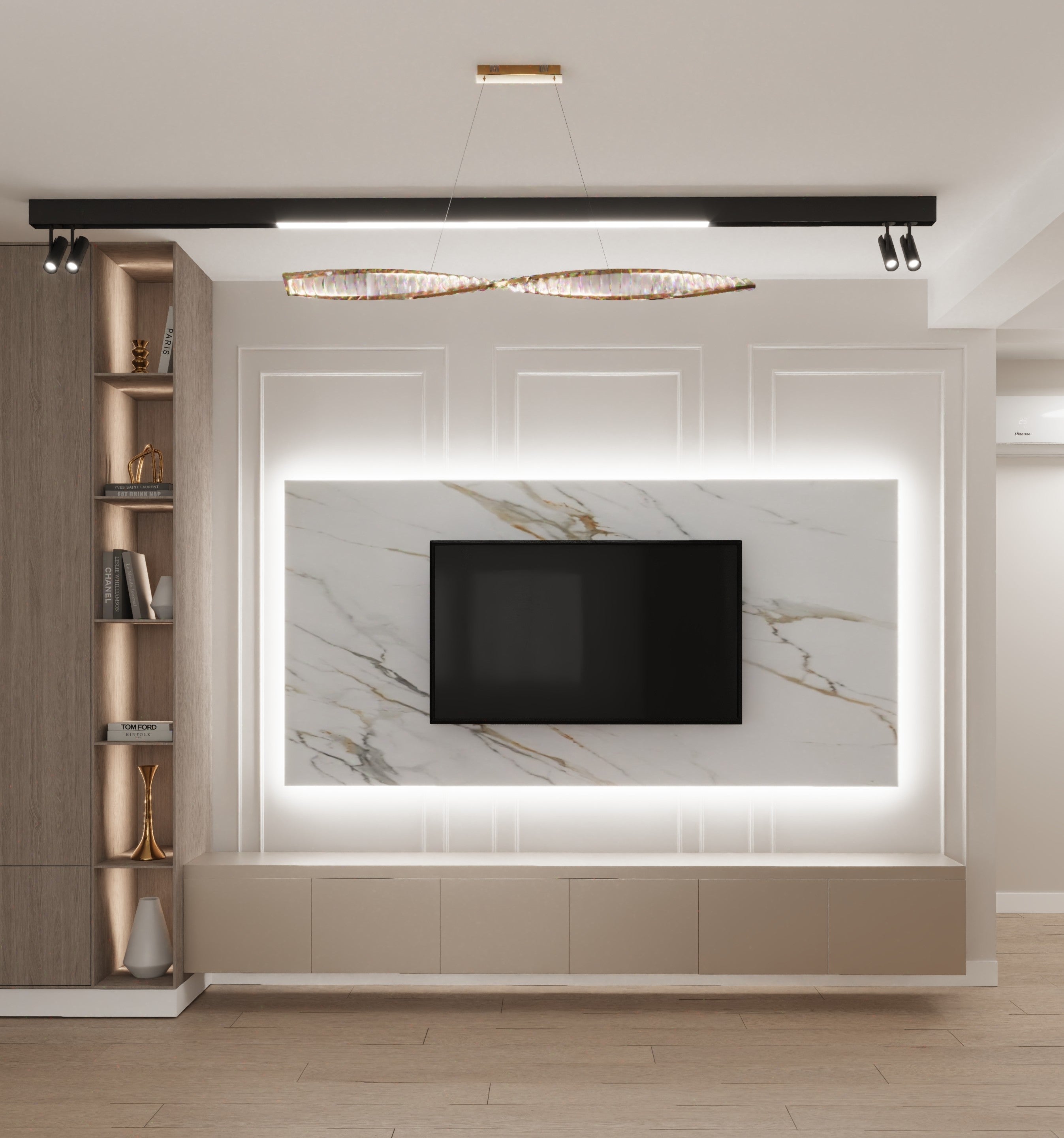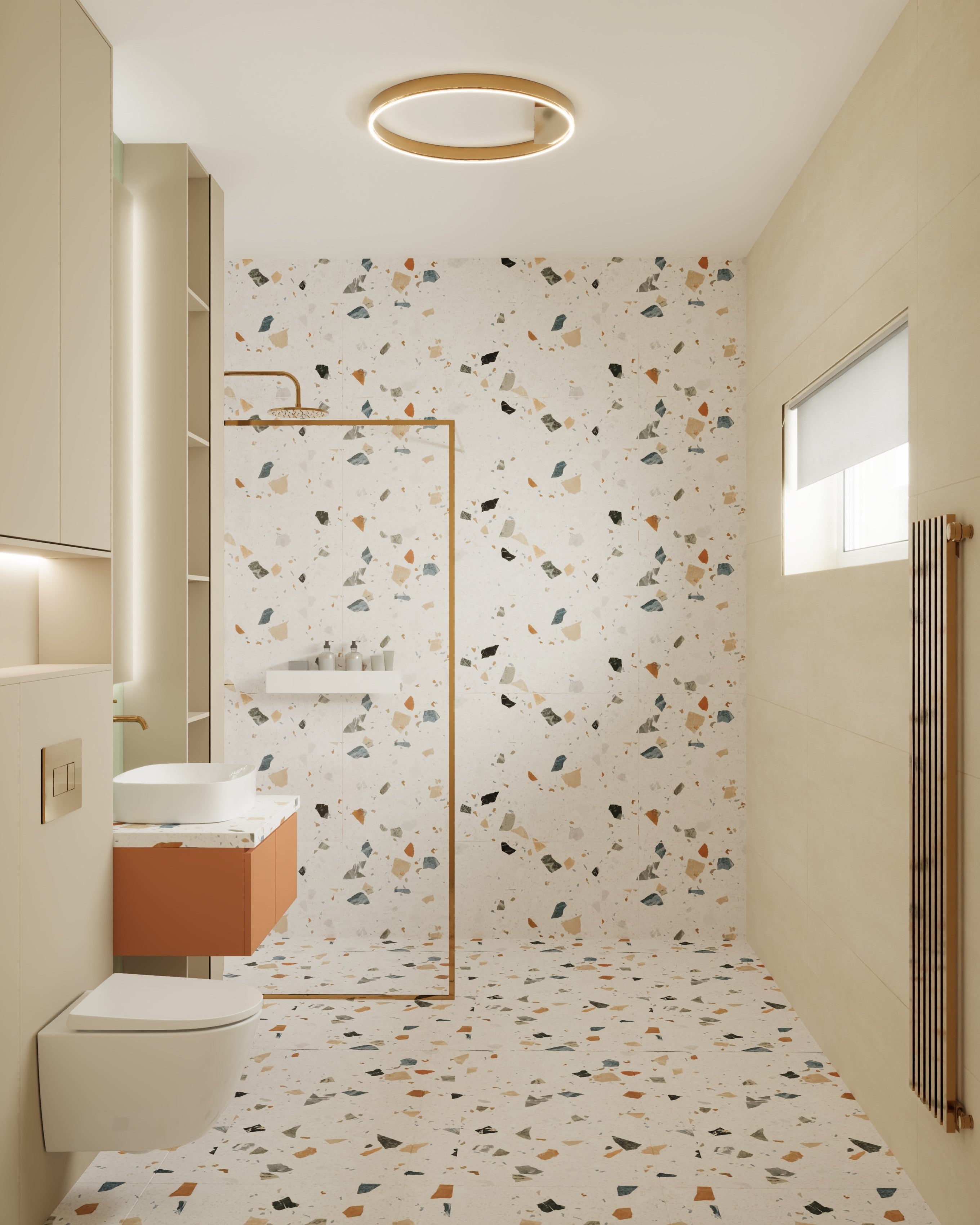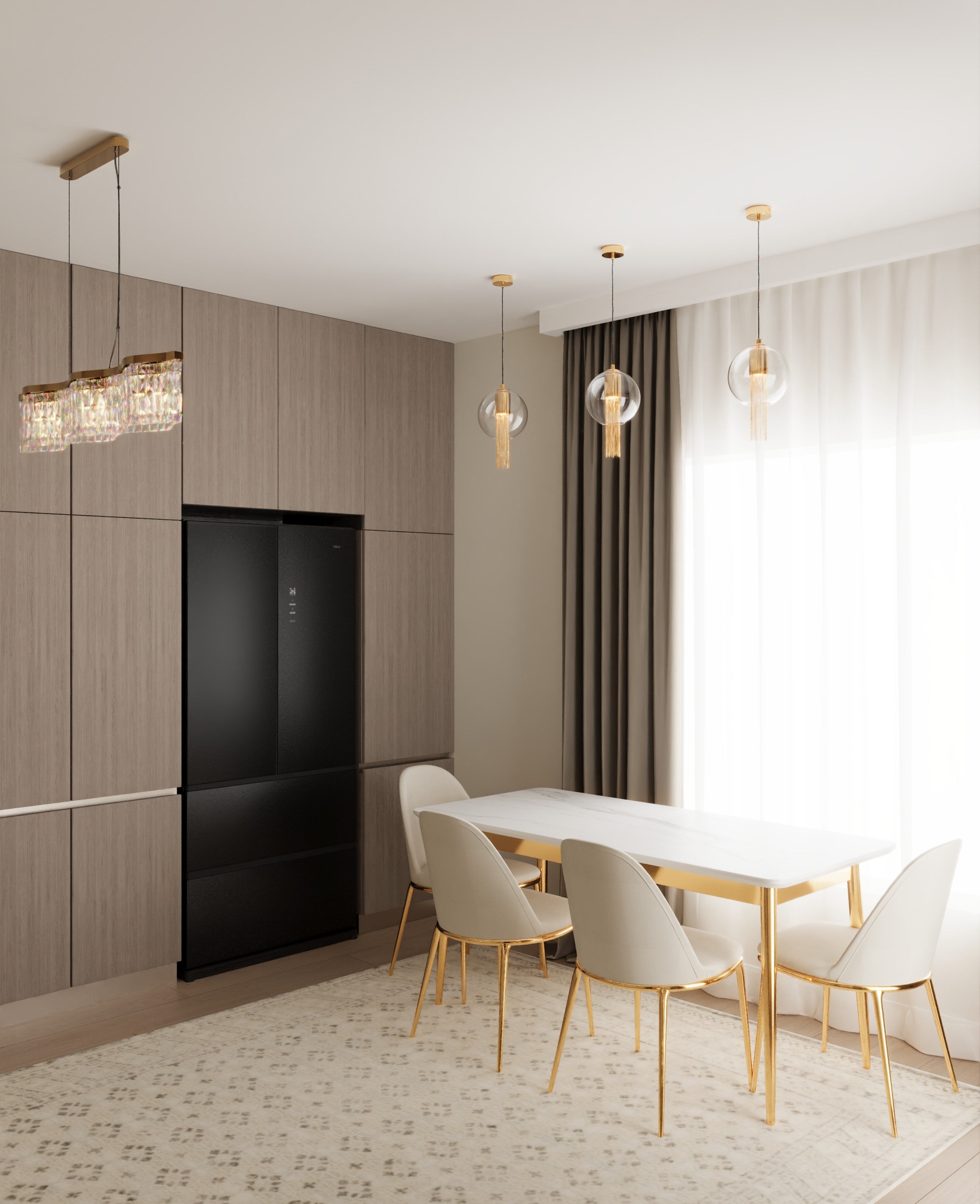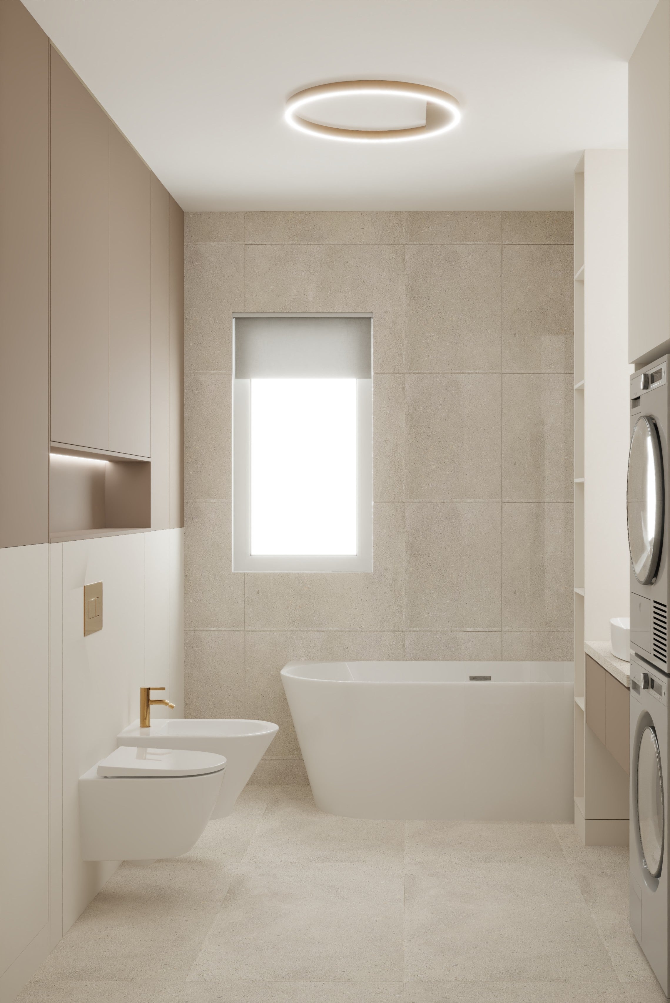 Un design elegant în tonuri calde de bej, cu suprafețe ce imită marmura și mobilier cu forme rotunjite care aduce finețe și confort. Accentele aurii și baghetările decorative completează compoziția, oferind un aer sofisticat, luminos și atemporal.