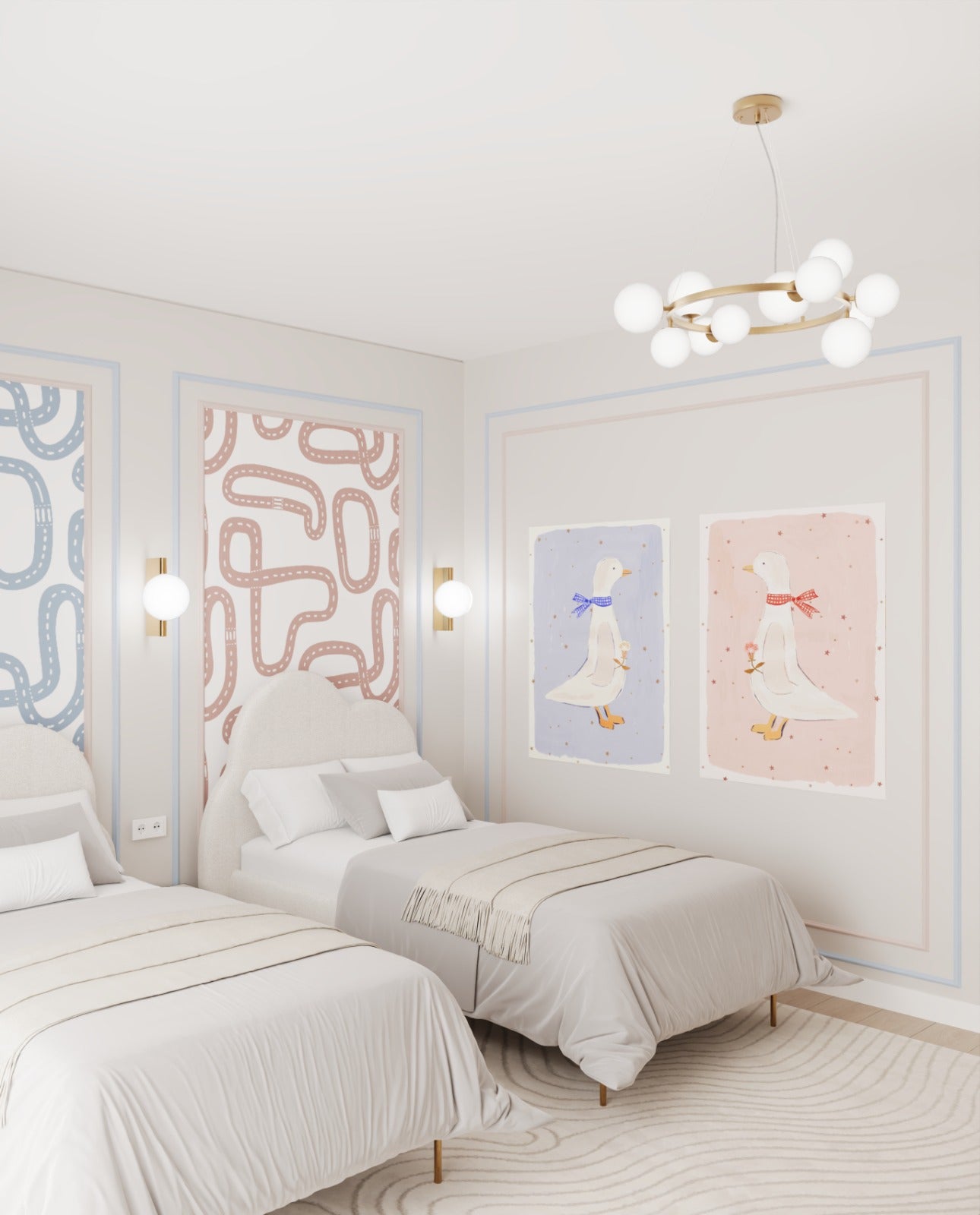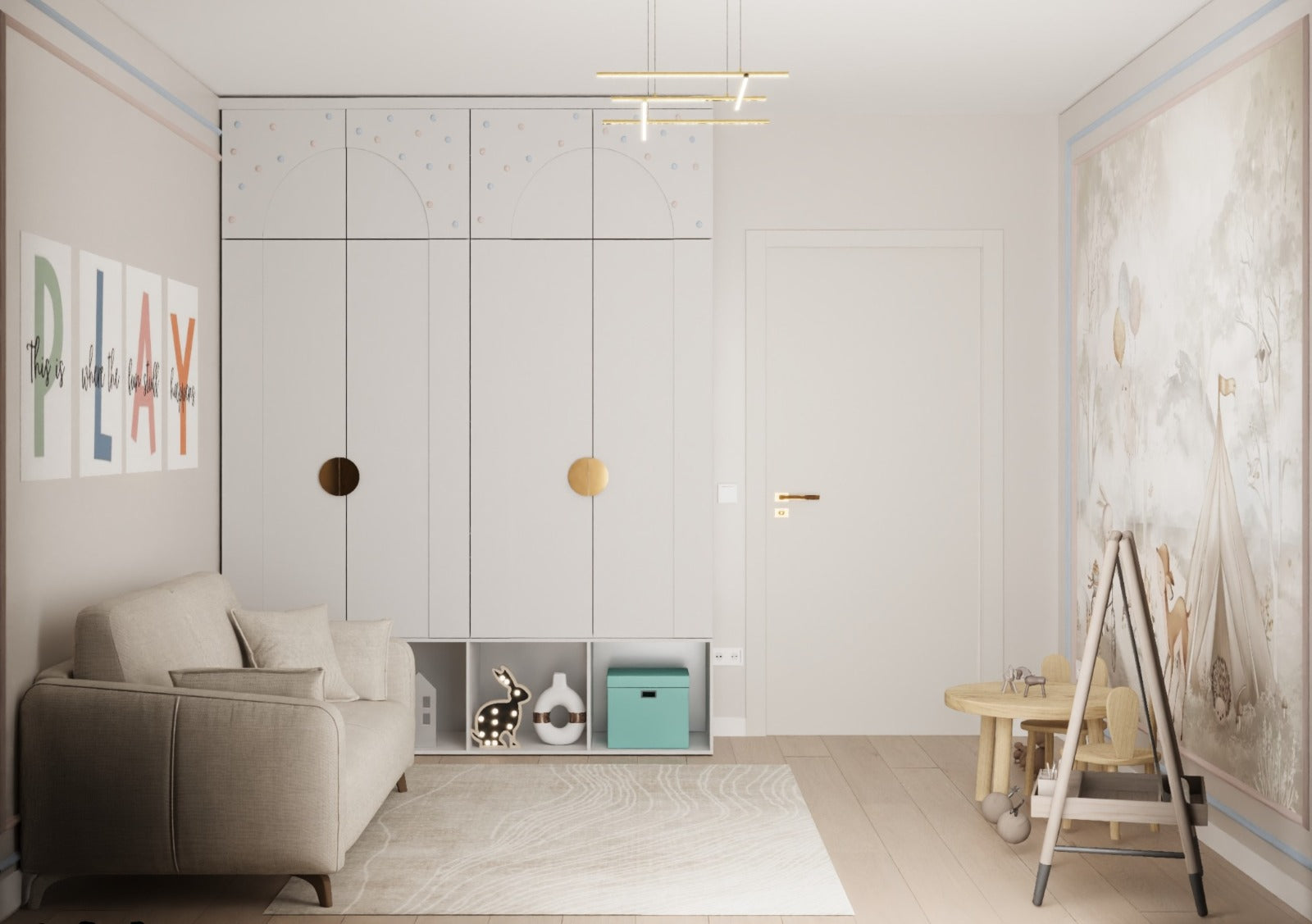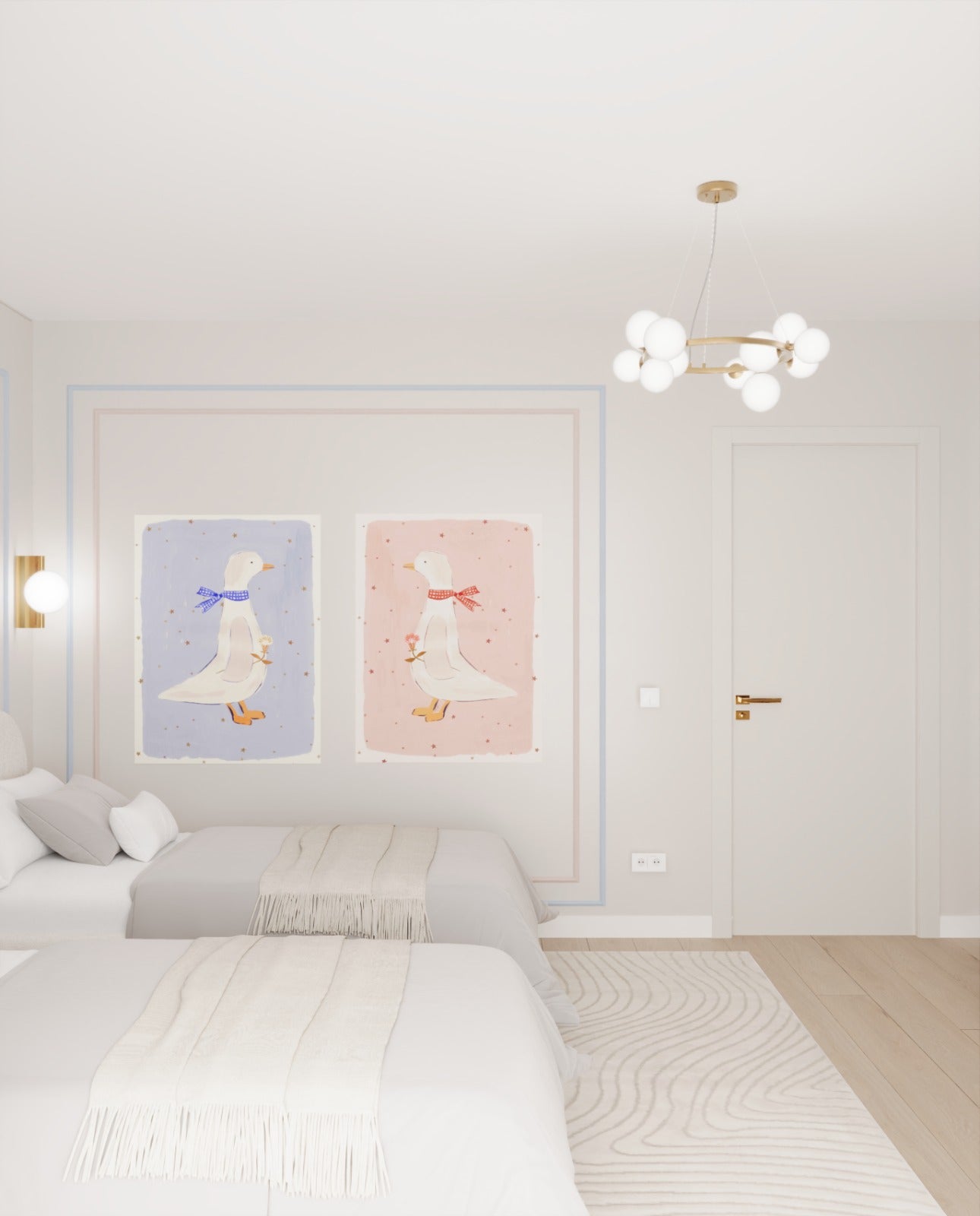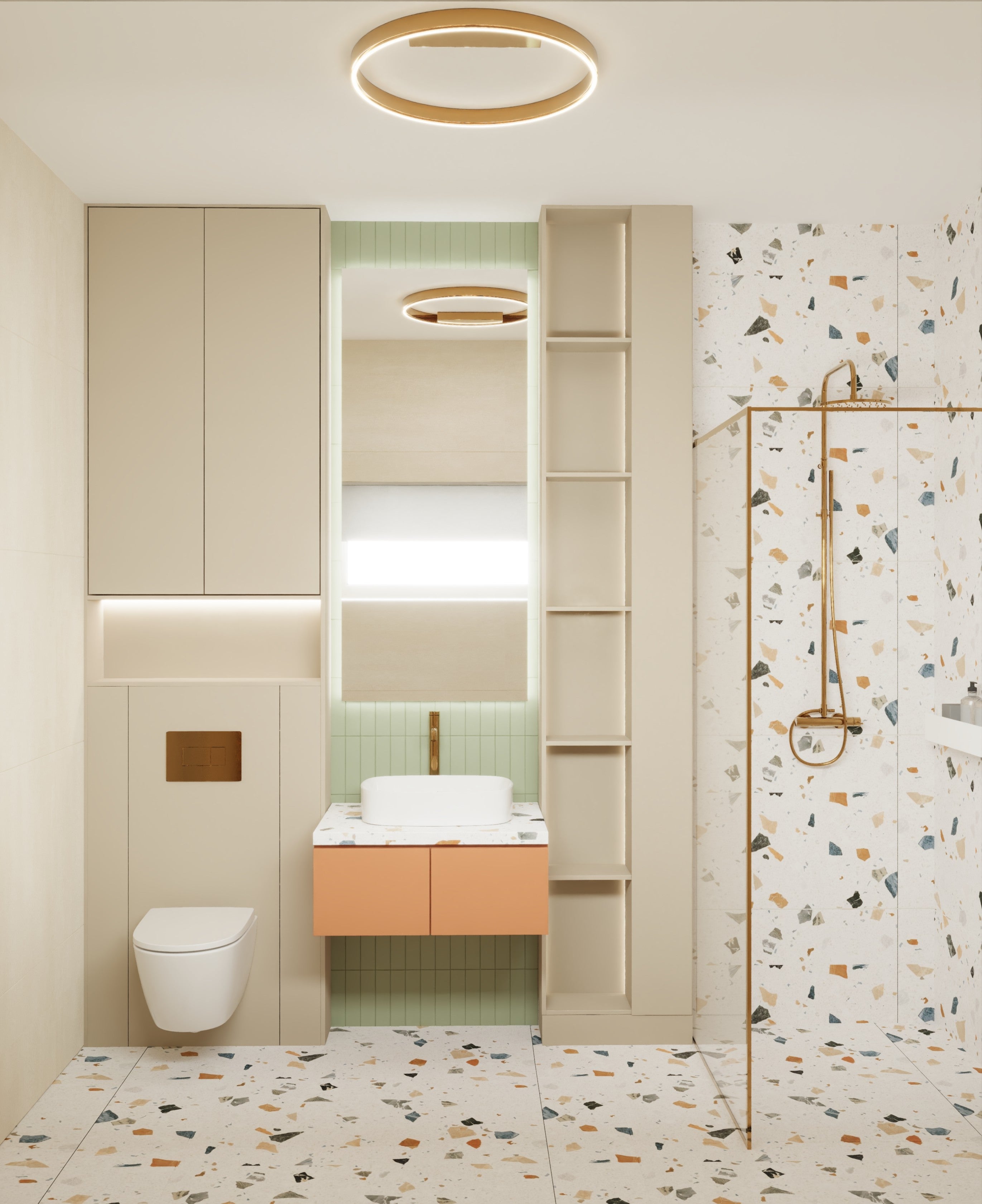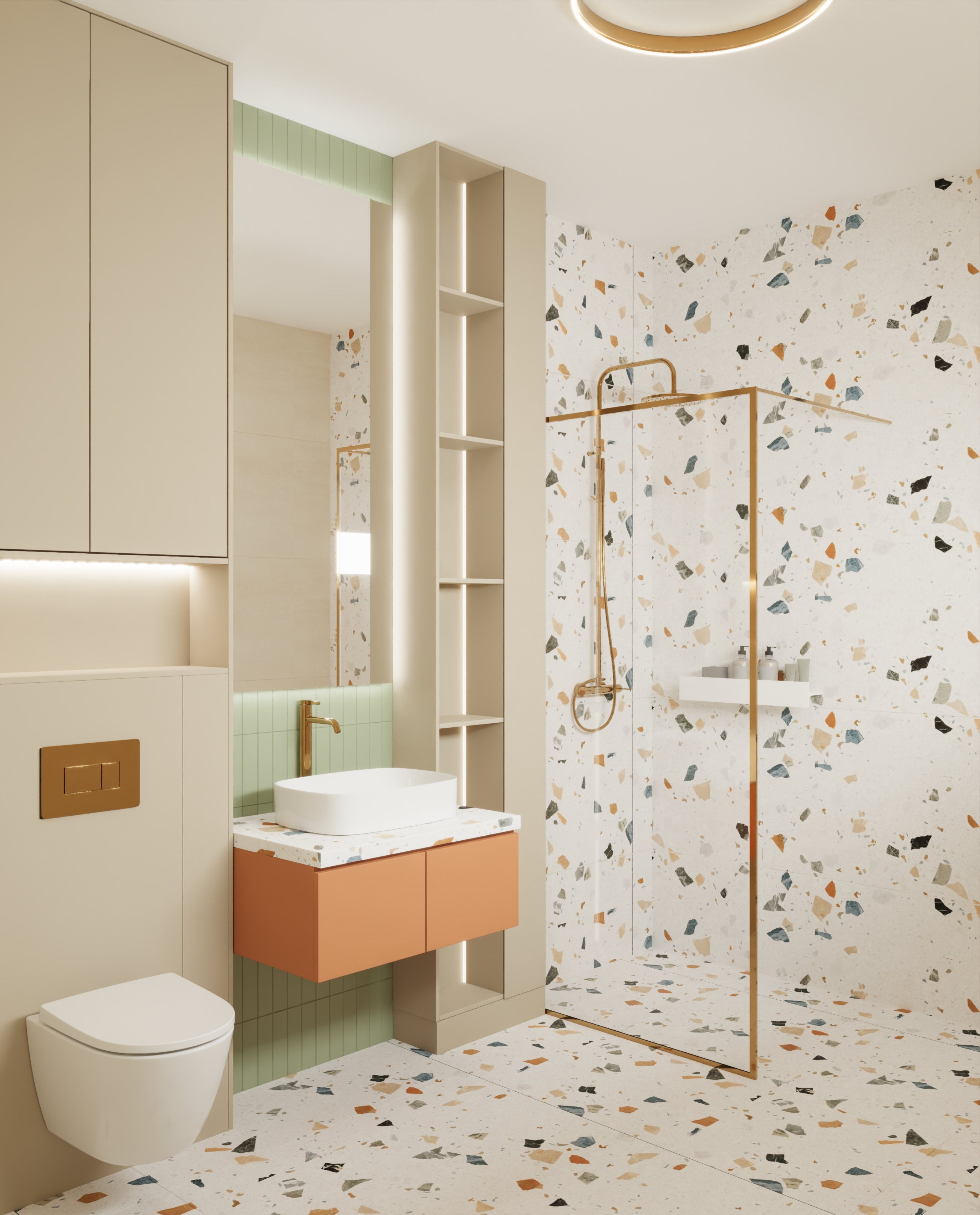Un design elegant în tonuri calde de bej, cu suprafețe ce imită marmura și mobilier cu forme rotunjite care aduce finețe și confort. Accentele aurii și baghetările decorative completează compoziția, oferind un aer sofisticat, luminos și atemporal.