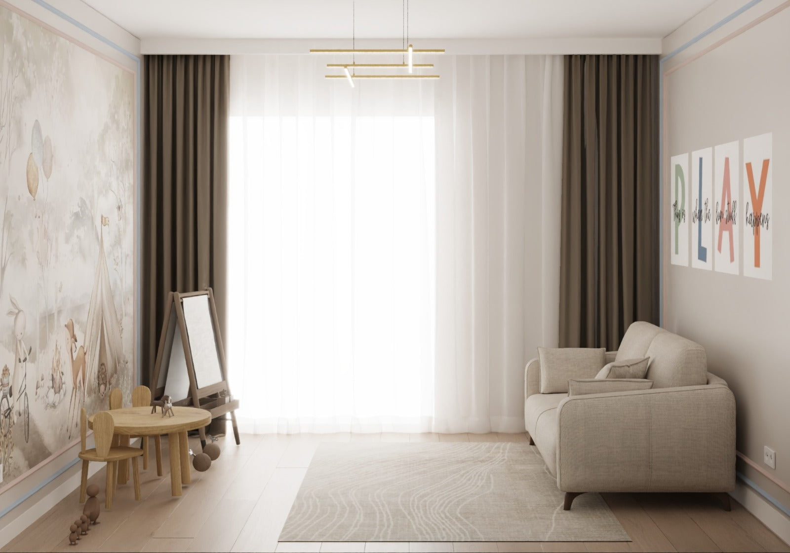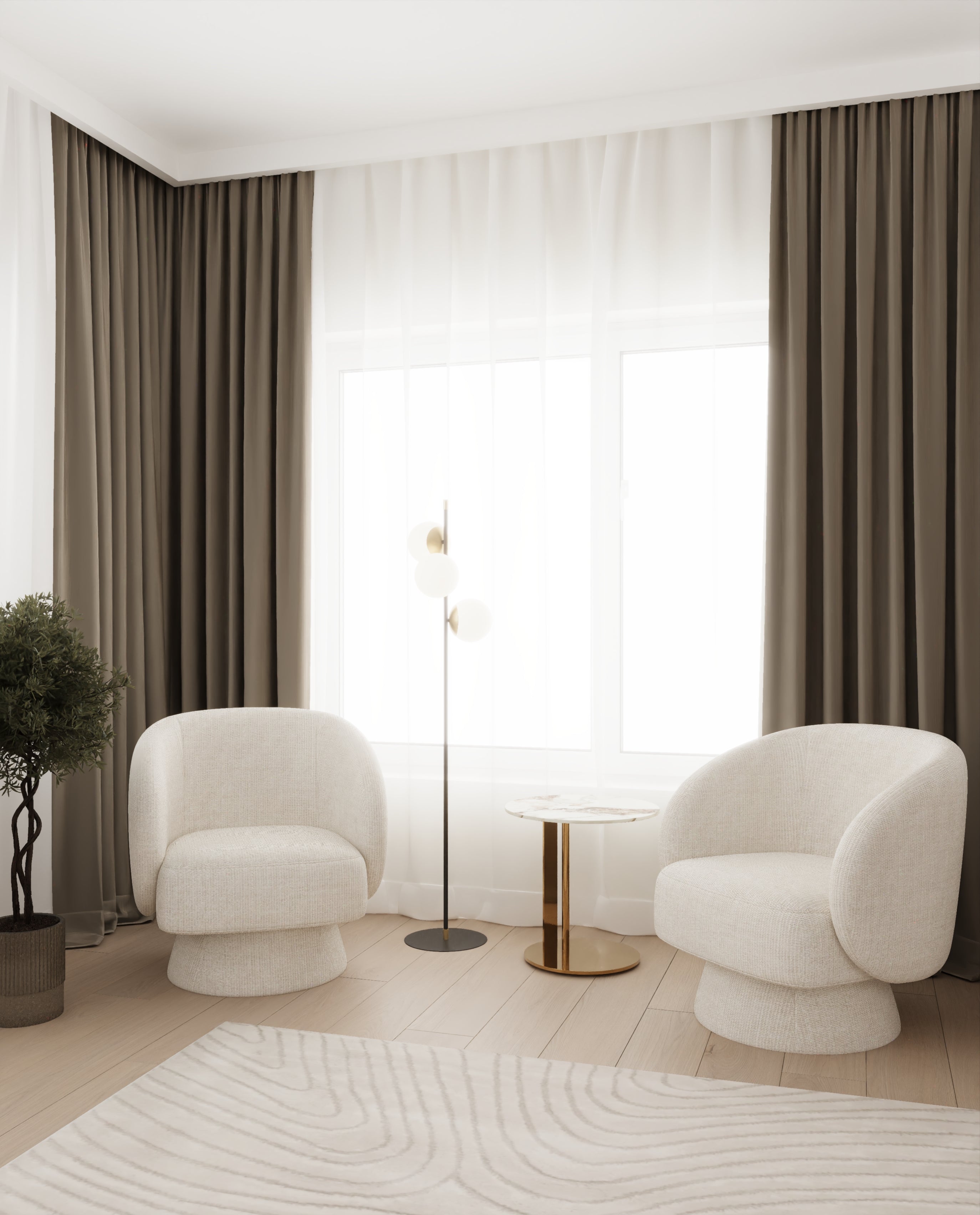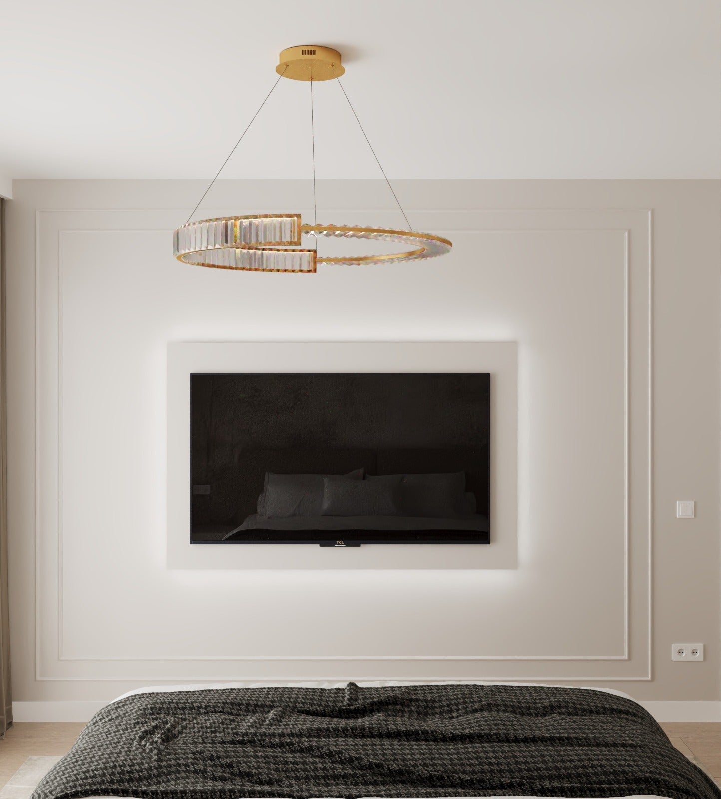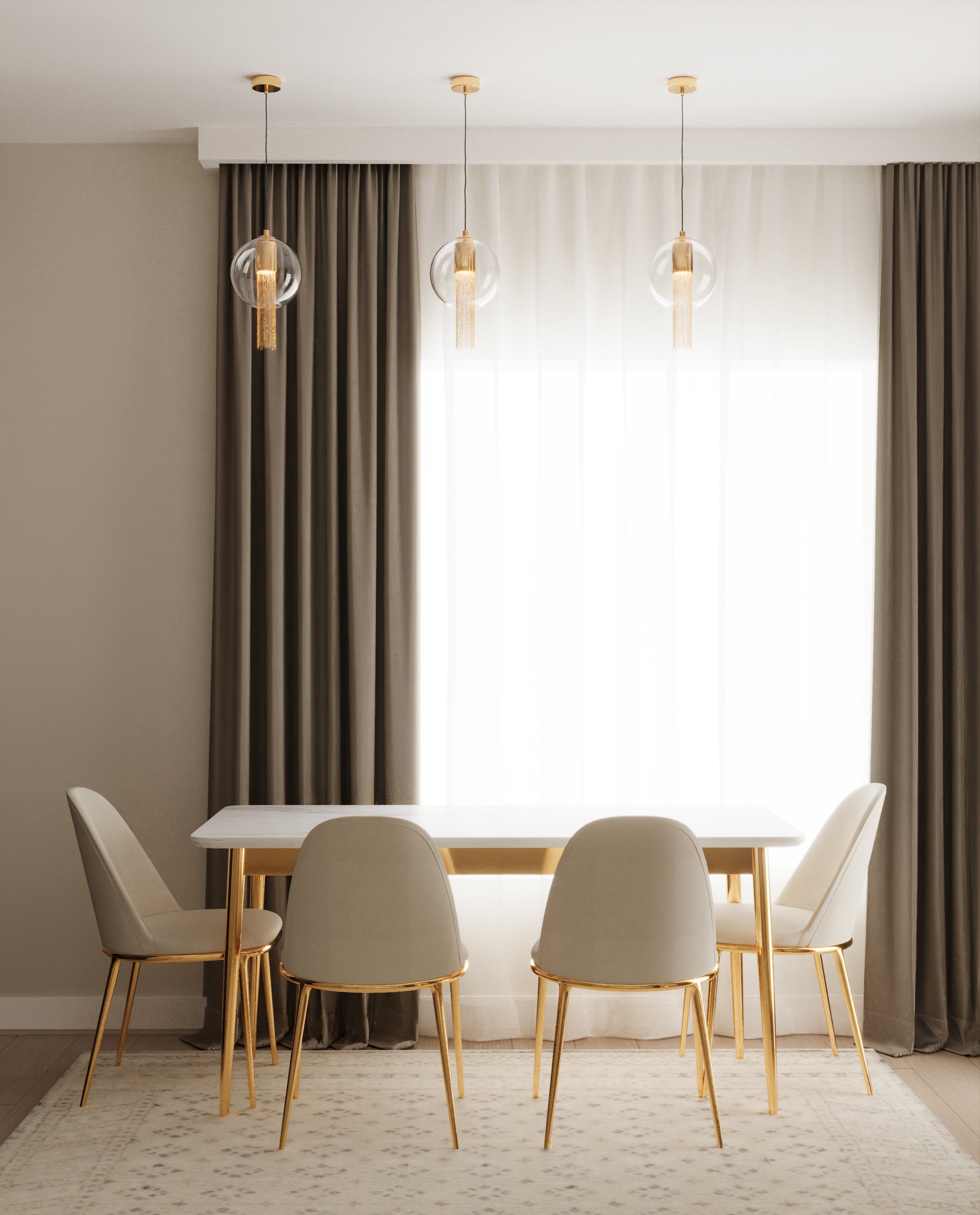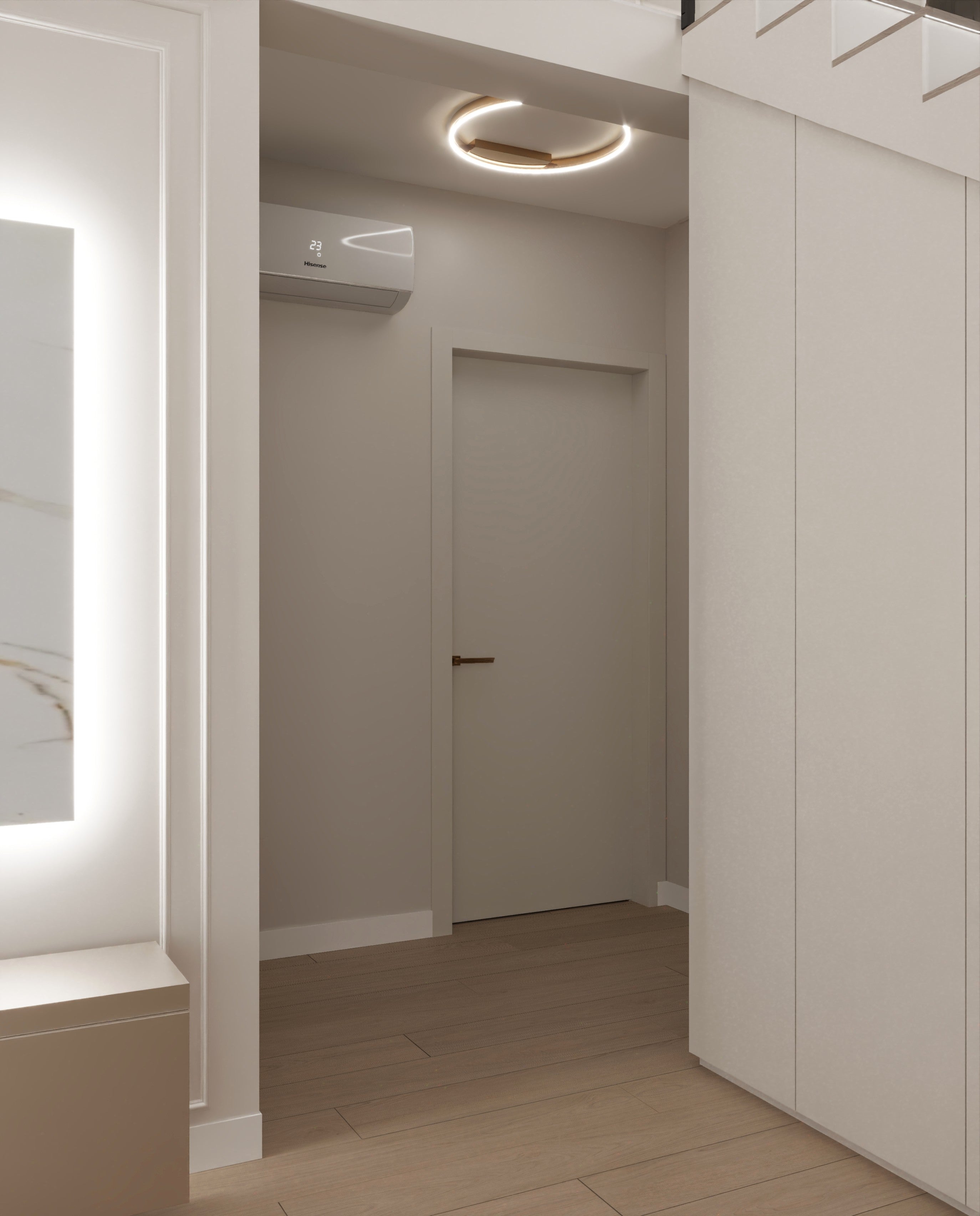 Un design elegant în tonuri calde de bej, cu suprafețe ce imită marmura și mobilier cu forme rotunjite care aduce finețe și confort. Accentele aurii și baghetările decorative completează compoziția, oferind un aer sofisticat, luminos și atemporal.