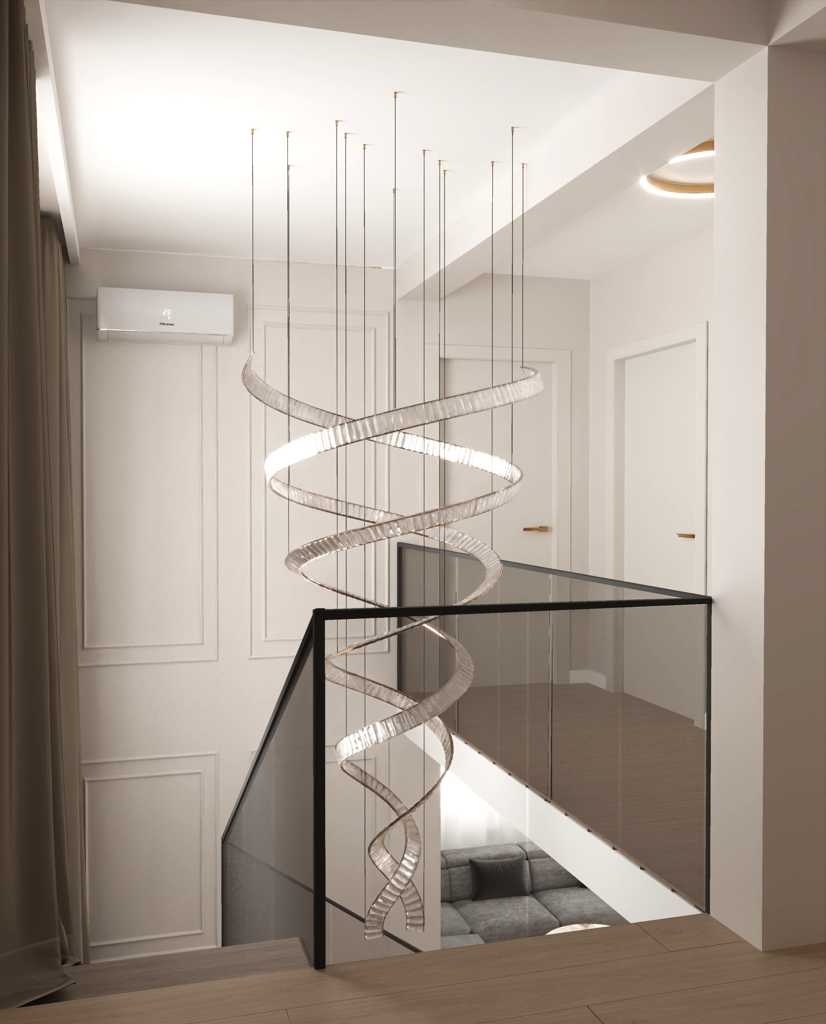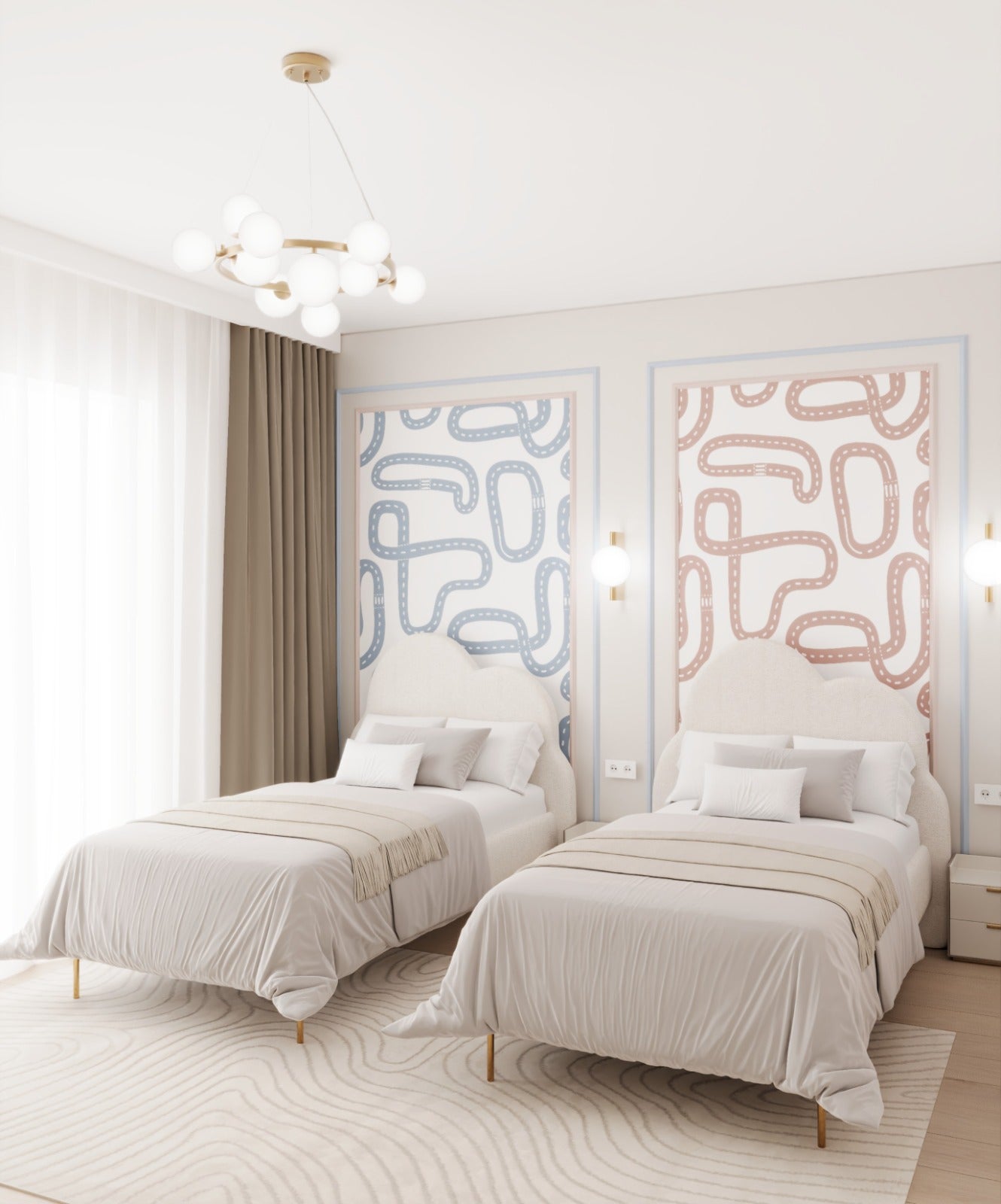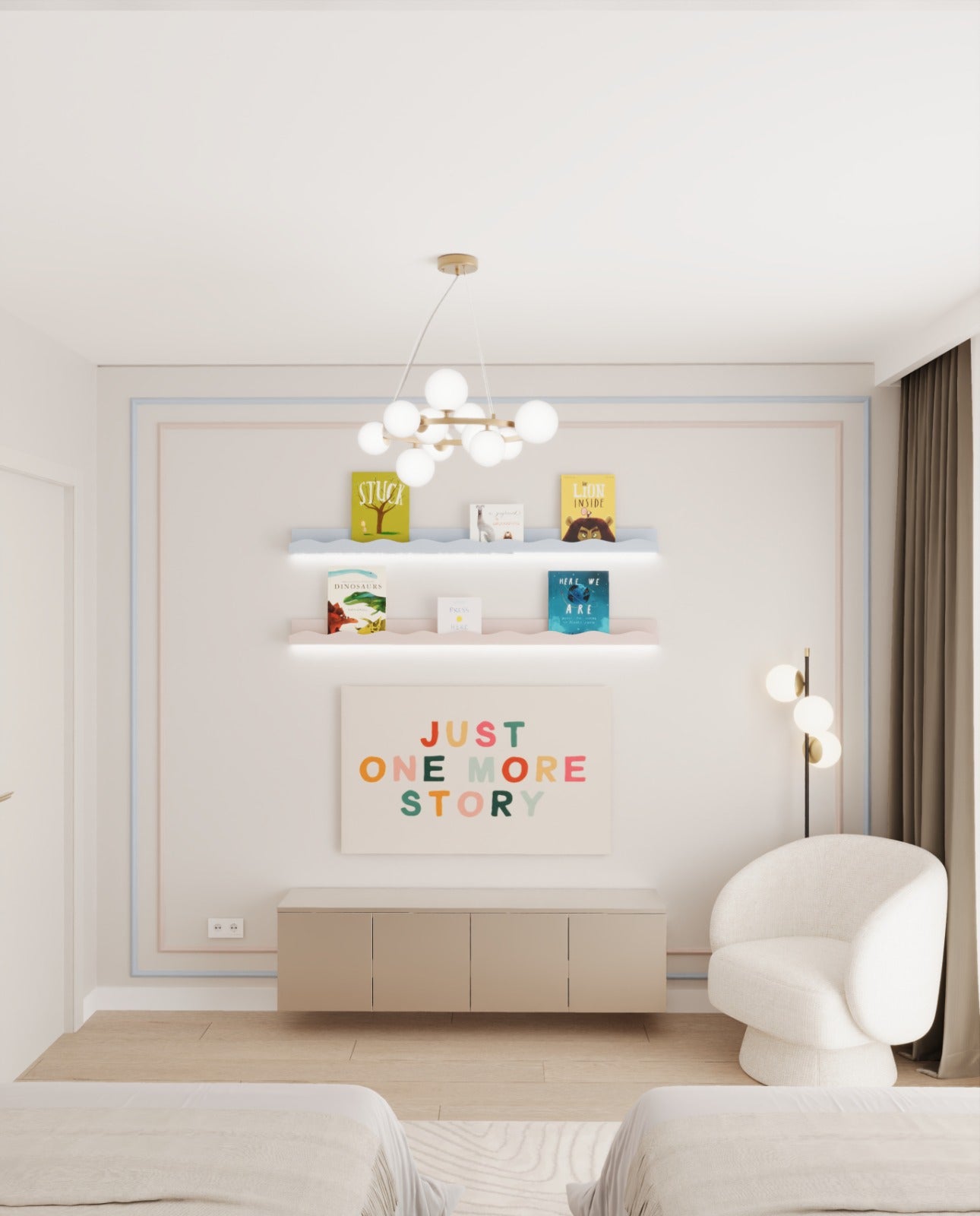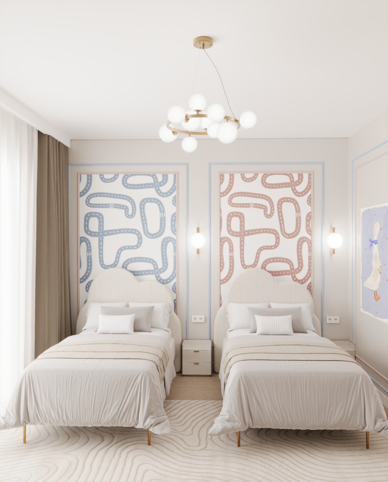 Un design elegant în tonuri calde de bej, cu suprafețe ce imită marmura și mobilier cu forme rotunjite care aduce finețe și confort. Accentele aurii și baghetările decorative completează compoziția, oferind un aer sofisticat, luminos și atemporal.