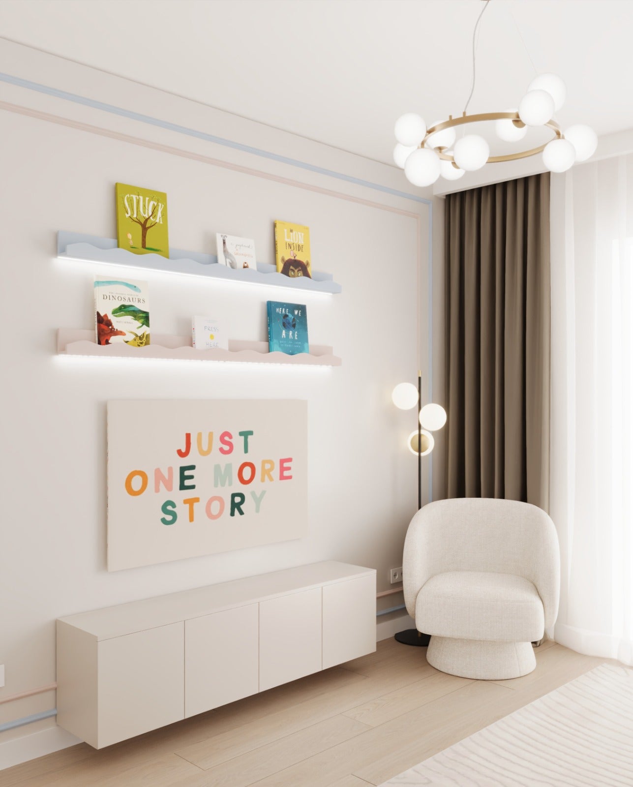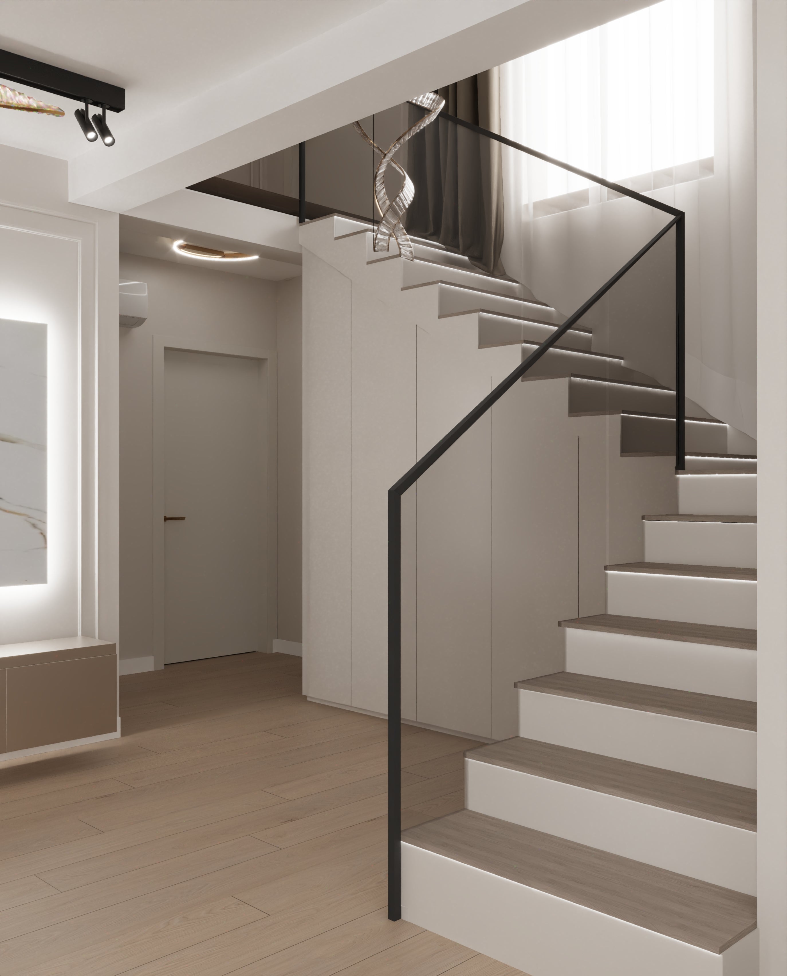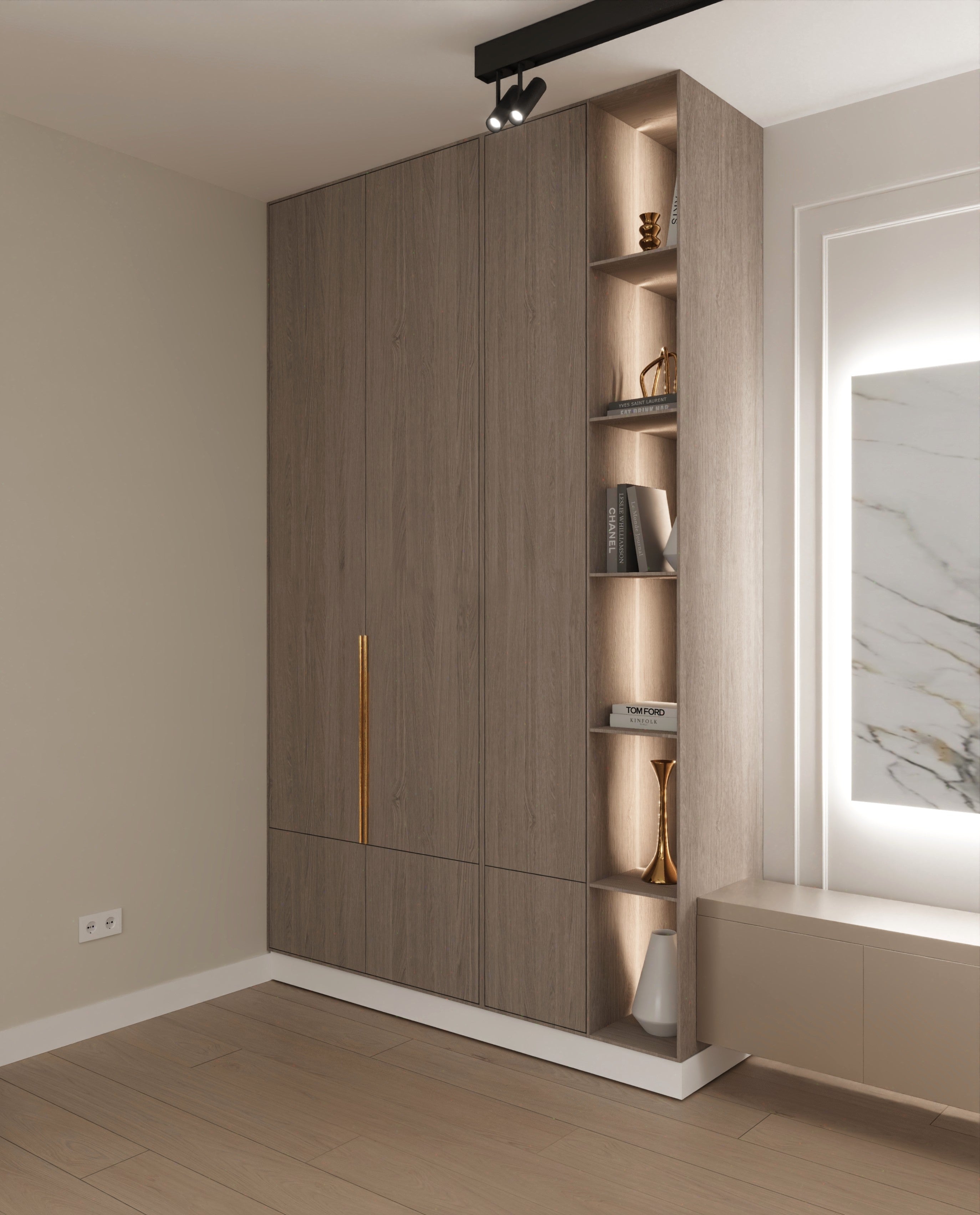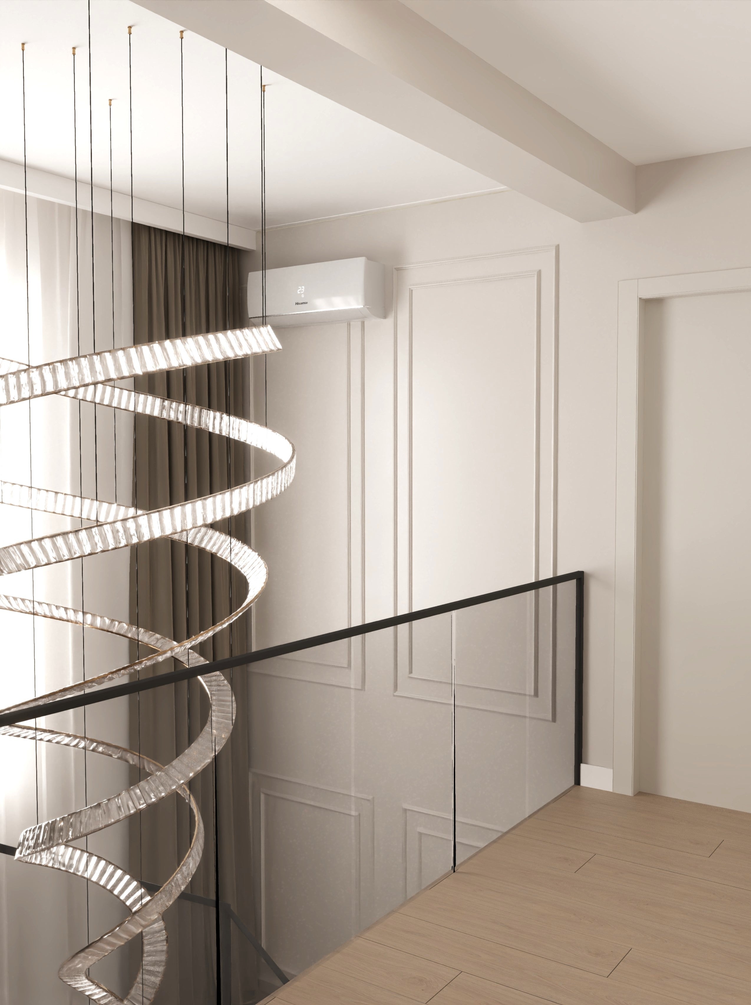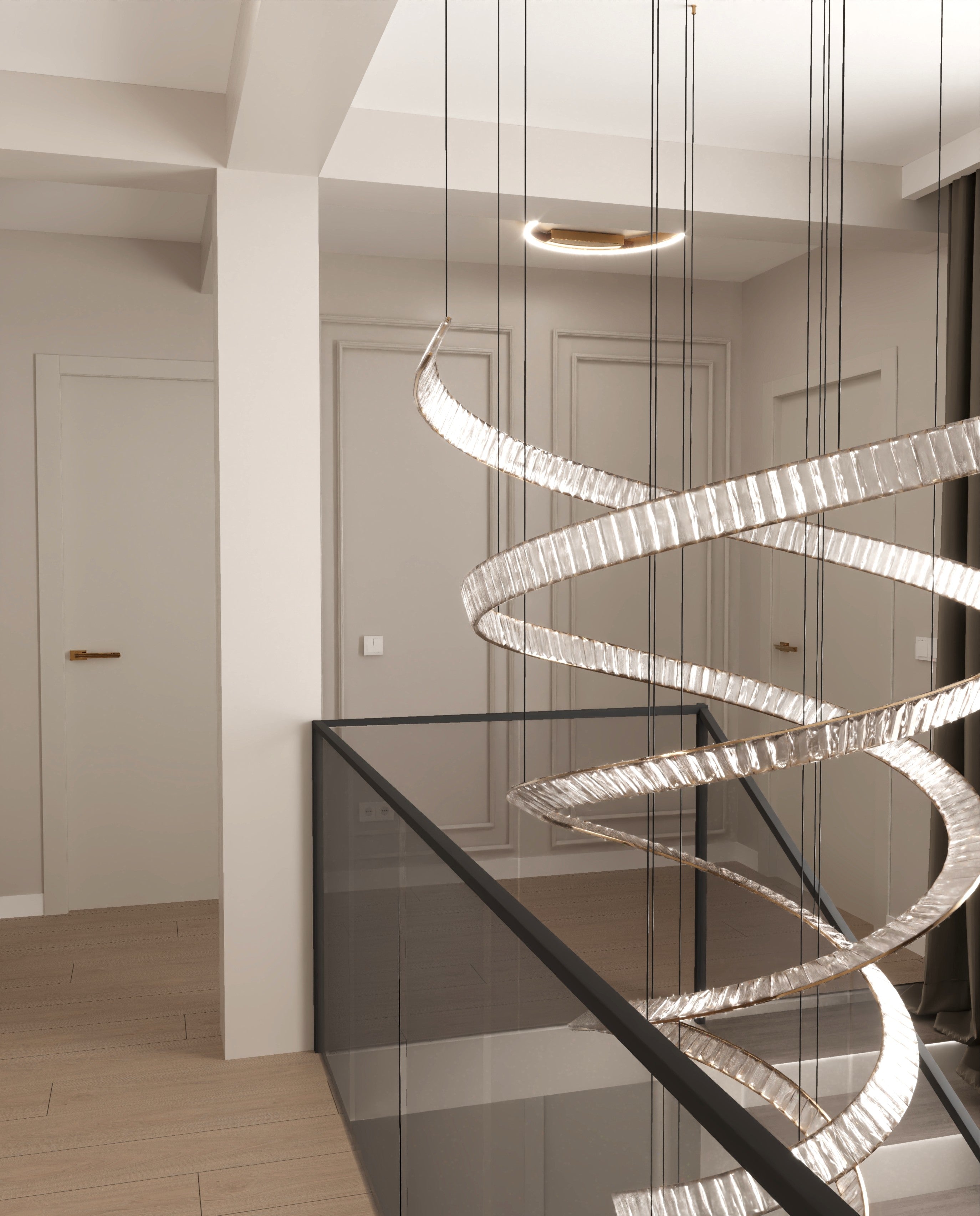 Un design elegant în tonuri calde de bej, cu suprafețe ce imită marmura și mobilier cu forme rotunjite care aduce finețe și confort. Accentele aurii și baghetările decorative completează compoziția, oferind un aer sofisticat, luminos și atemporal.
