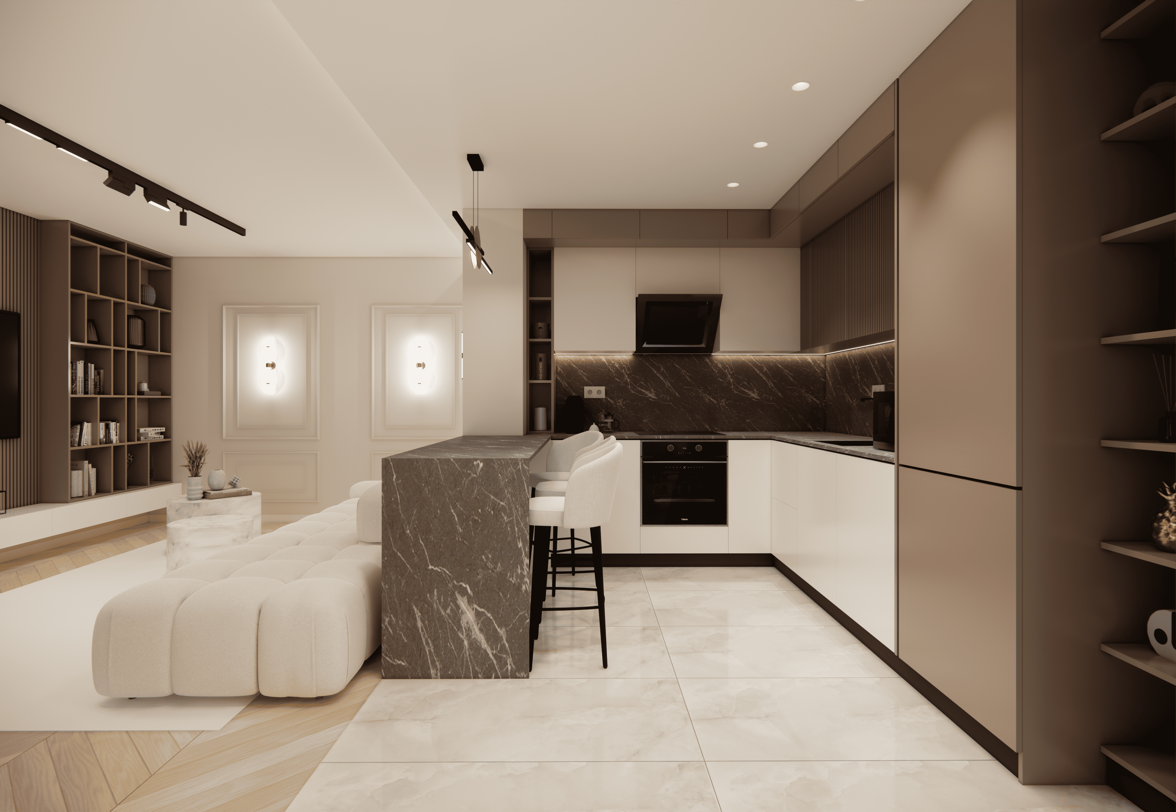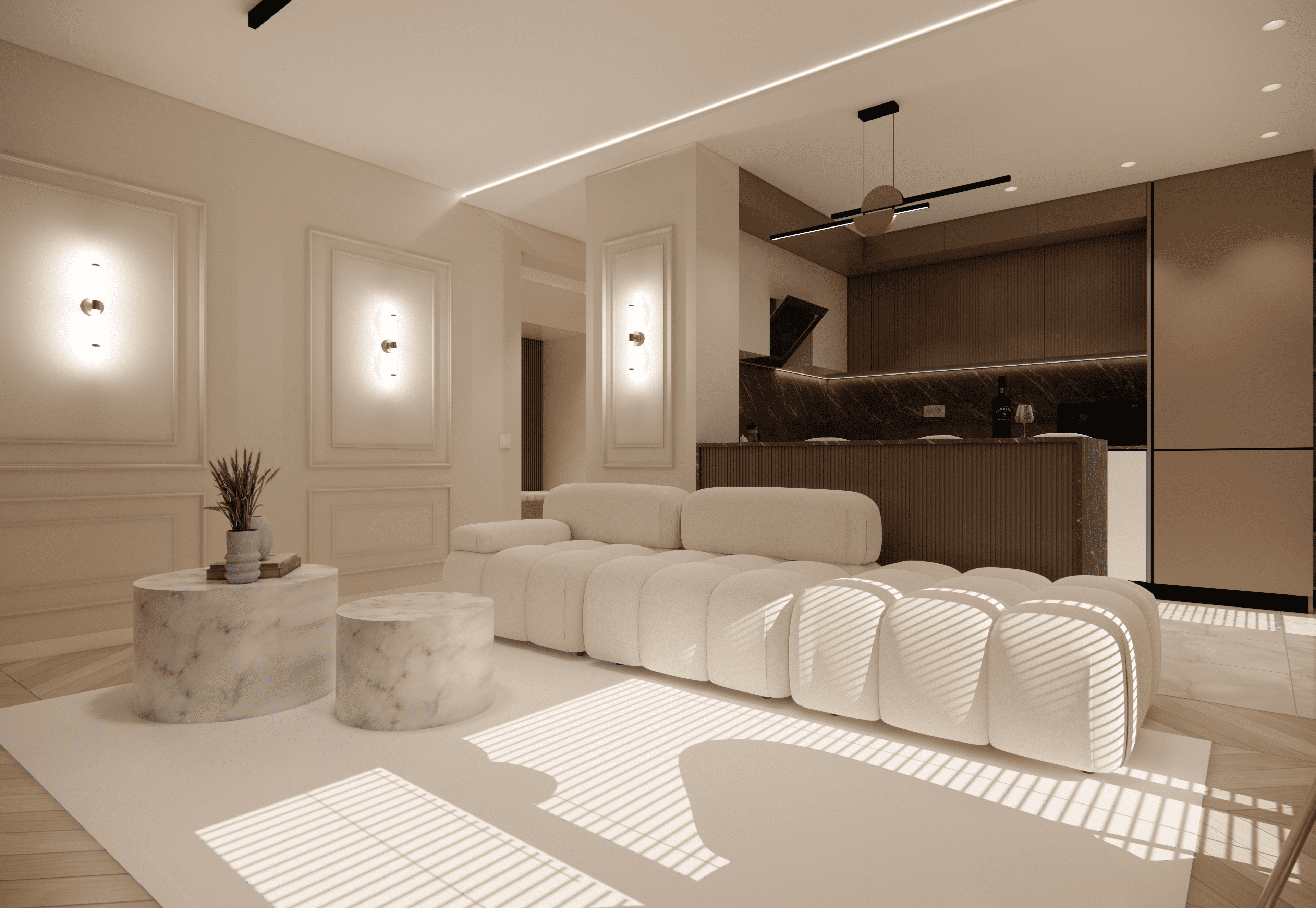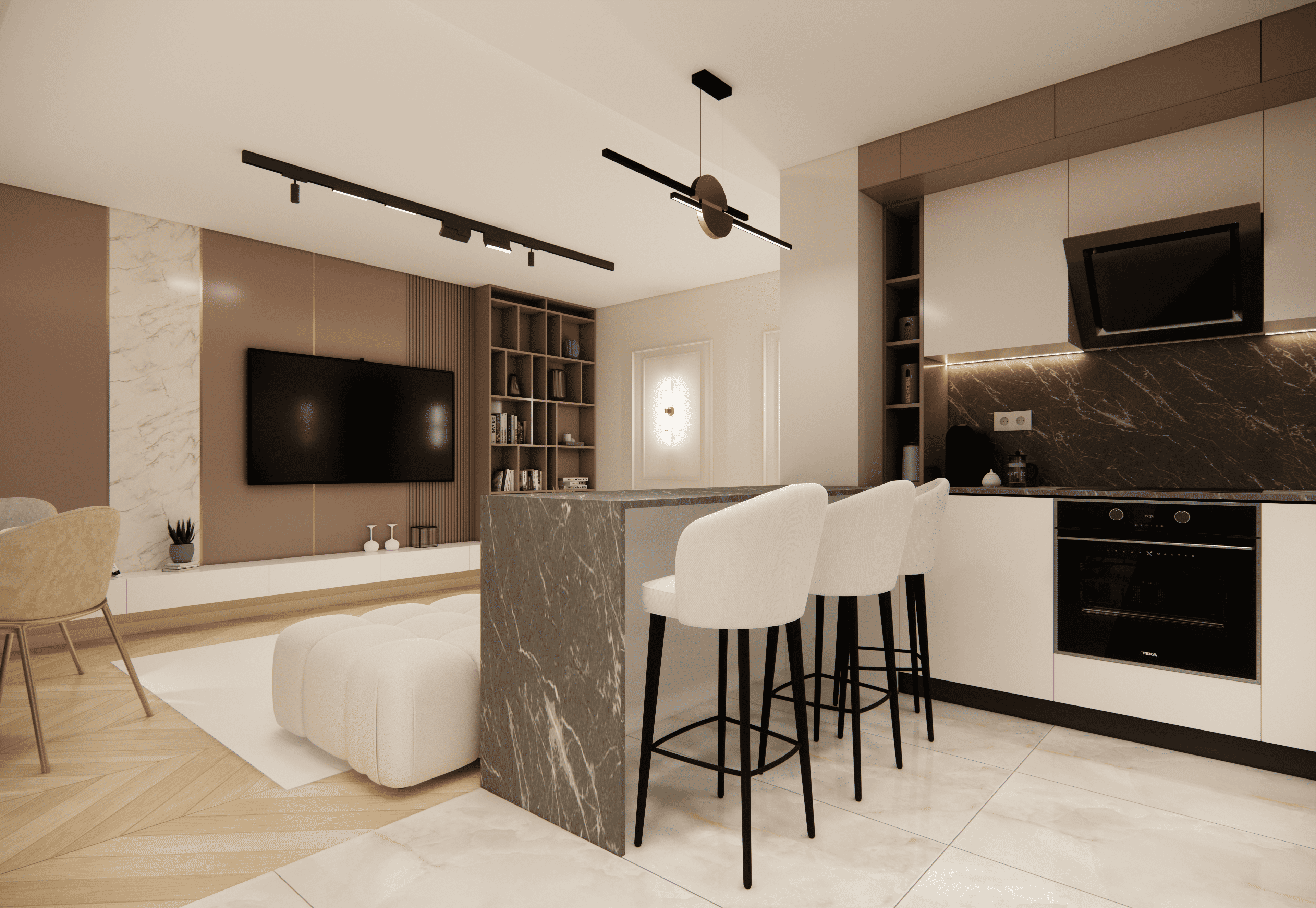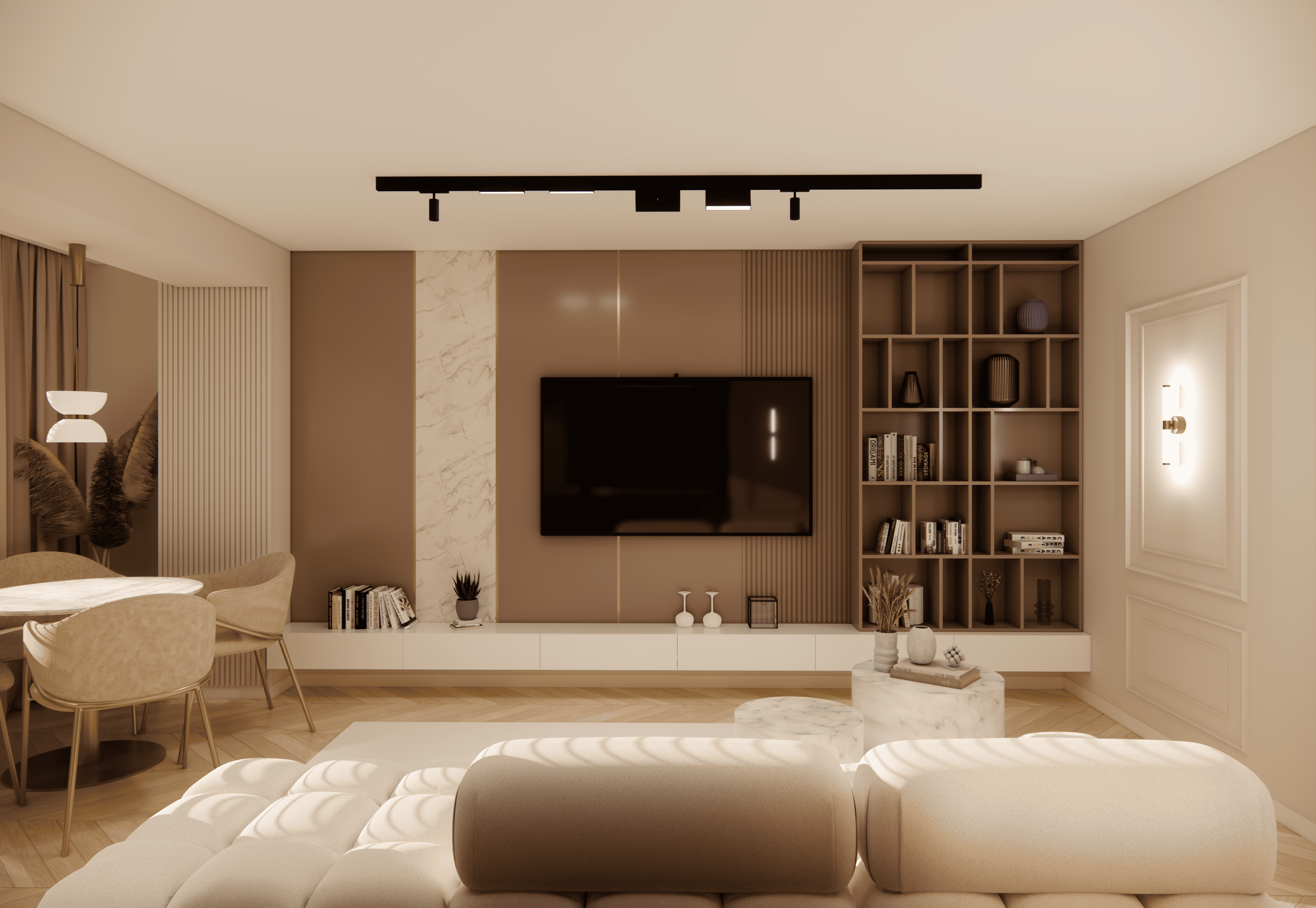 Spațiul este amenajat în stil modern-luxos cu accente minimaliste, combinând linii curate, volumetrii simple, și materiale premium precum marmura, catifeaua, metalul auriu și lemnul deschis. Atmosfera este una caldă, relaxată și echilibrată, cu o paletă cromatică bazată pe nuanțe neutre de bej, crem, maro-deschis și accente aurii.