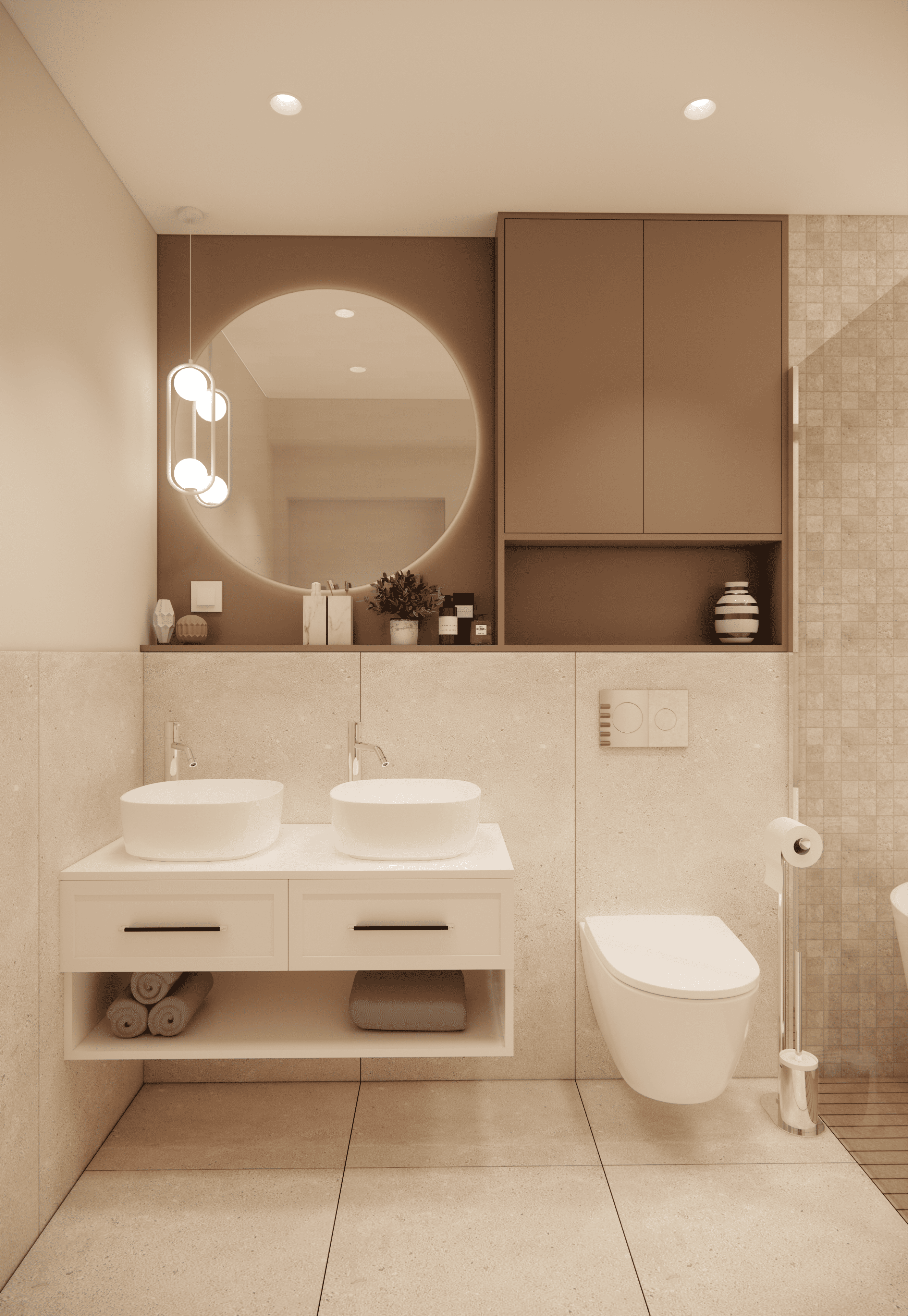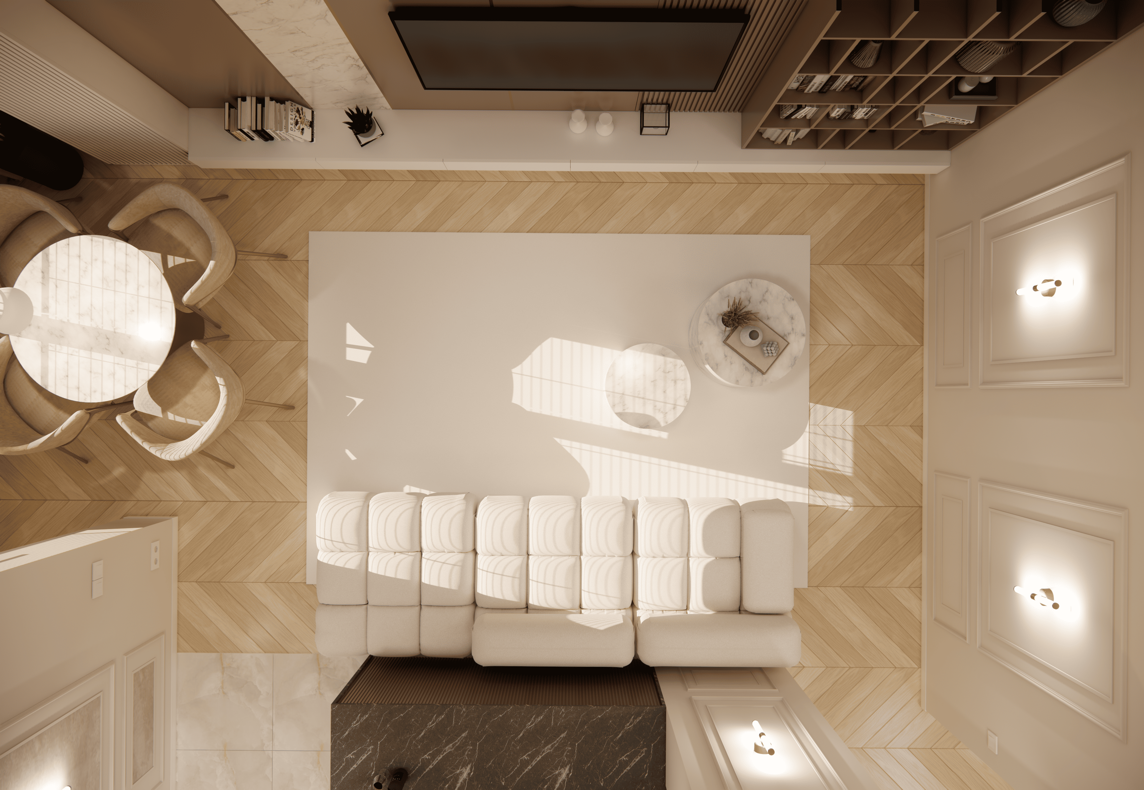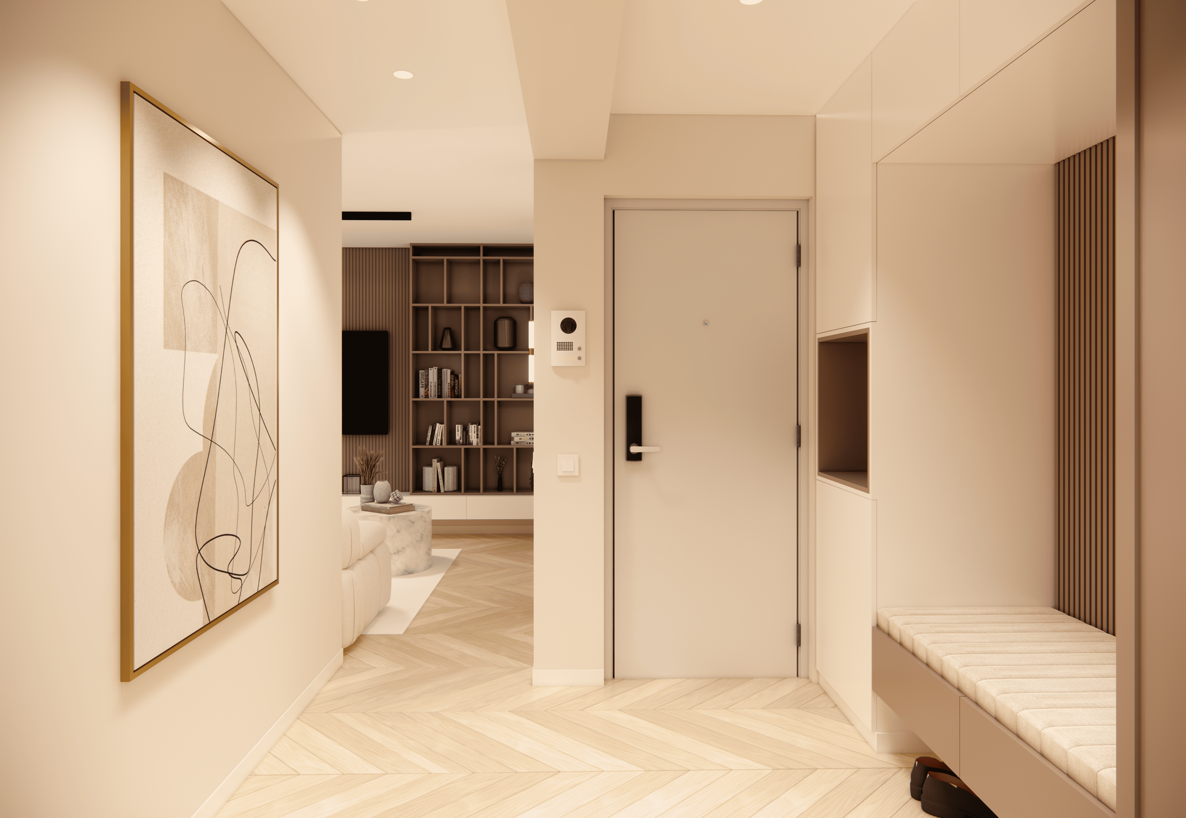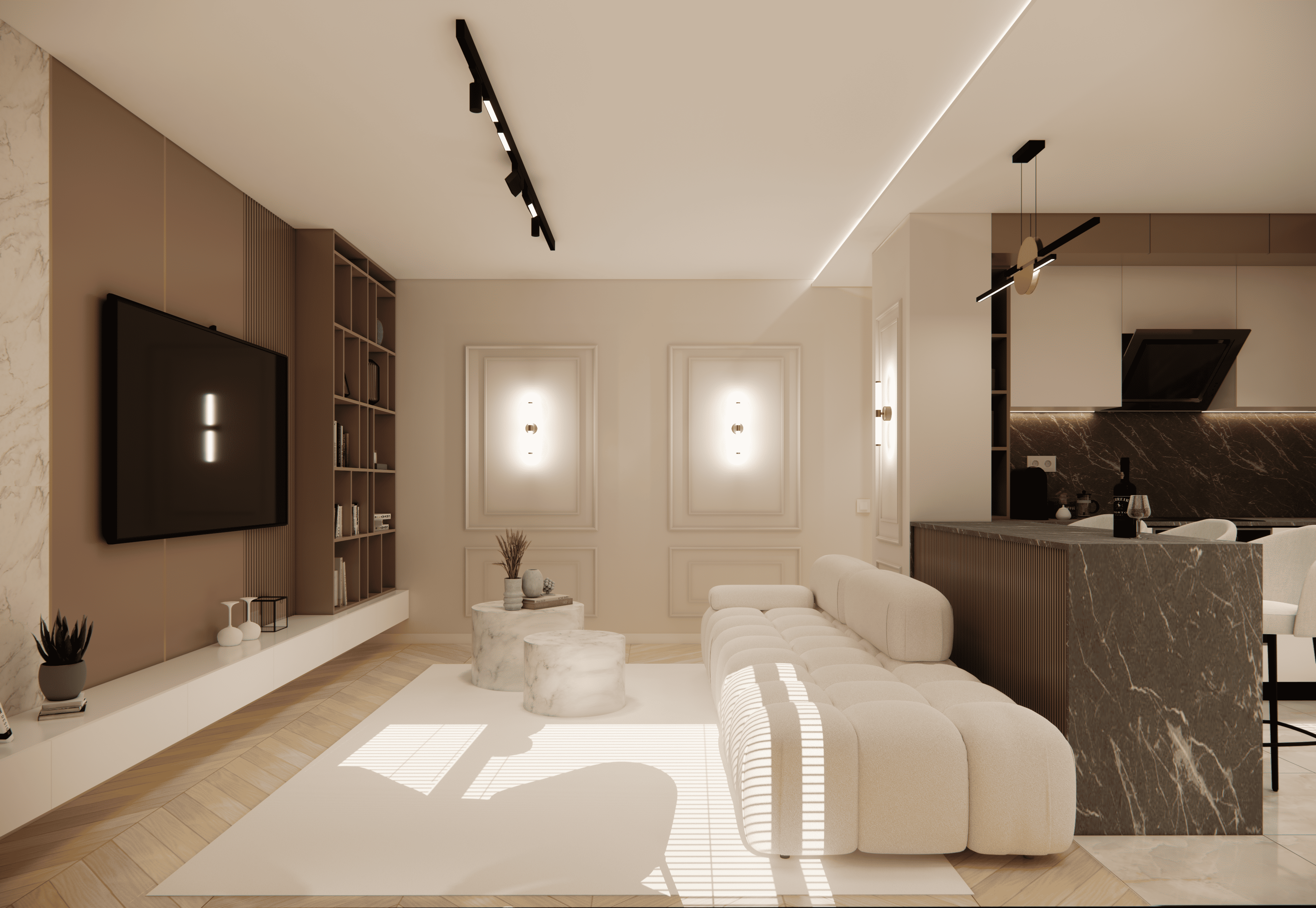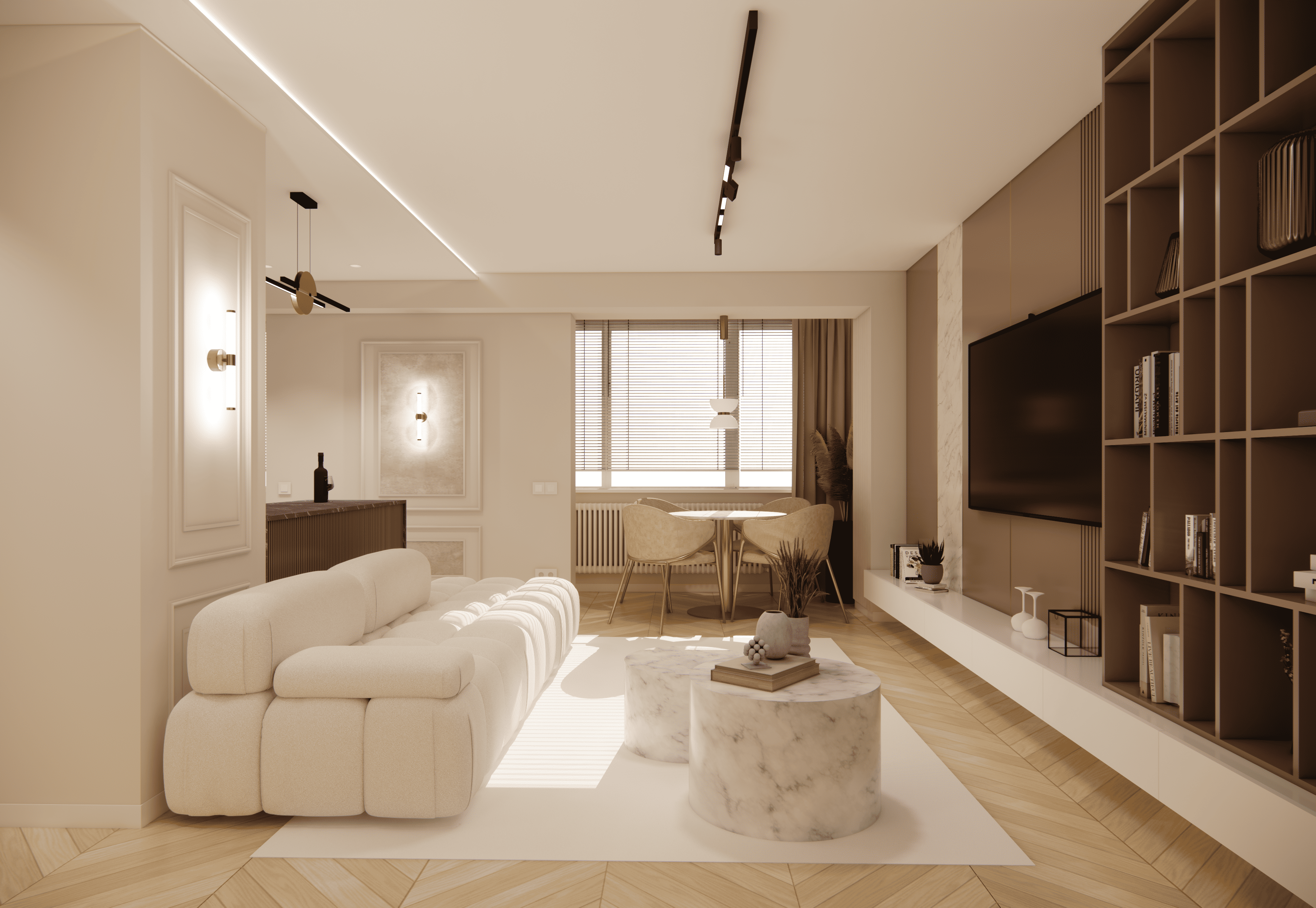 Spațiul este amenajat în stil modern-luxos cu accente minimaliste, combinând linii curate, volumetrii simple, și materiale premium precum marmura, catifeaua, metalul auriu și lemnul deschis. Atmosfera este una caldă, relaxată și echilibrată, cu o paletă cromatică bazată pe nuanțe neutre de bej, crem, maro-deschis și accente aurii.