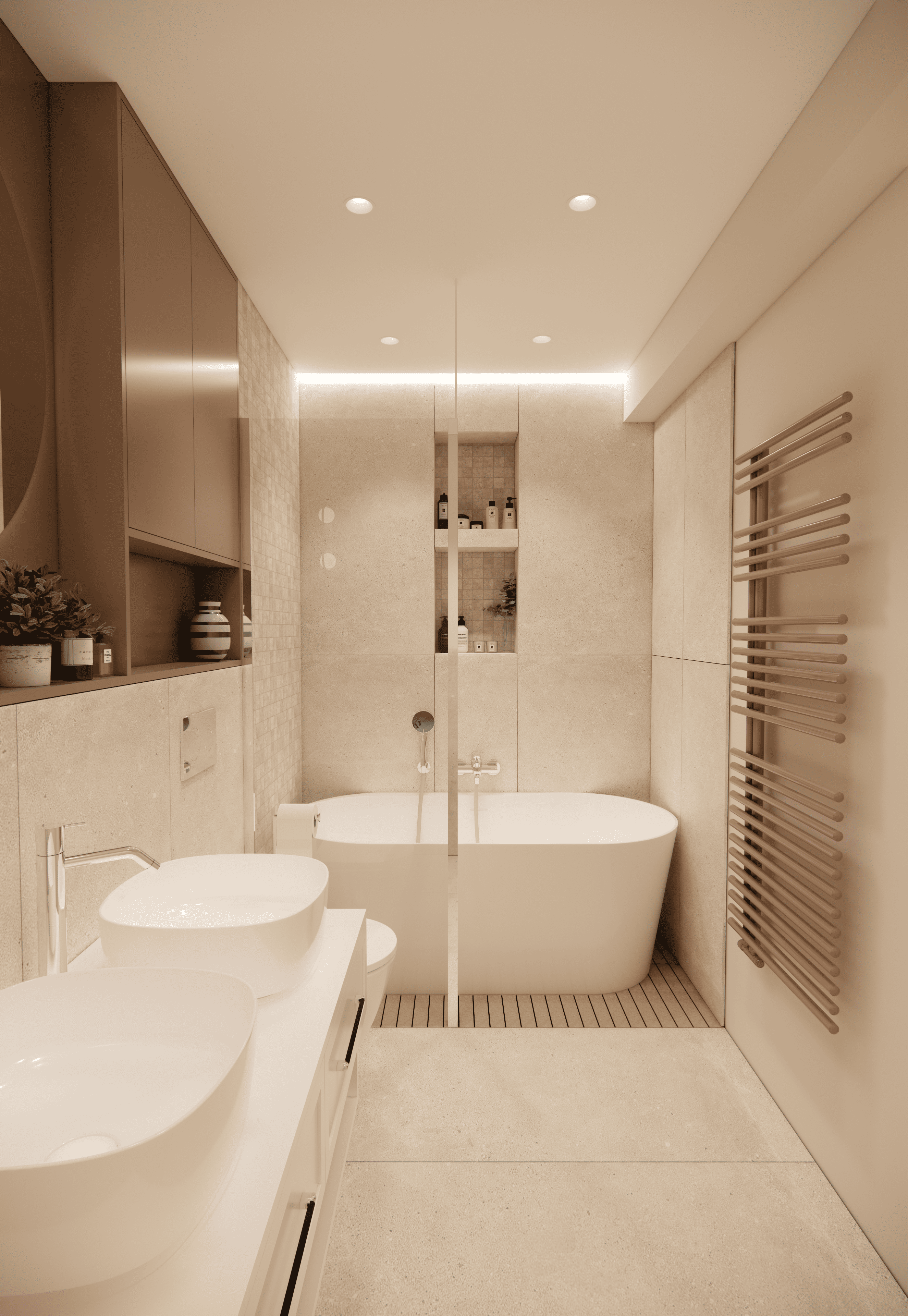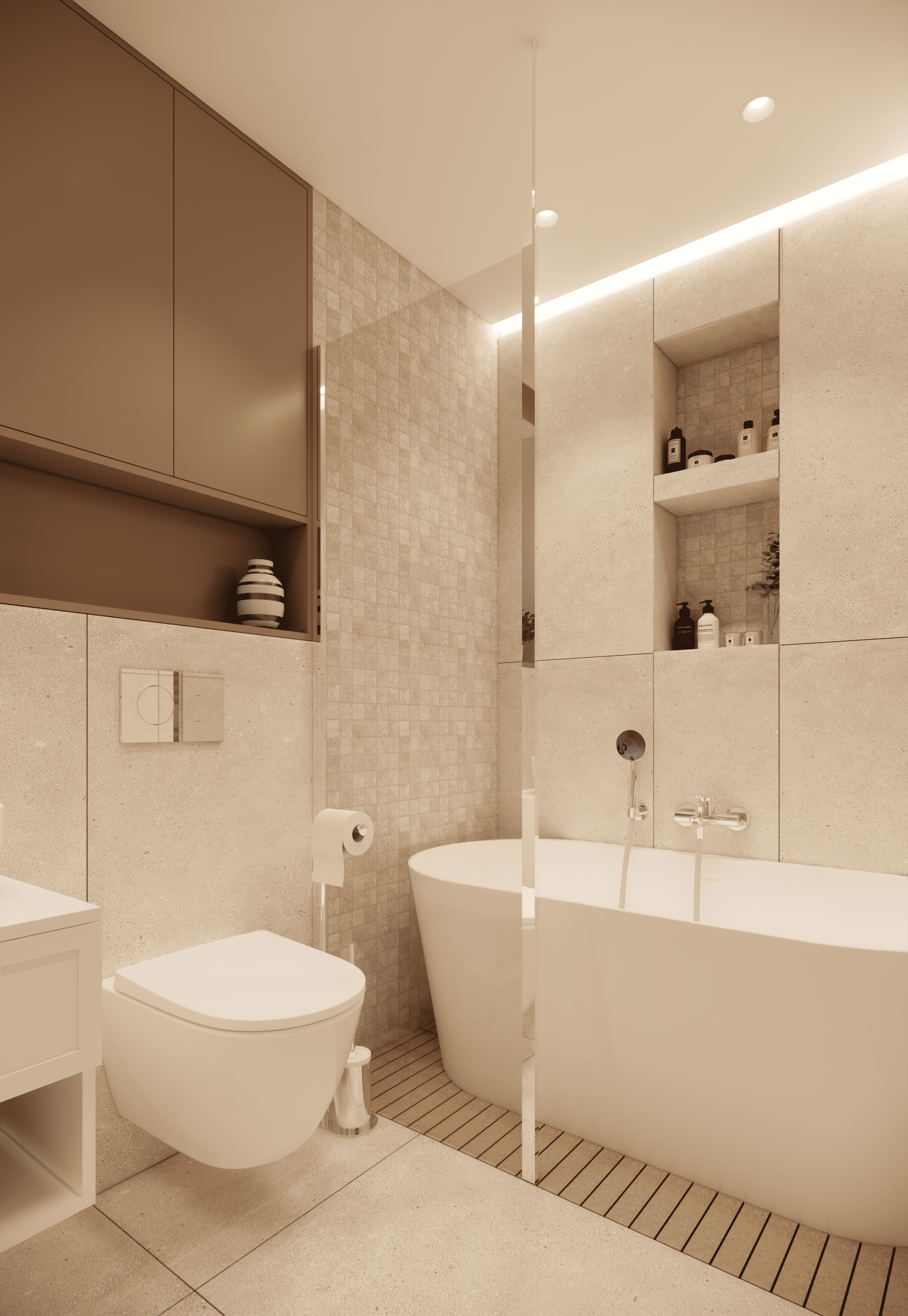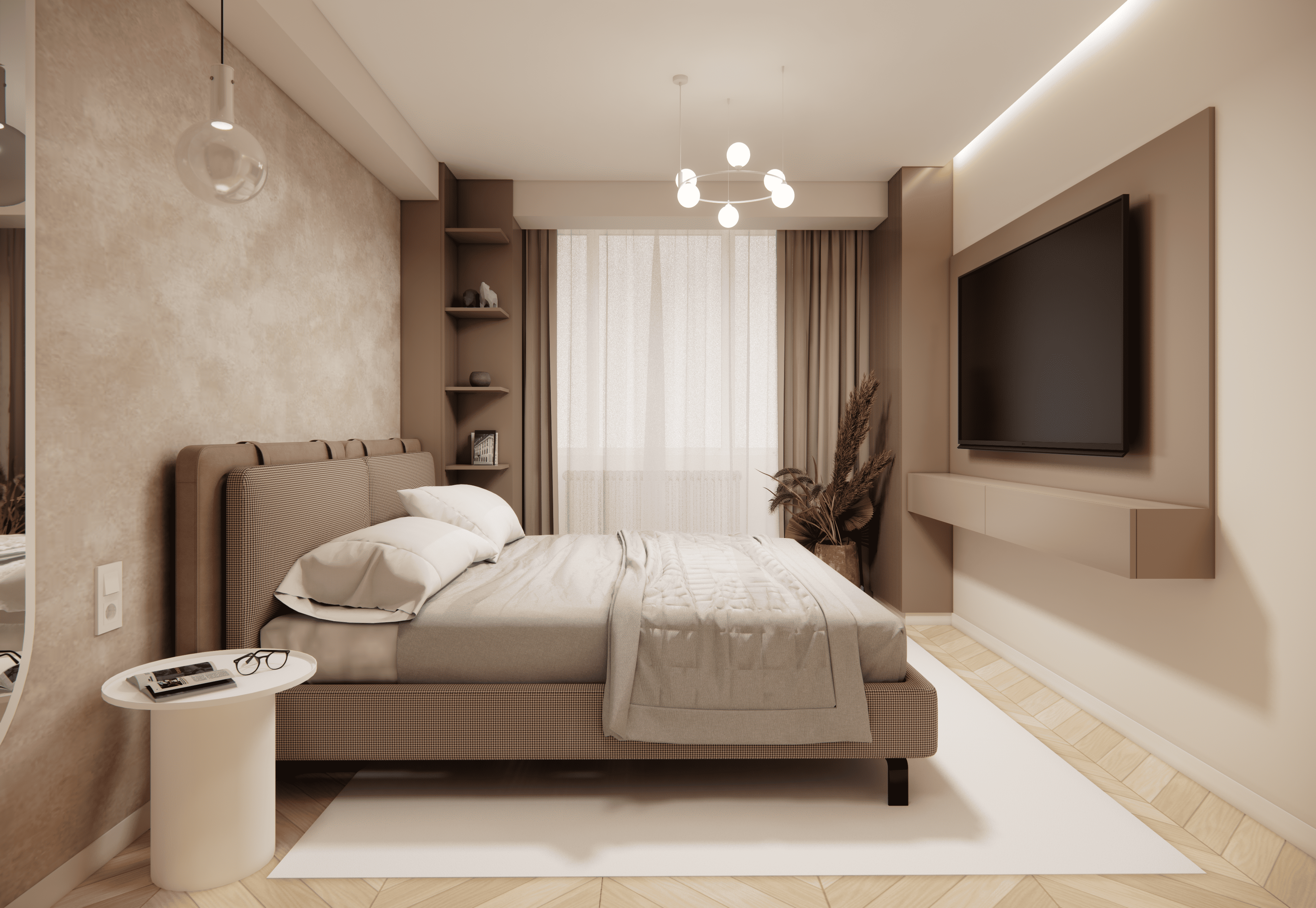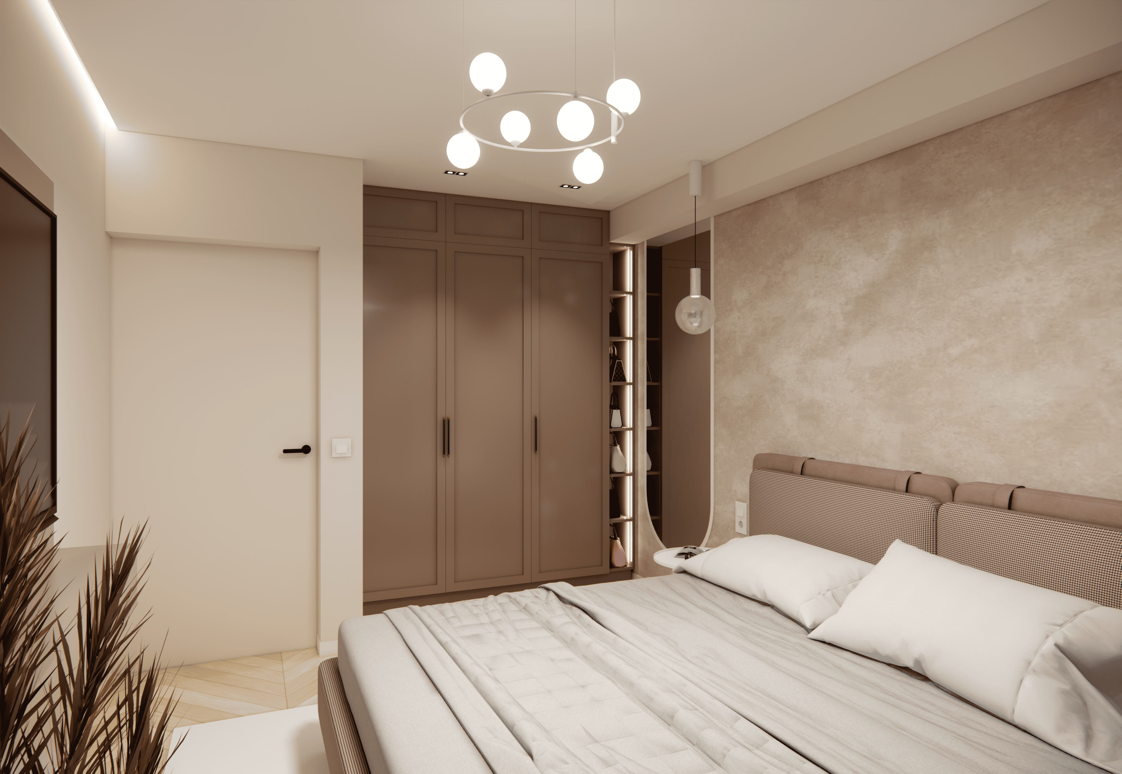 Spațiul este amenajat în stil modern-luxos cu accente minimaliste, combinând linii curate, volumetrii simple, și materiale premium precum marmura, catifeaua, metalul auriu și lemnul deschis. Atmosfera este una caldă, relaxată și echilibrată, cu o paletă cromatică bazată pe nuanțe neutre de bej, crem, maro-deschis și accente aurii.