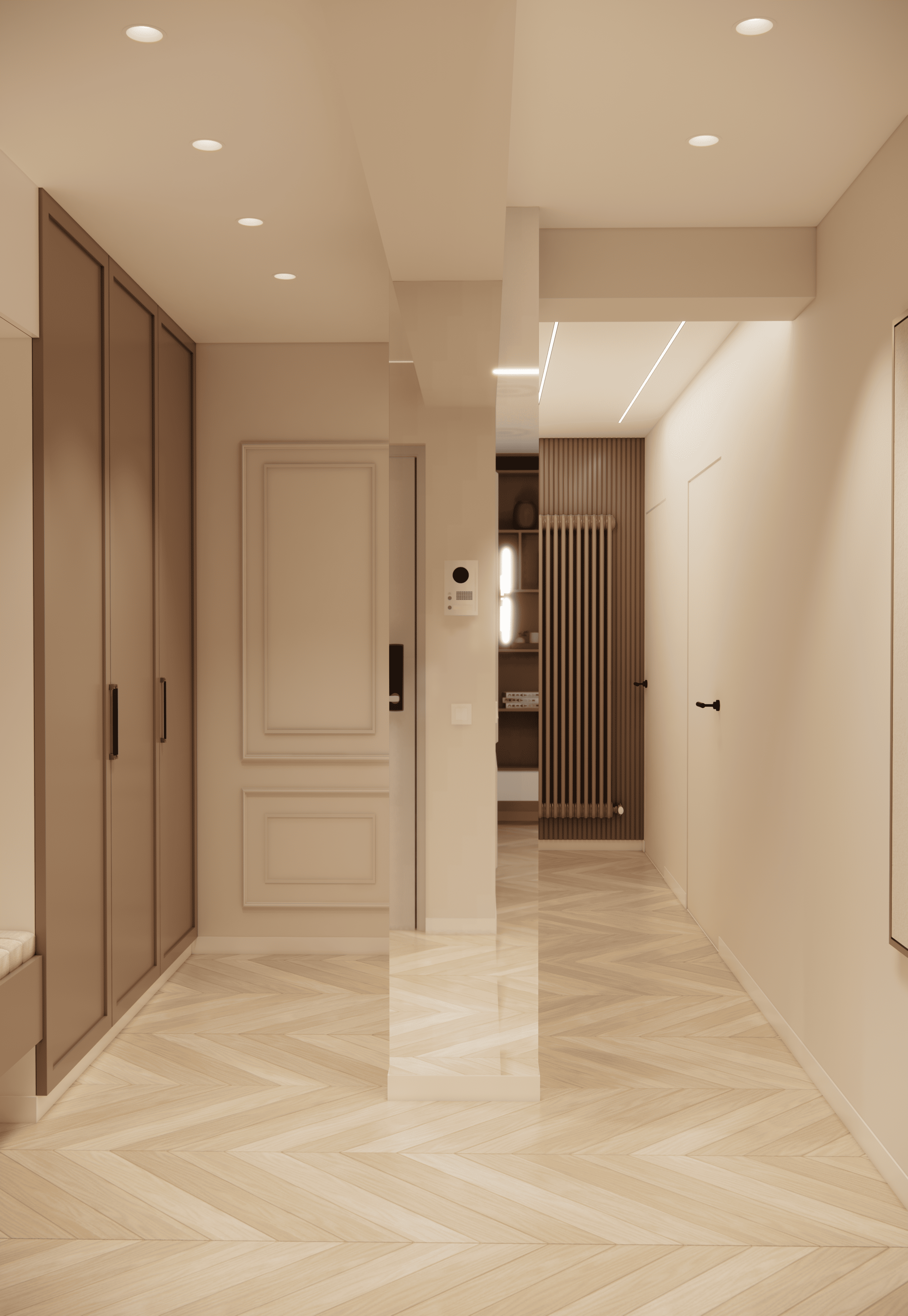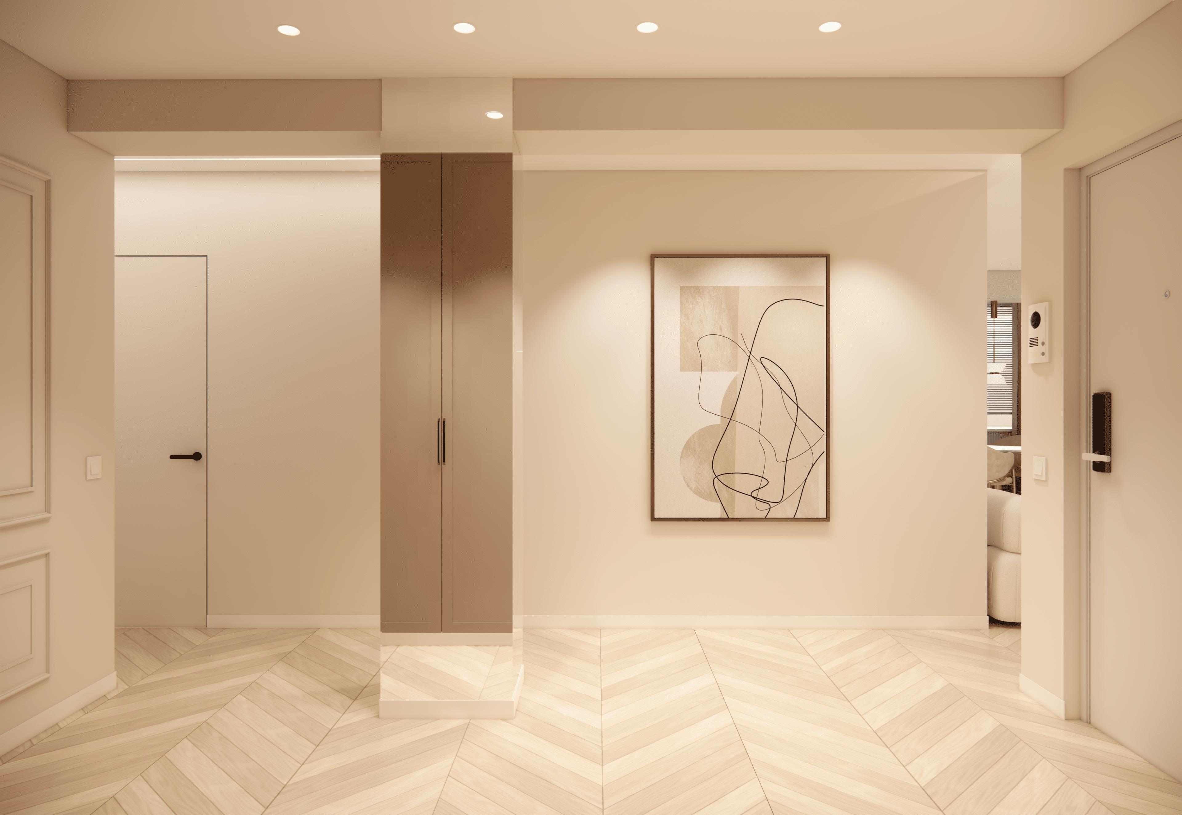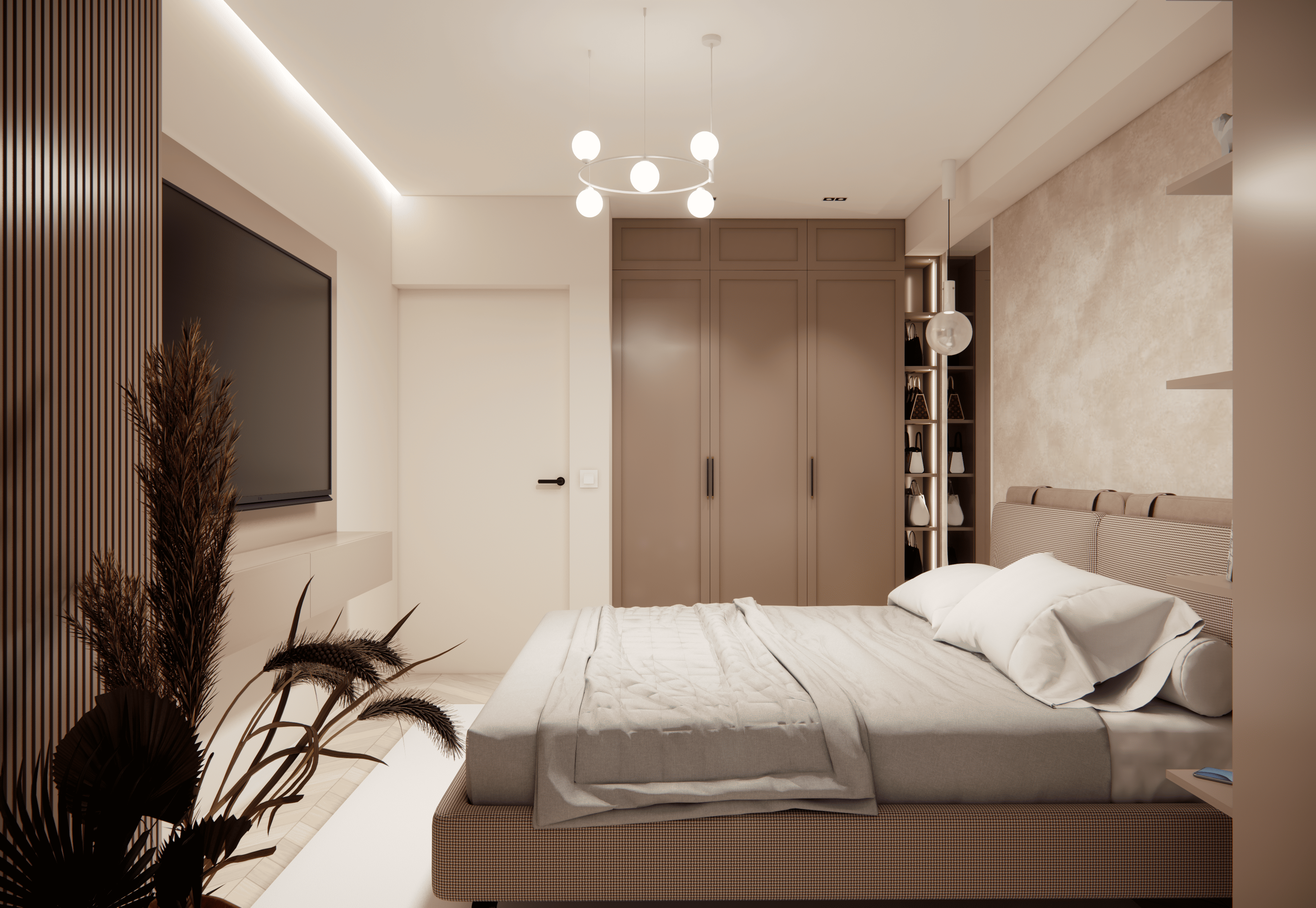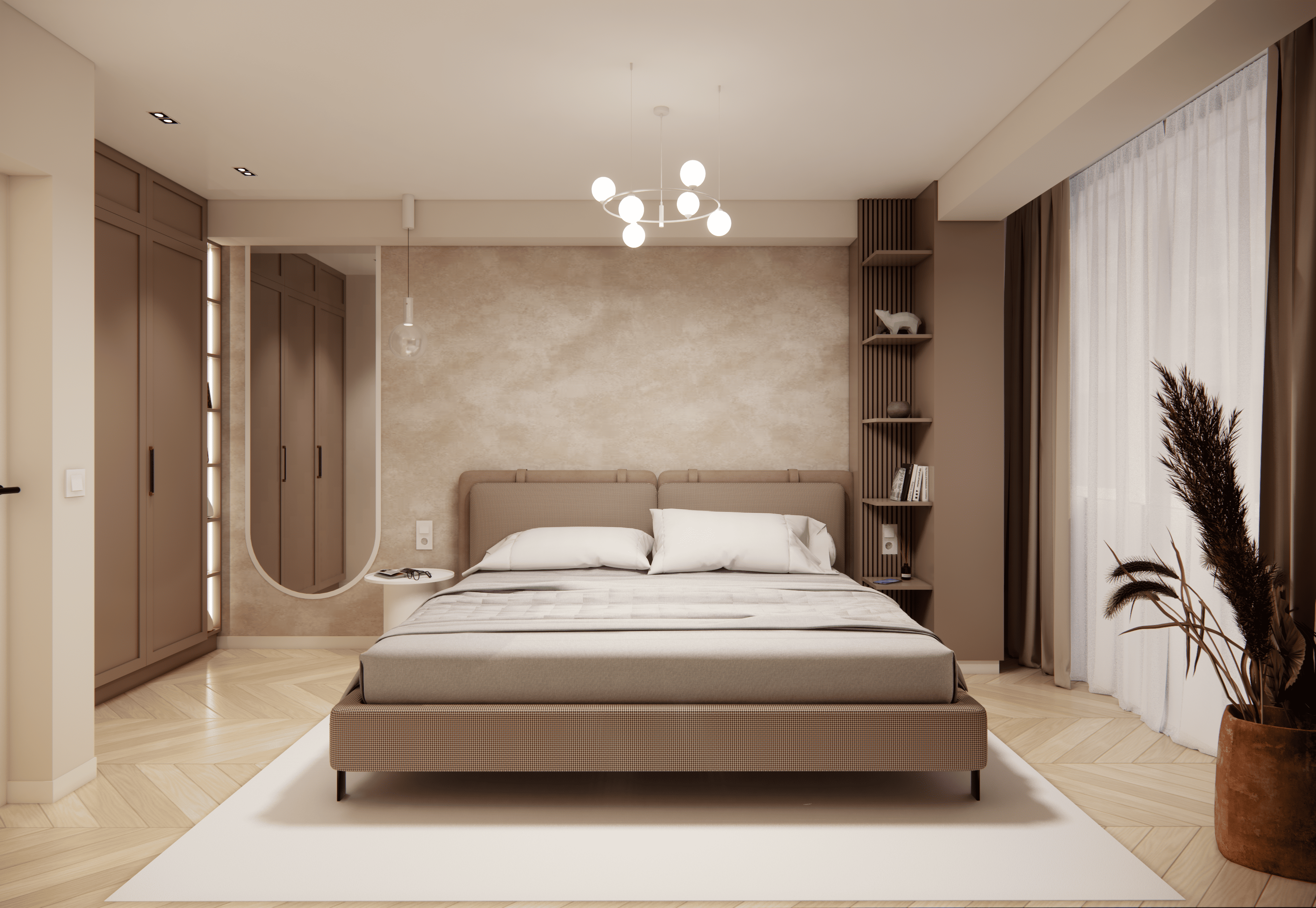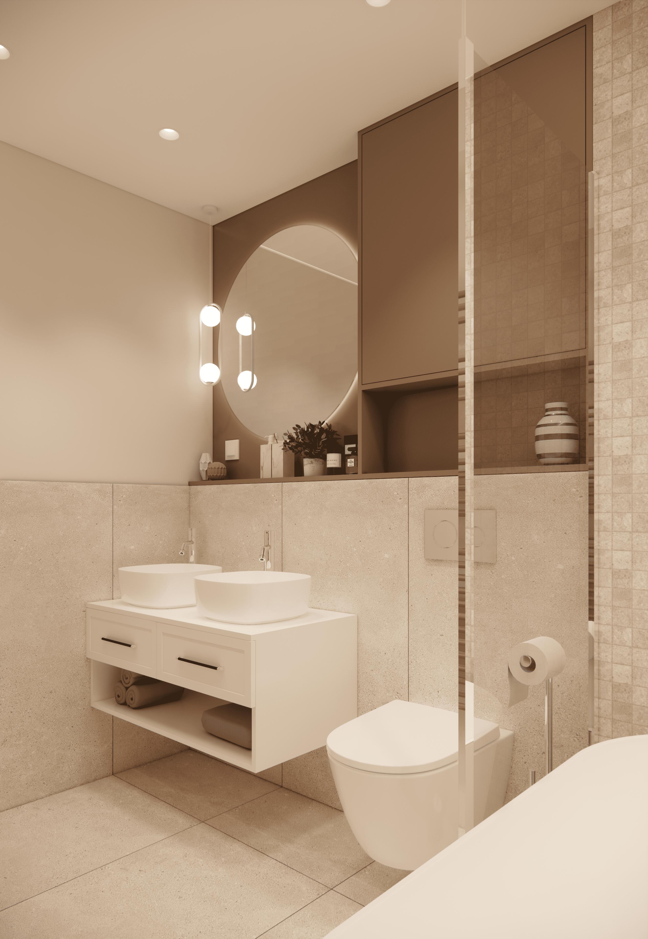 Spațiul este amenajat în stil modern-luxos cu accente minimaliste, combinând linii curate, volumetrii simple, și materiale premium precum marmura, catifeaua, metalul auriu și lemnul deschis. Atmosfera este una caldă, relaxată și echilibrată, cu o paletă cromatică bazată pe nuanțe neutre de bej, crem, maro-deschis și accente aurii.