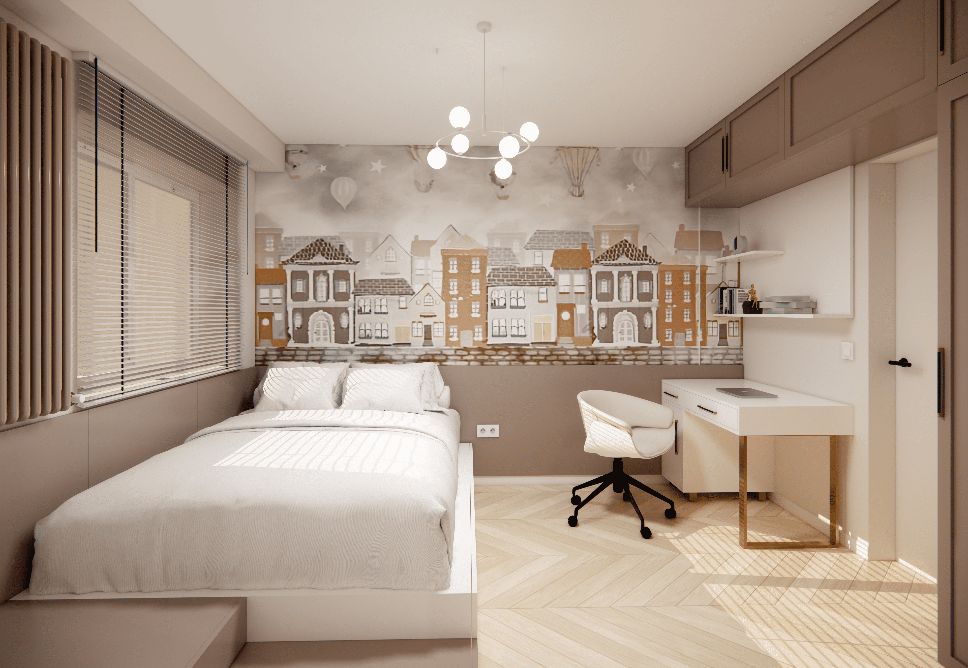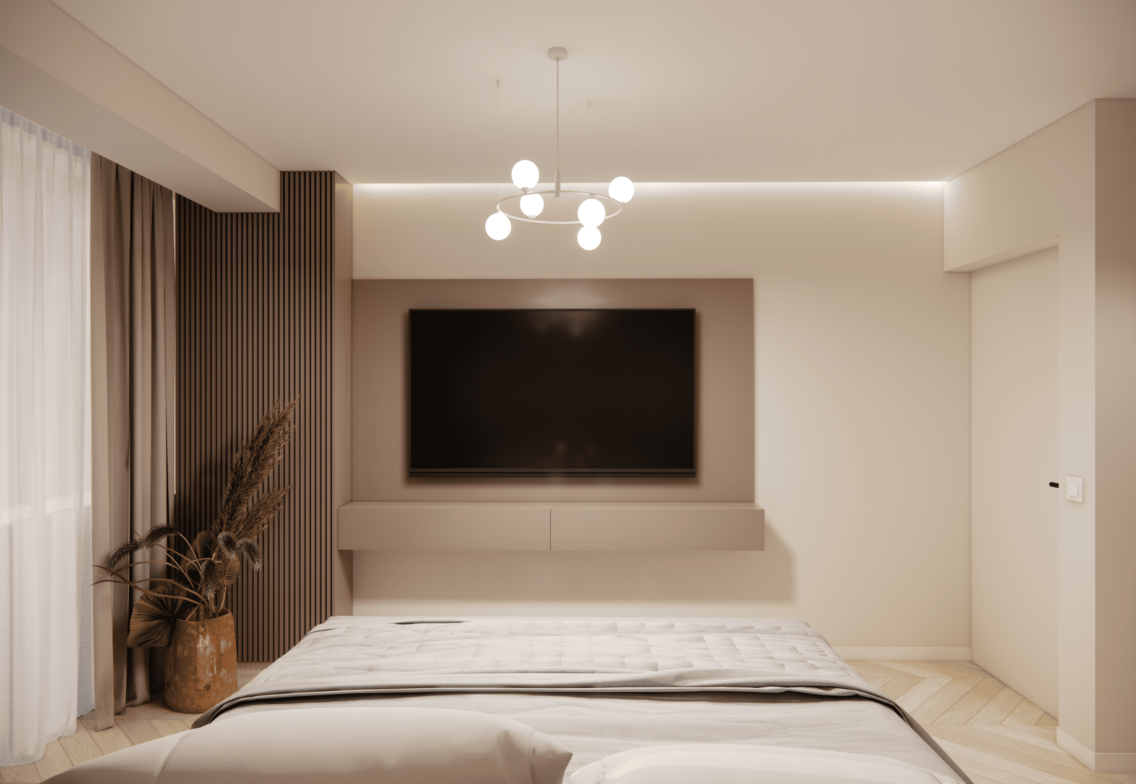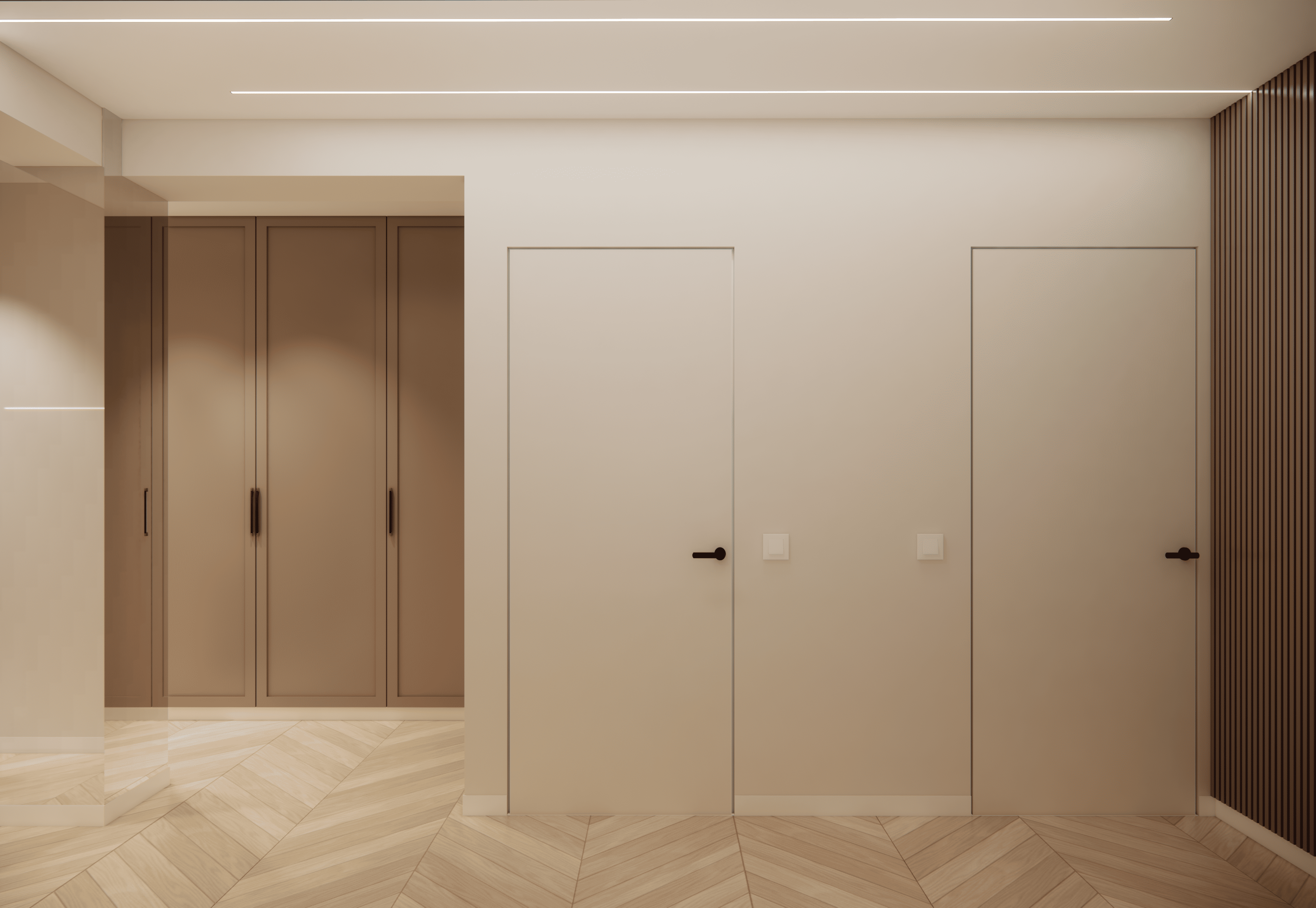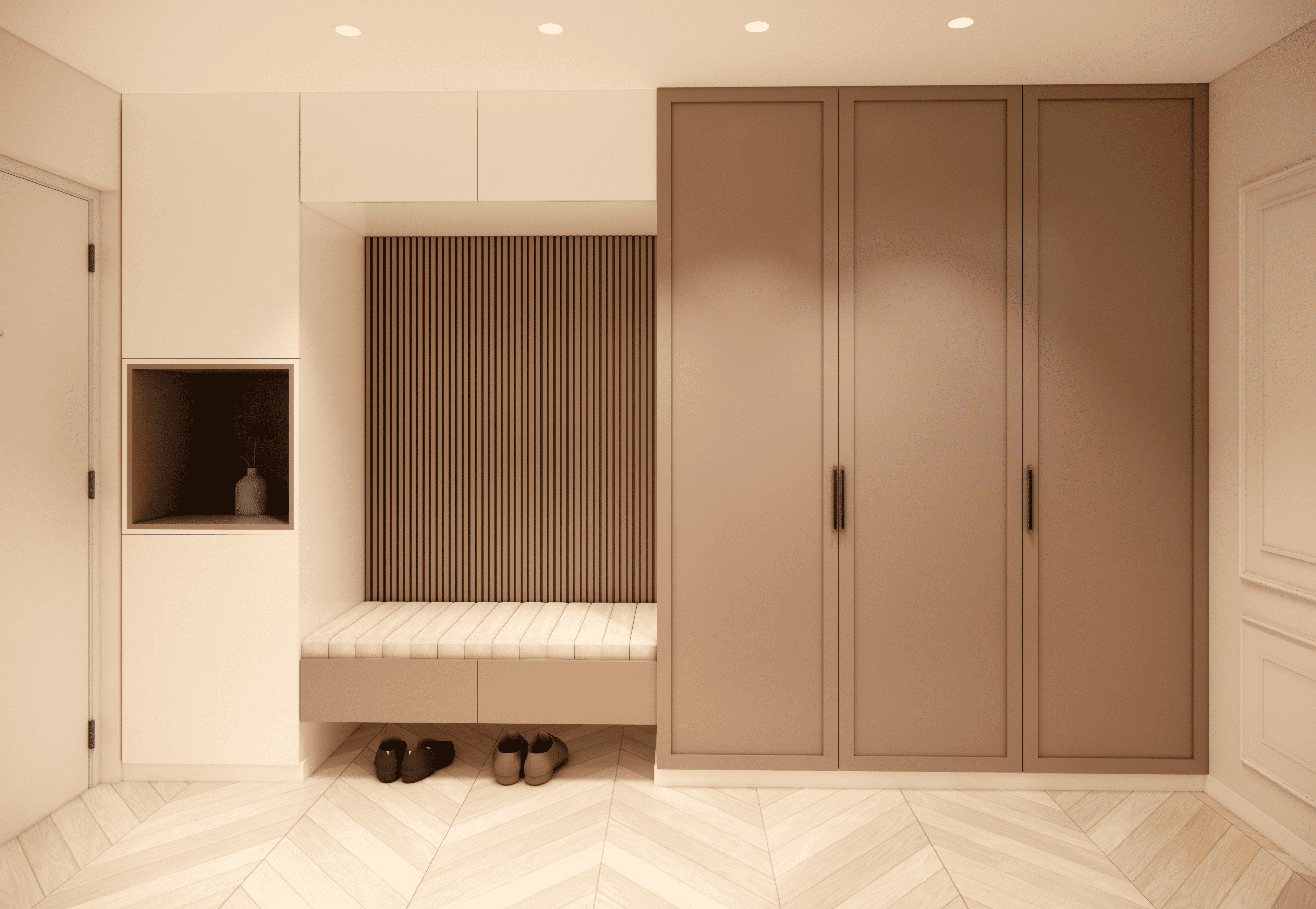 Spațiul este amenajat în stil modern-luxos cu accente minimaliste, combinând linii curate, volumetrii simple, și materiale premium precum marmura, catifeaua, metalul auriu și lemnul deschis. Atmosfera este una caldă, relaxată și echilibrată, cu o paletă cromatică bazată pe nuanțe neutre de bej, crem, maro-deschis și accente aurii.