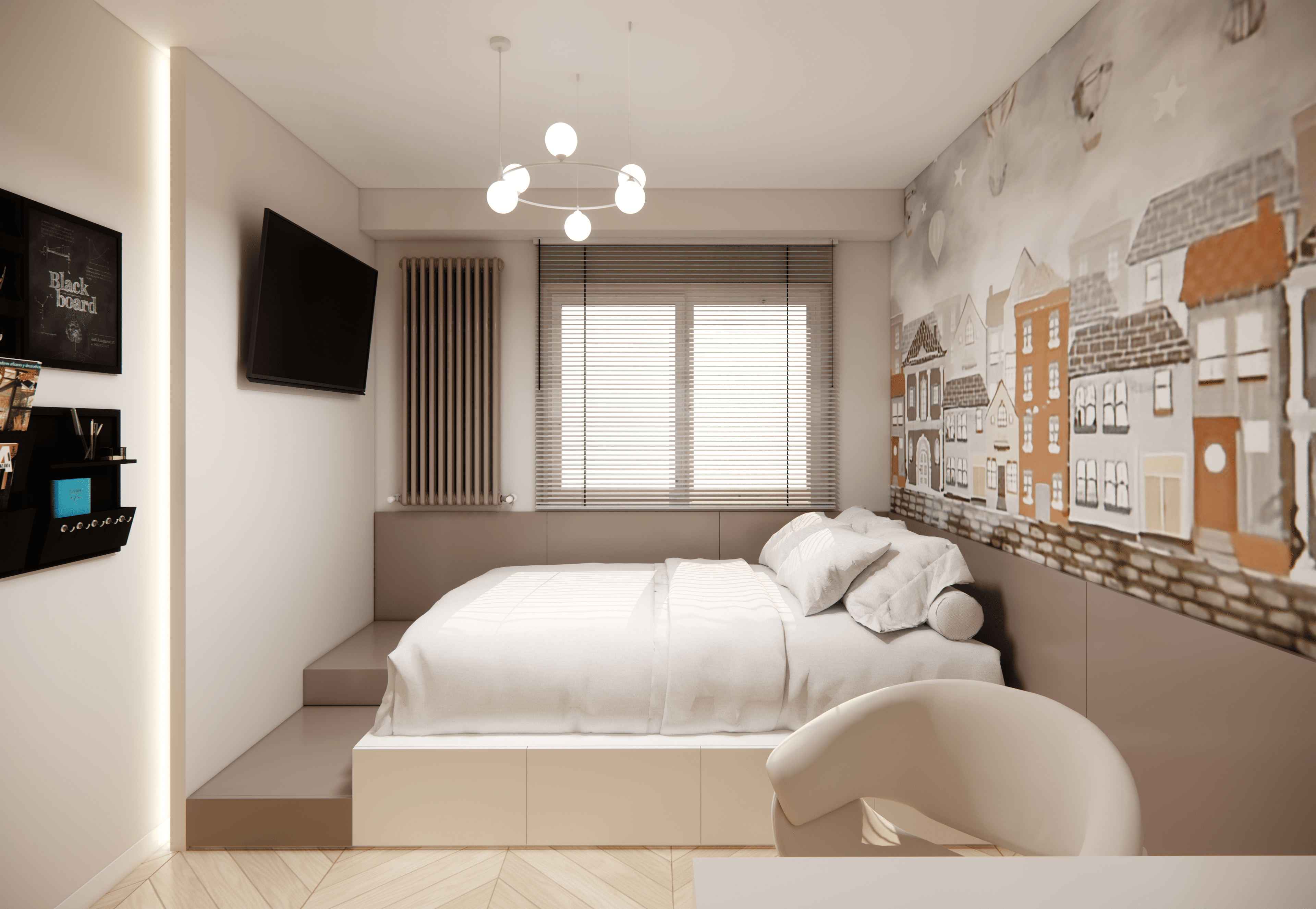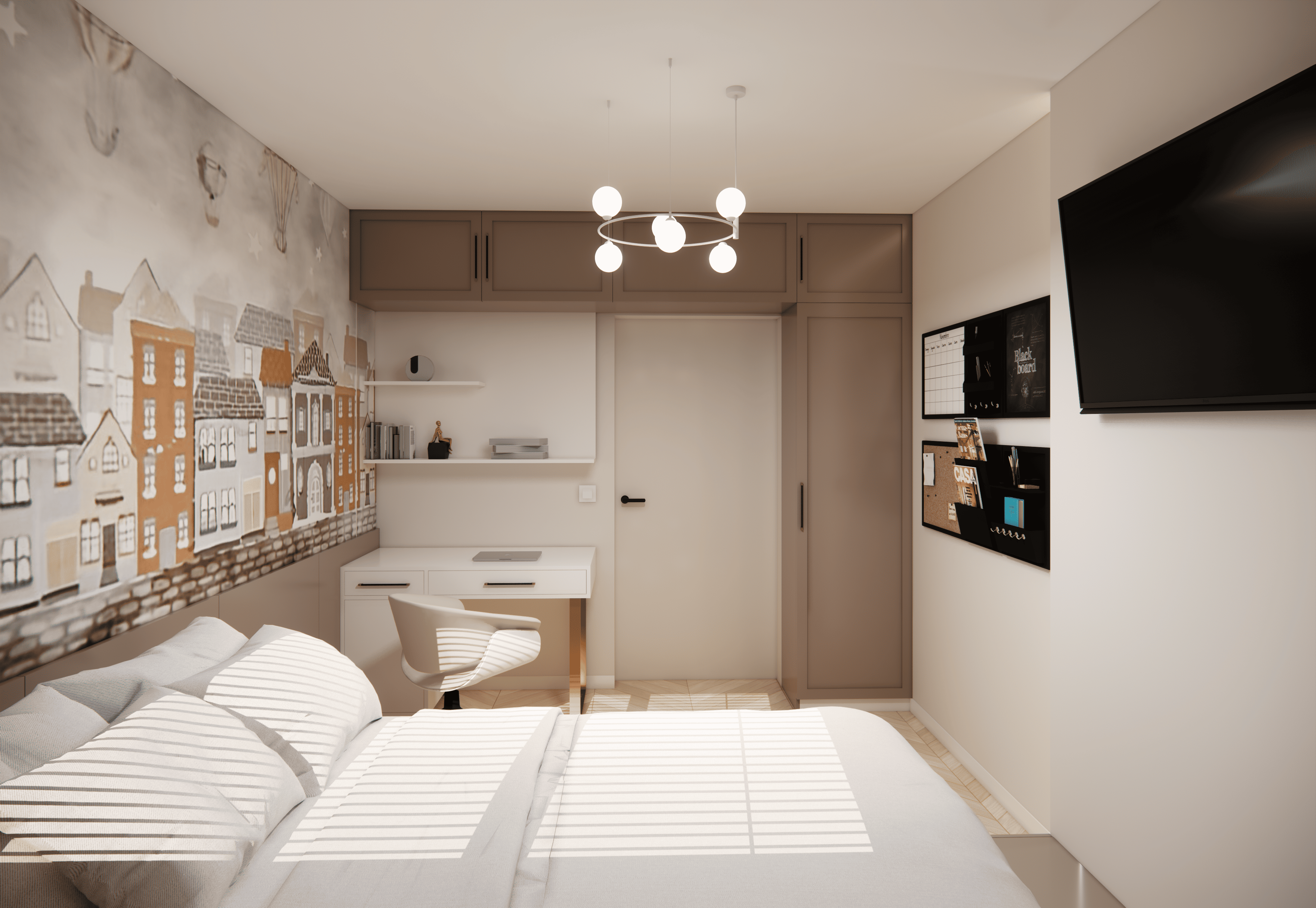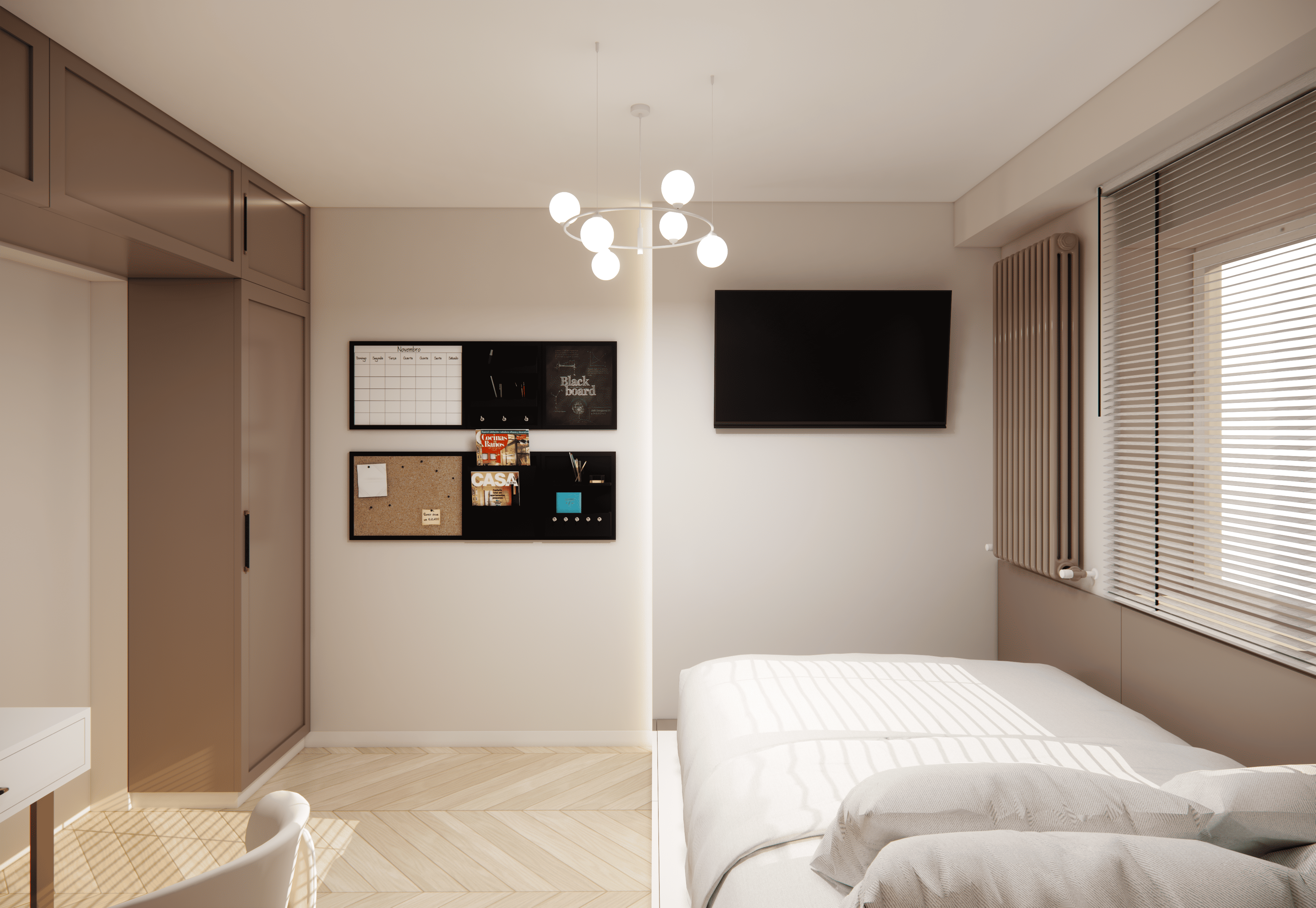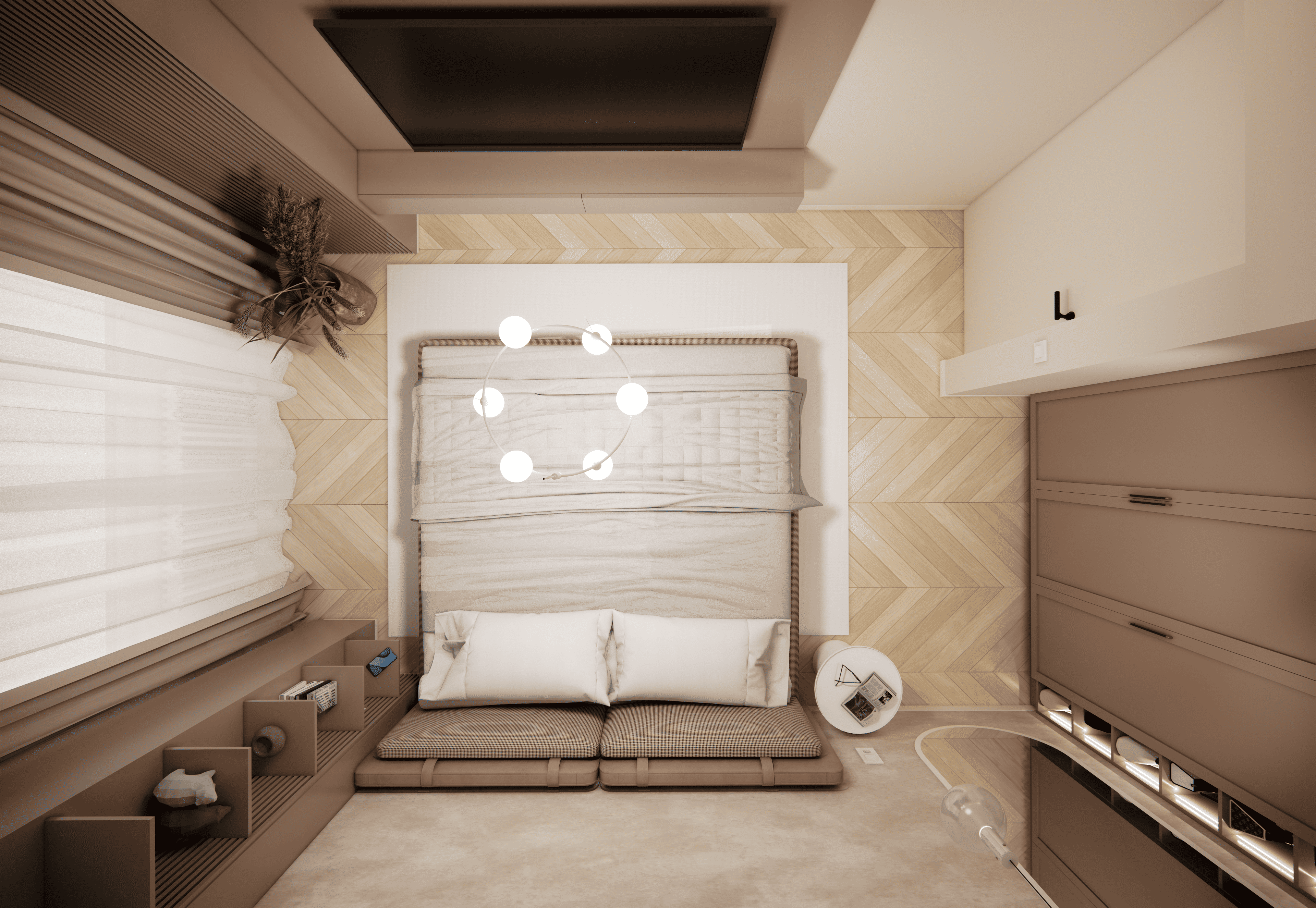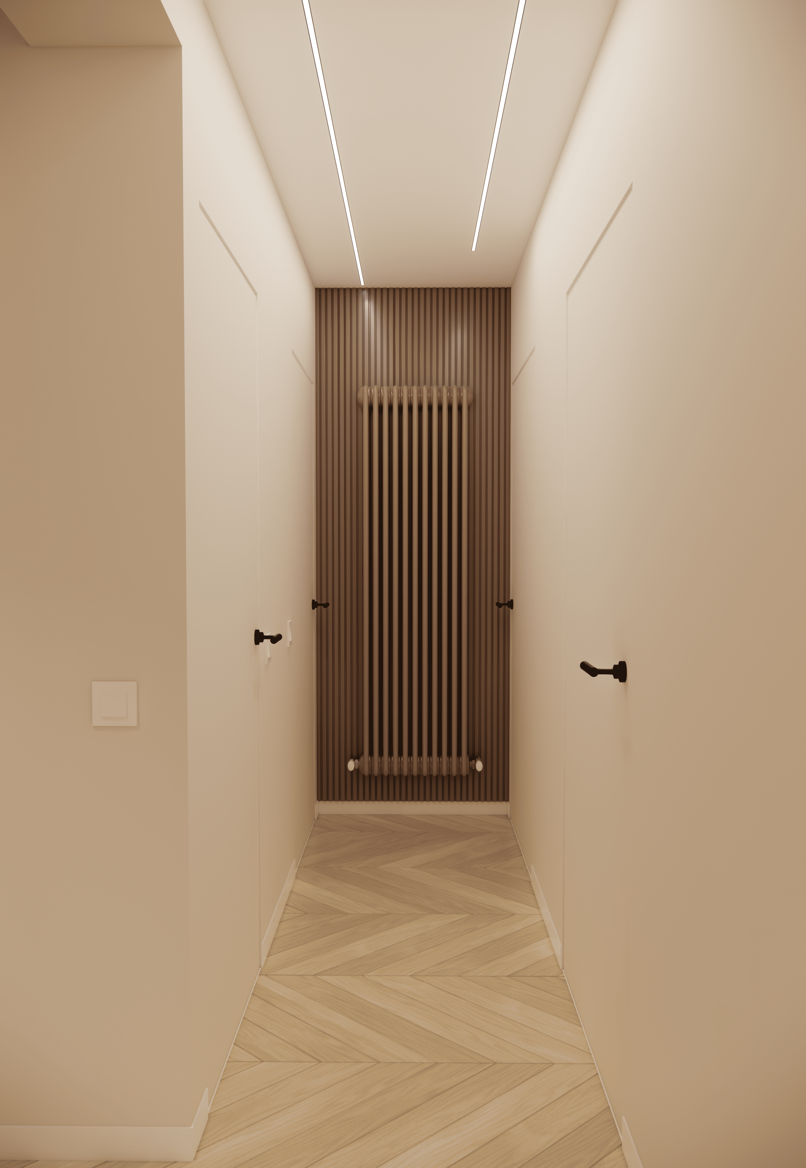 Spațiul este amenajat în stil modern-luxos cu accente minimaliste, combinând linii curate, volumetrii simple, și materiale premium precum marmura, catifeaua, metalul auriu și lemnul deschis. Atmosfera este una caldă, relaxată și echilibrată, cu o paletă cromatică bazată pe nuanțe neutre de bej, crem, maro-deschis și accente aurii.