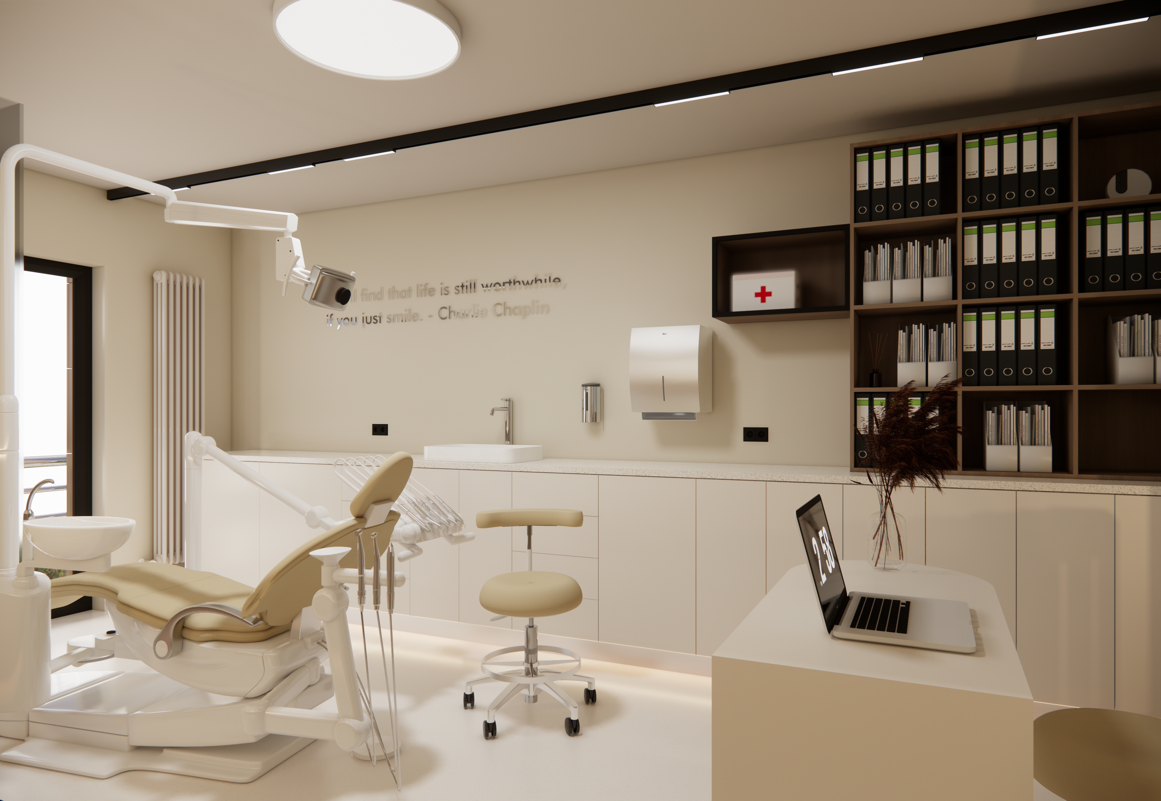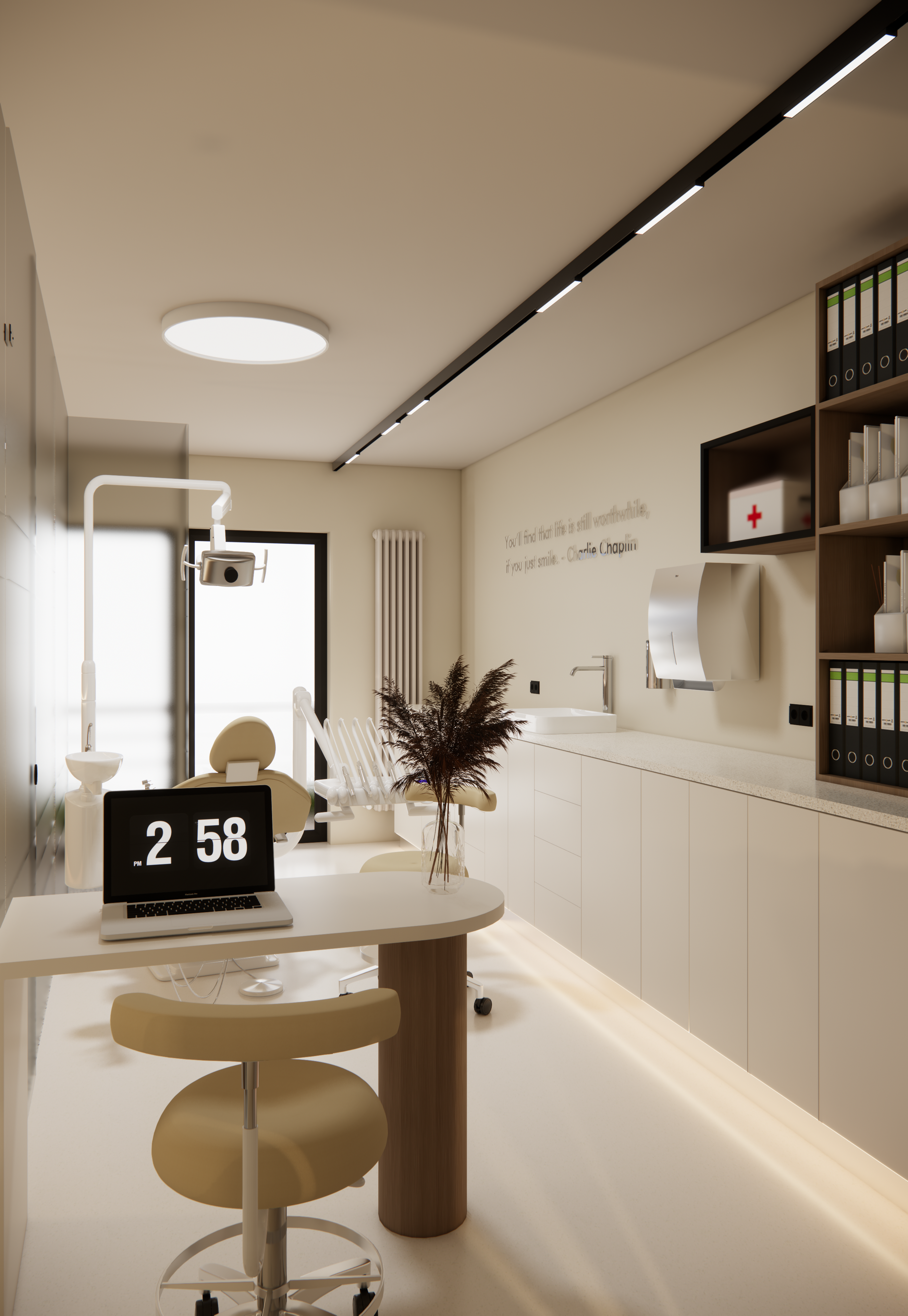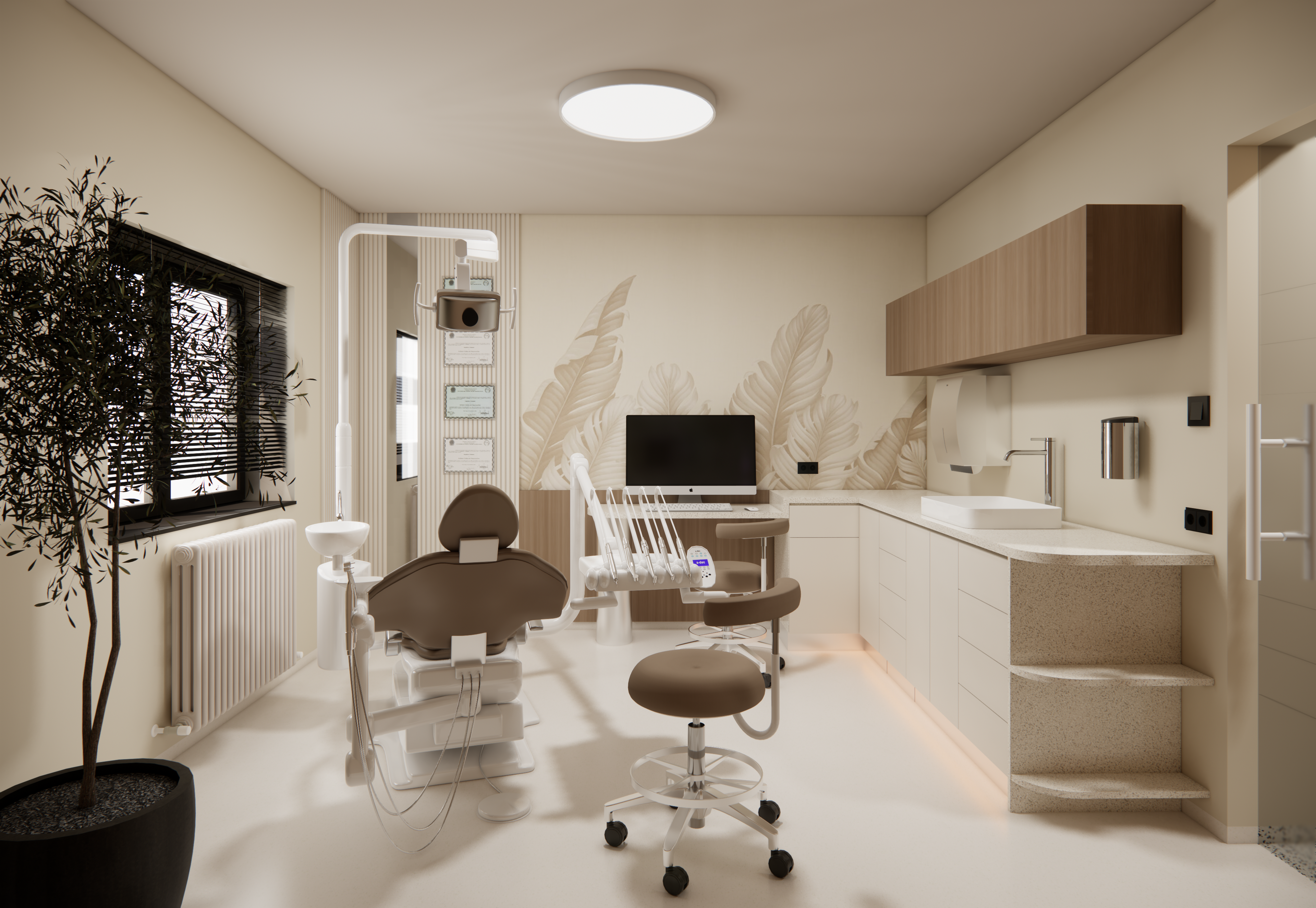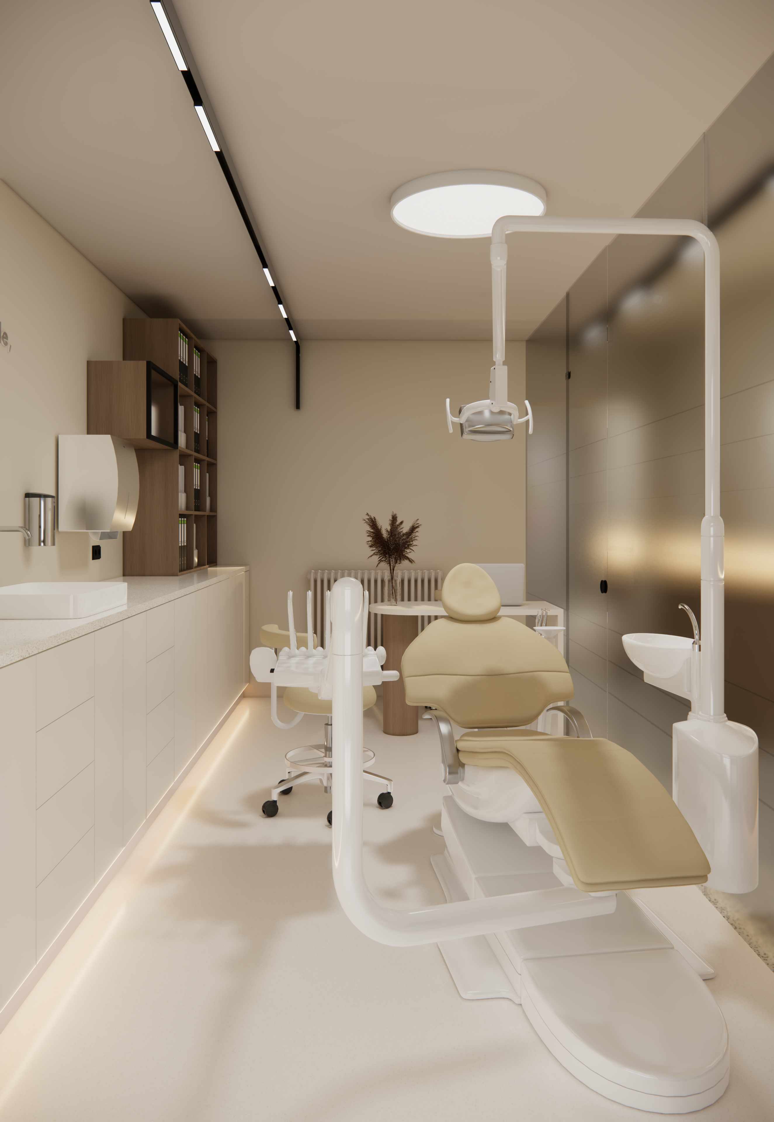 Texturile fine și nuanțele naturale conturează un cadru armonios, unde eleganța discretă se îmbină cu funcționalitatea. Lumina atent dozată evidențiază fiecare detaliu, transformând spațiul într-un loc primitor și relaxant, ideal pentru o experiență stomatologică lipsită de stres.