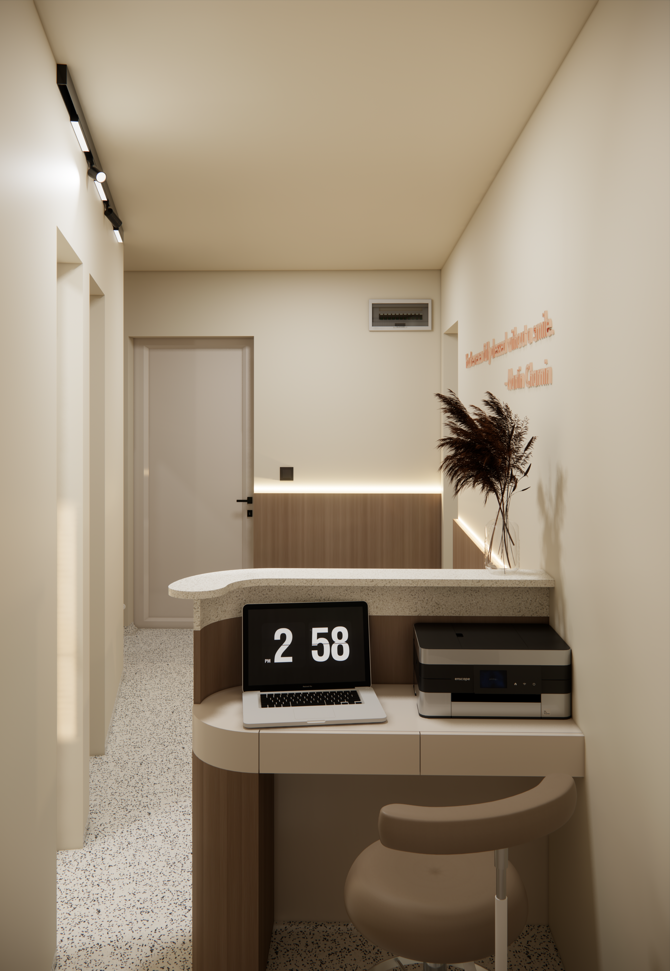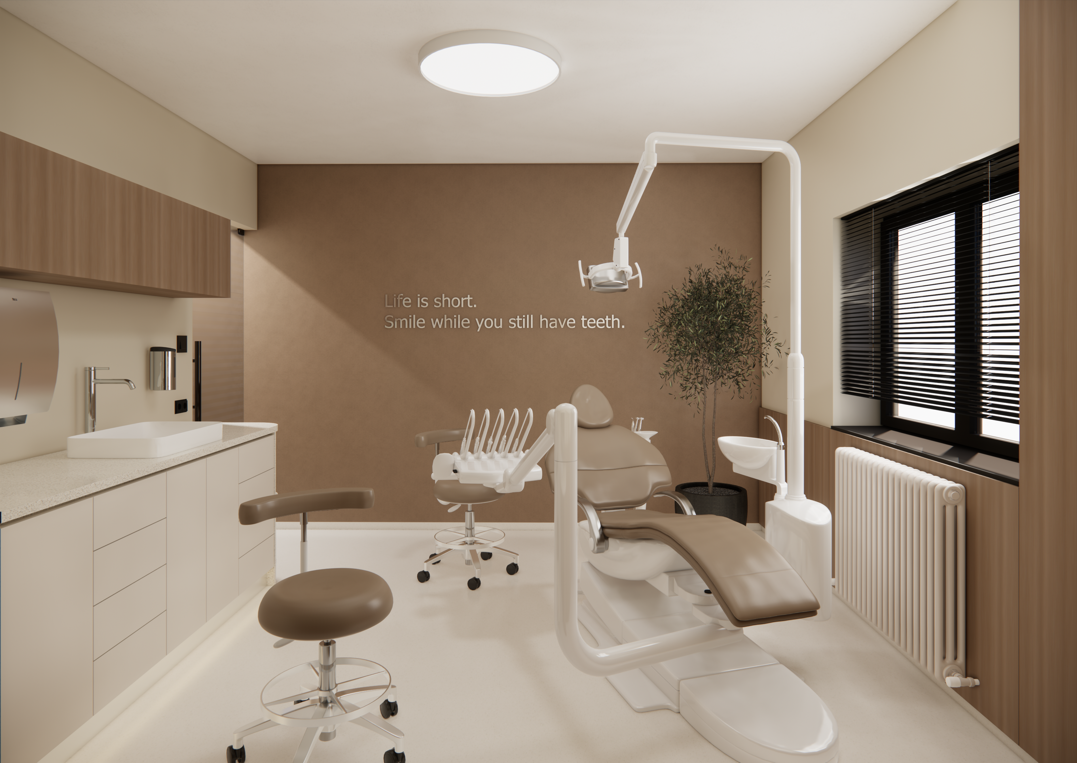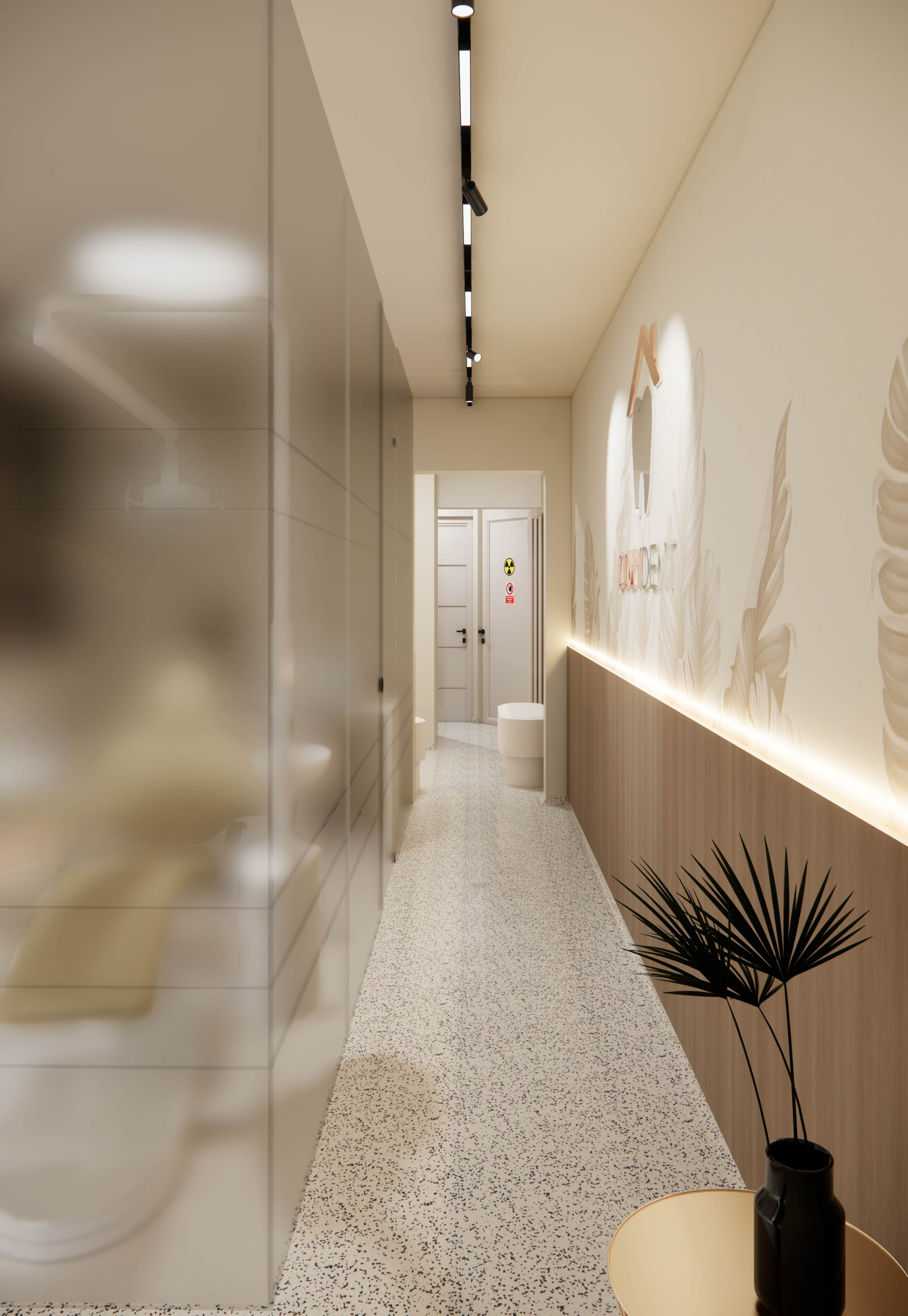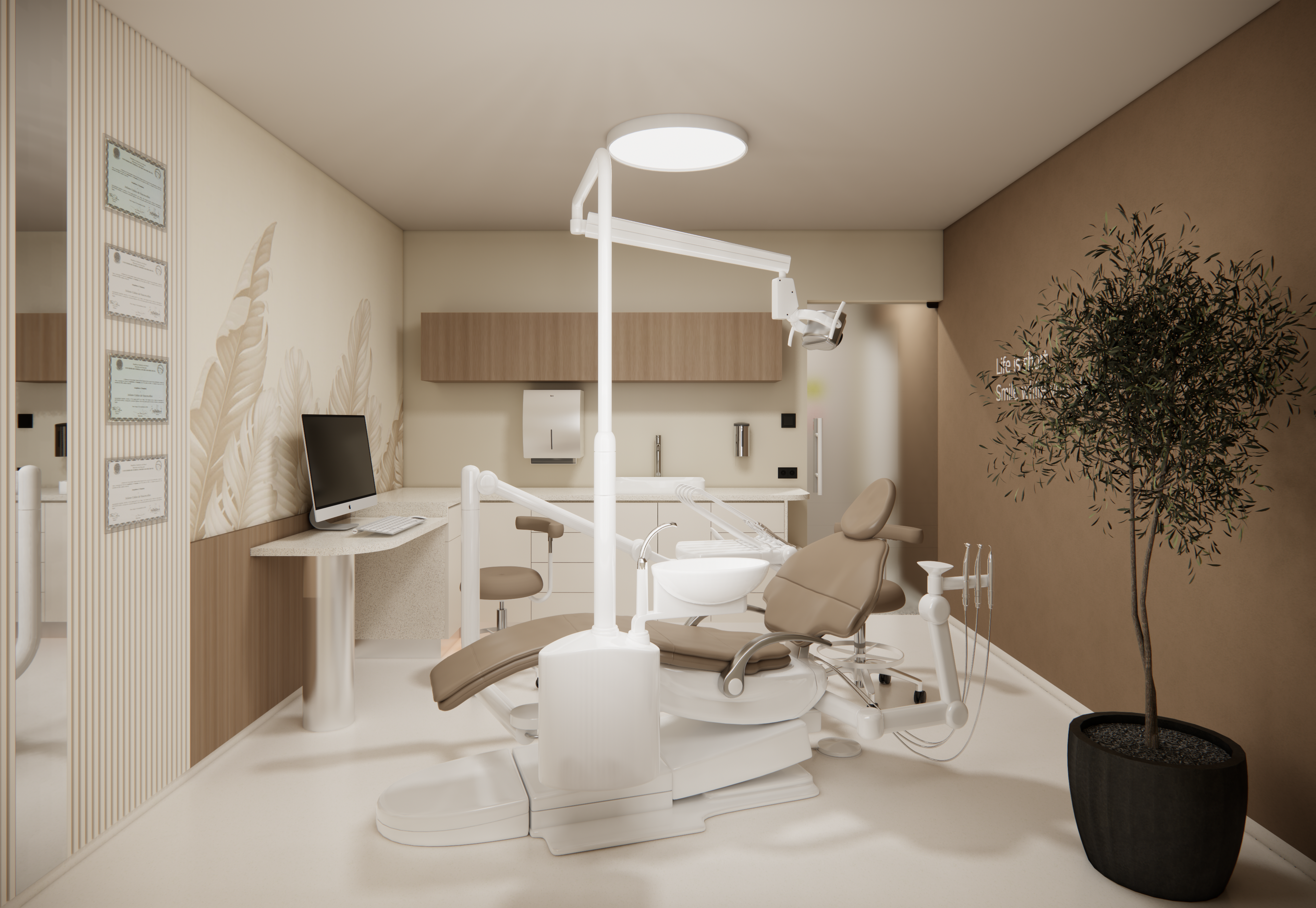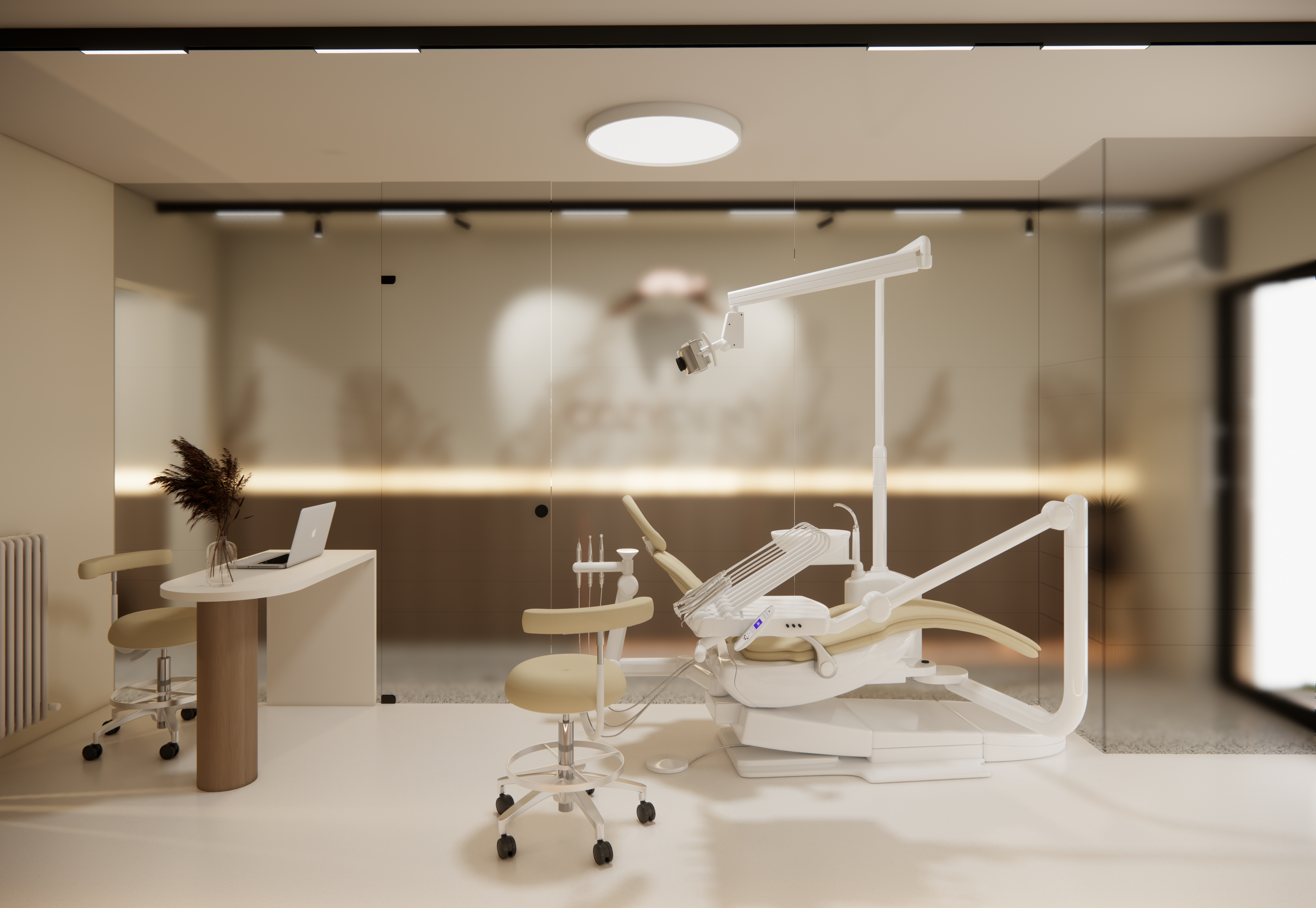 Texturile fine și nuanțele naturale conturează un cadru armonios, unde eleganța discretă se îmbină cu funcționalitatea. Lumina atent dozată evidențiază fiecare detaliu, transformând spațiul într-un loc primitor și relaxant, ideal pentru o experiență stomatologică lipsită de stres.
