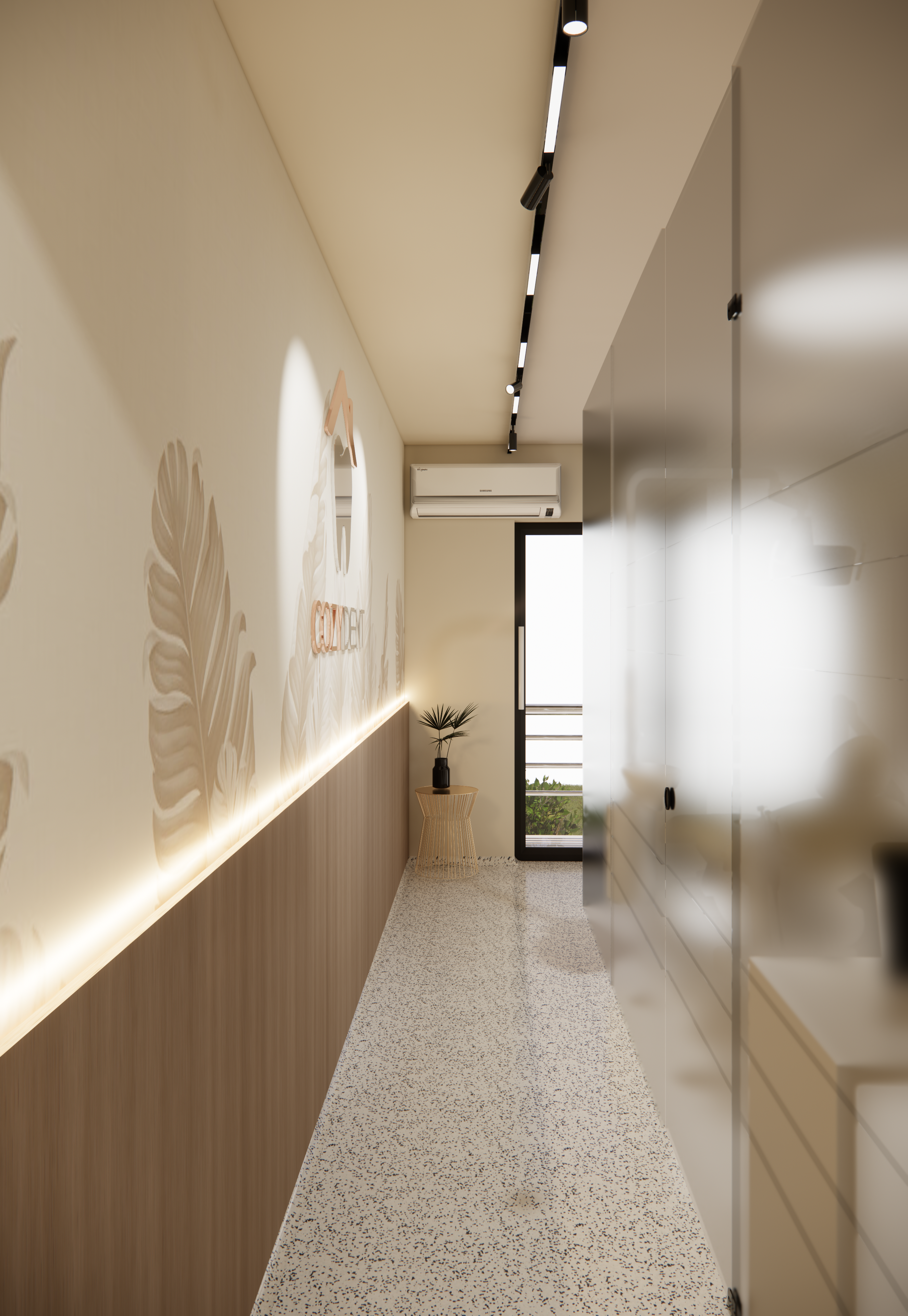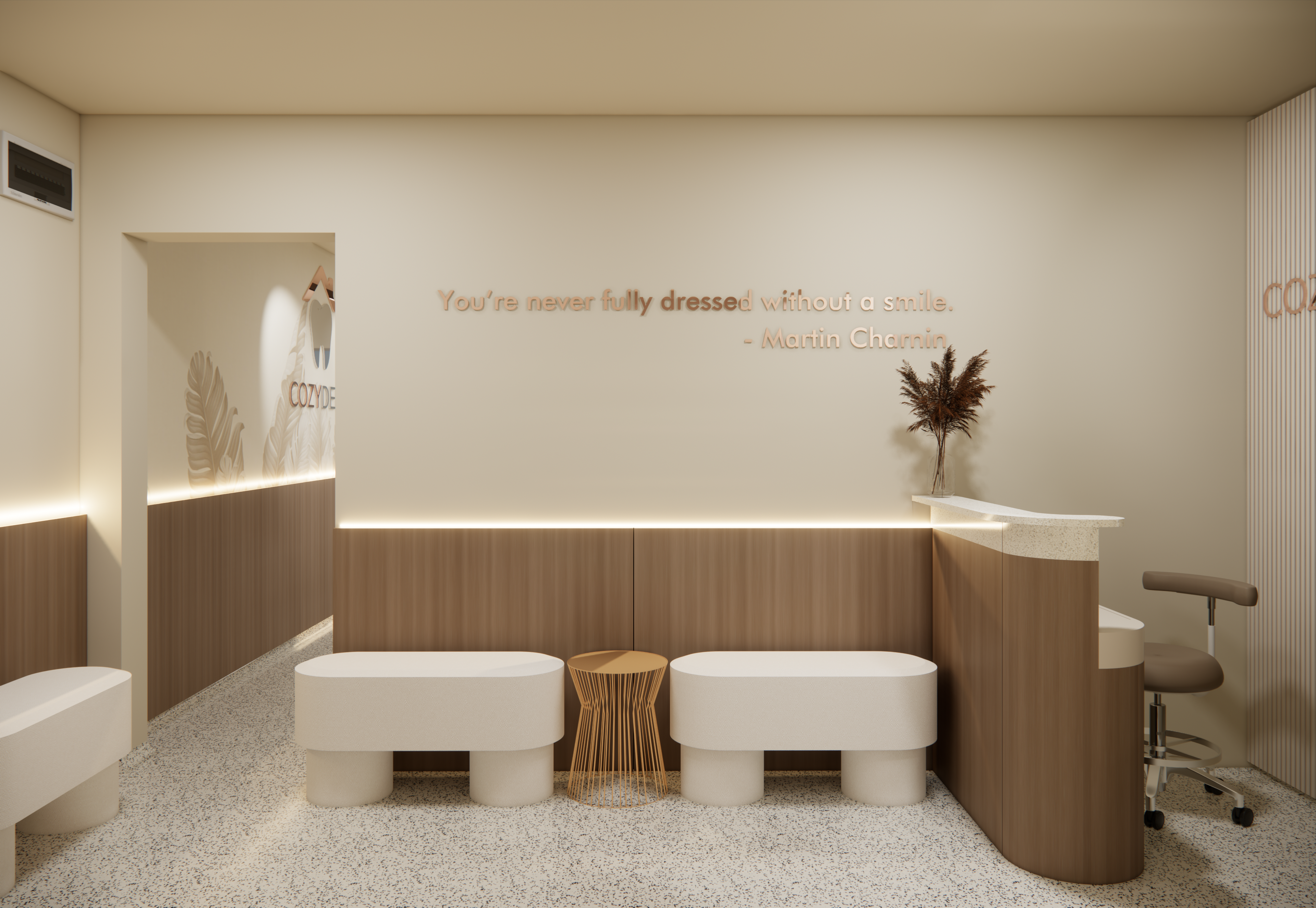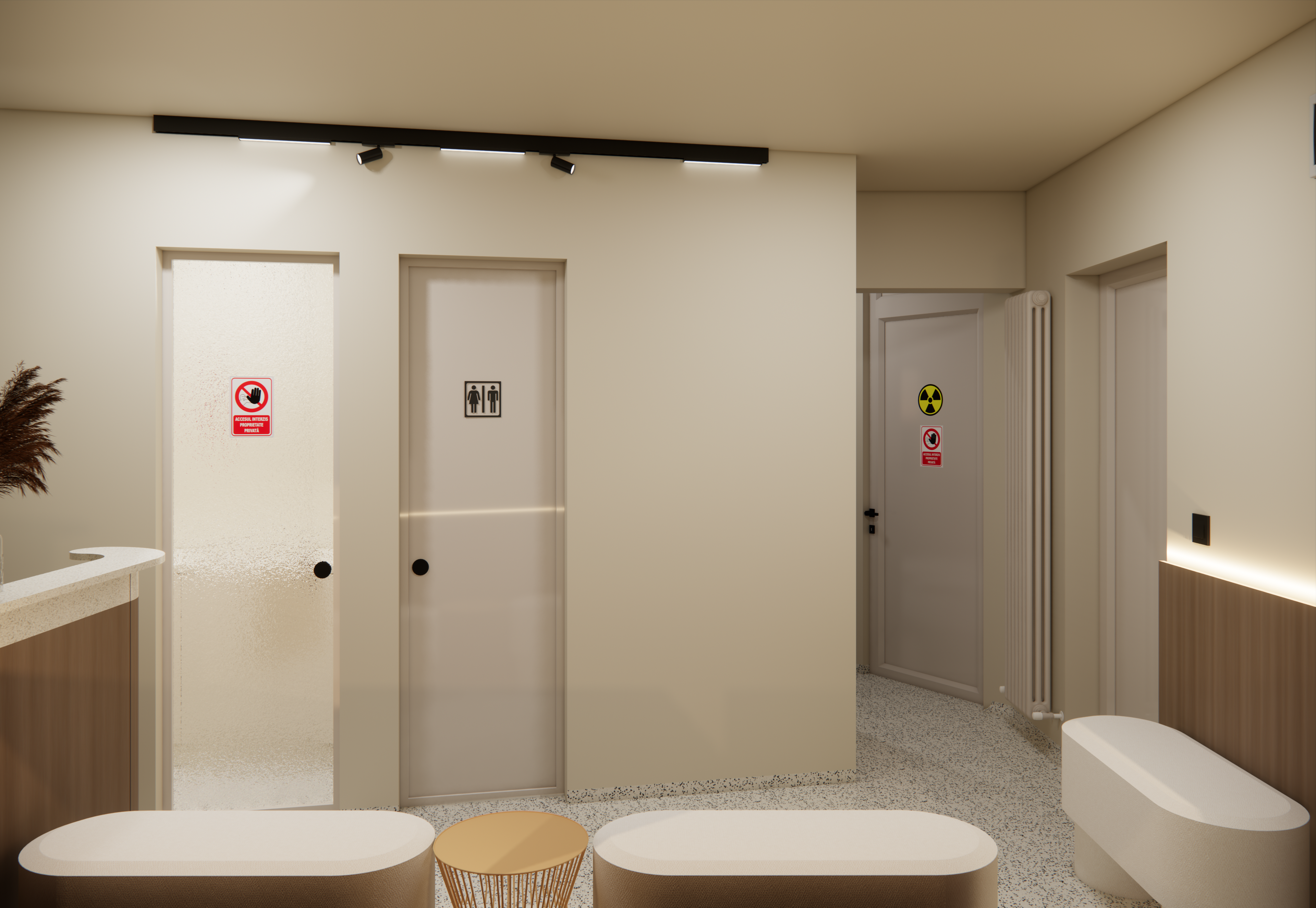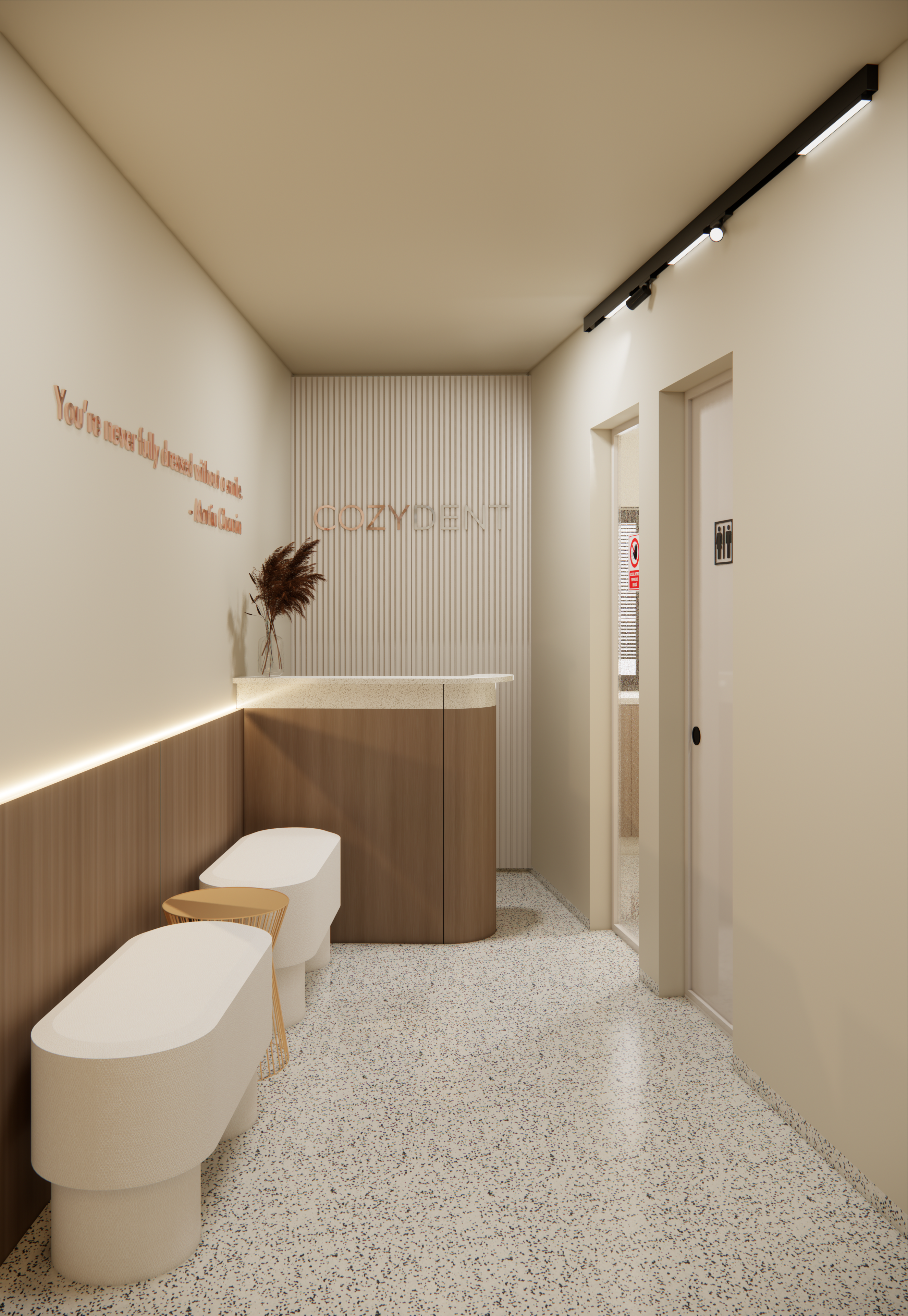 Texturile fine și nuanțele naturale conturează un cadru armonios, unde eleganța discretă se îmbină cu funcționalitatea. Lumina atent dozată evidențiază fiecare detaliu, transformând spațiul într-un loc primitor și relaxant, ideal pentru o experiență stomatologică lipsită de stres.